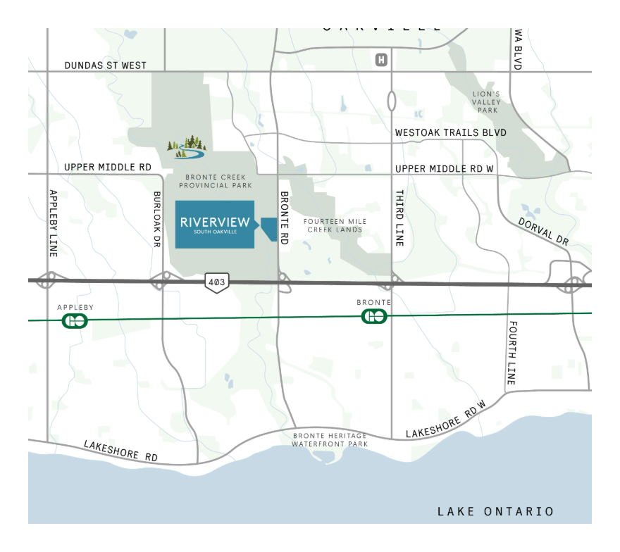 -Riverview Towns 位于 Oakville 高端社区的Upper Middle Rd W & Bronte Rd ,紧邻自然保护区,主打低密度生态居住环境。社区融合自然与便利交通,适合追求品质生活与长期自住的家庭。
