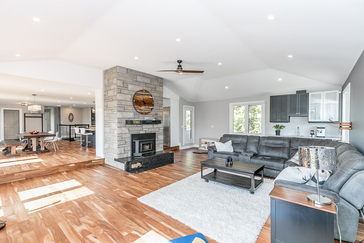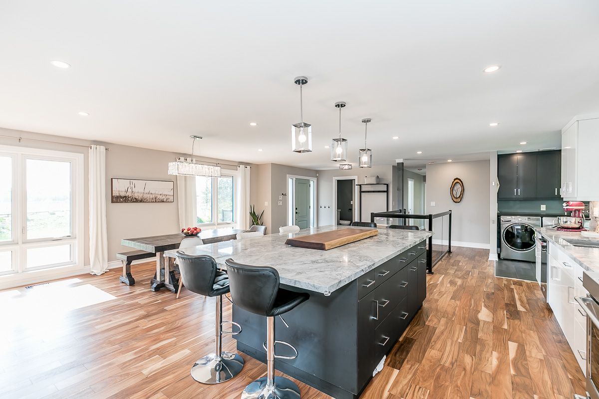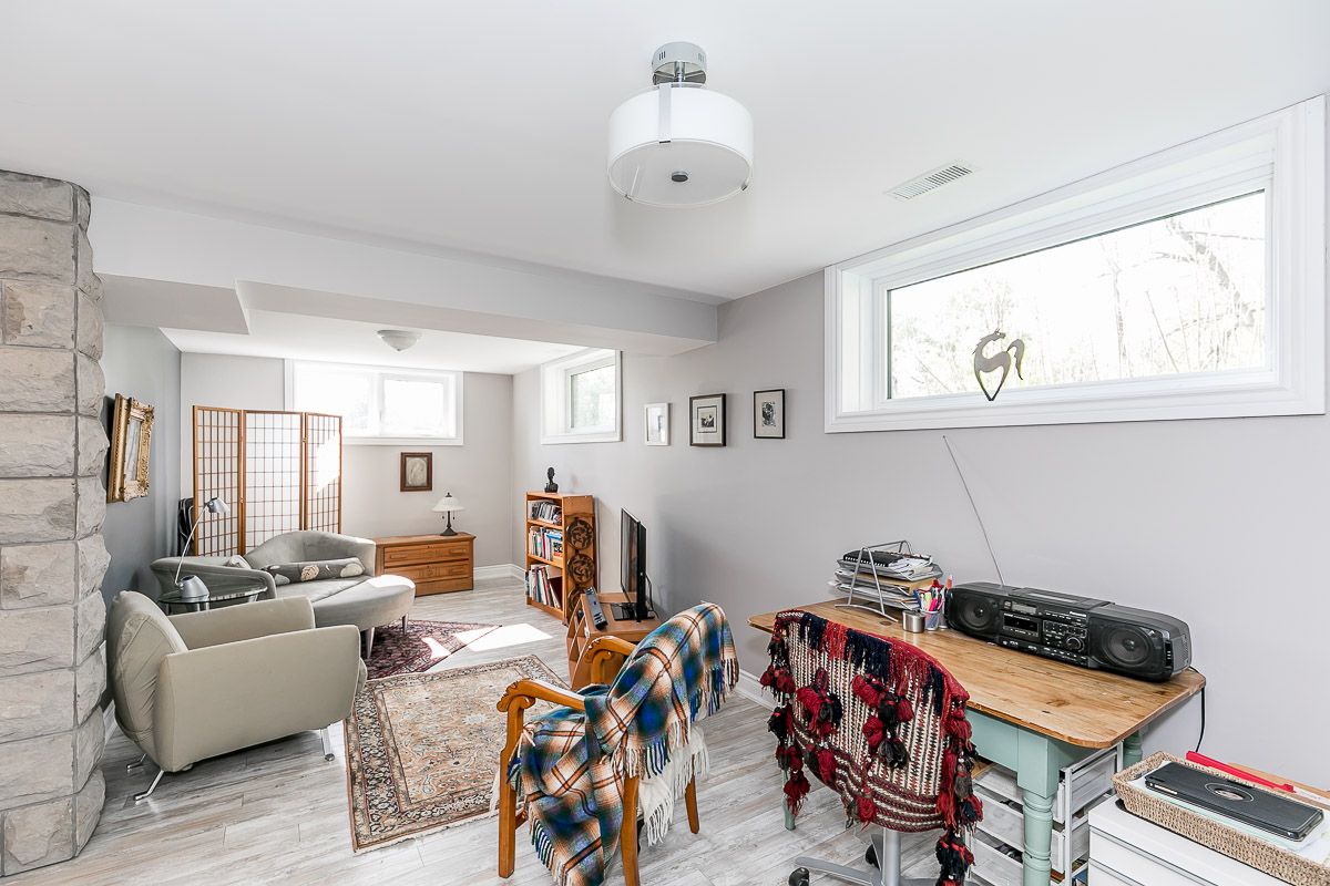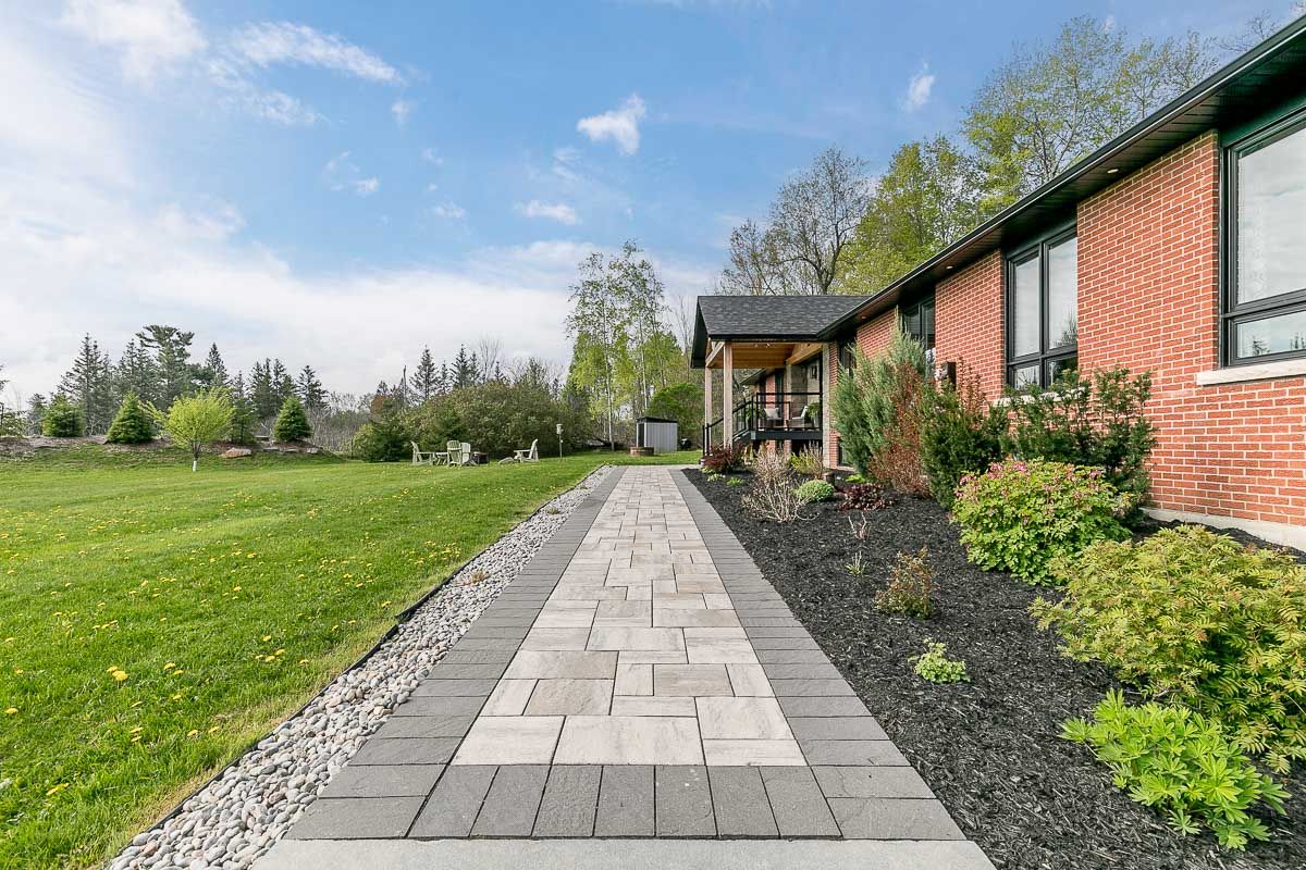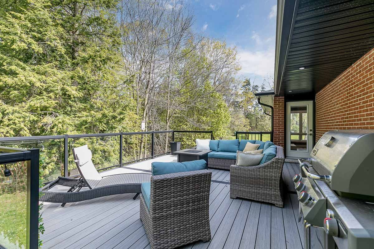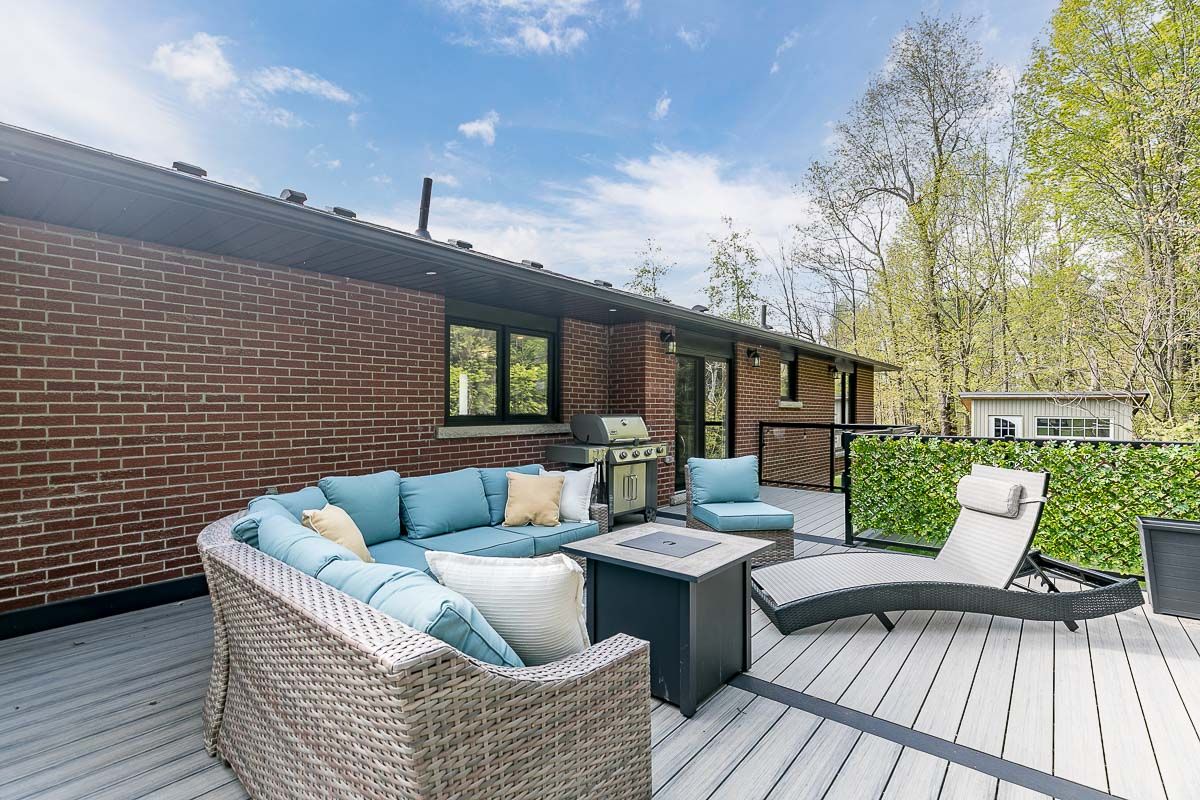 Set on 1.4 acres just North of King Township and close to highway 9 this stunningly renovated 3+2 bedroom bungalow with in-law suite. Follow the newly paved drive and interlock walkway to the timber frame and stone entrance. Designer chosen finishings are perfect for this country chic home. Open concept kitchen and dining room area with tons of cupboard space and a large island with a breakfast bar flows through to the living room with floor to ceiling stone fireplace and cappuccino bar. Walkout to the deck and relax in the peacefulness of your own private backyard. Four tastefully refinished bathrooms and all bedrooms are a great size. Lower level access to in-law suite is framed through mudroom. Lower level has 2 bedrooms, bathroom and ensuite laundry.Triple paned black frame windows, new doors and hardscapes are just a few of the items completed recently. Back deck overlooking lush forest with trilliums scattered throughout.