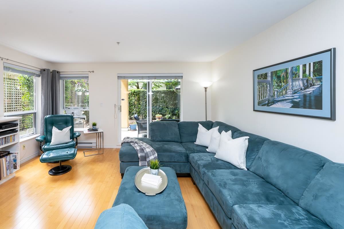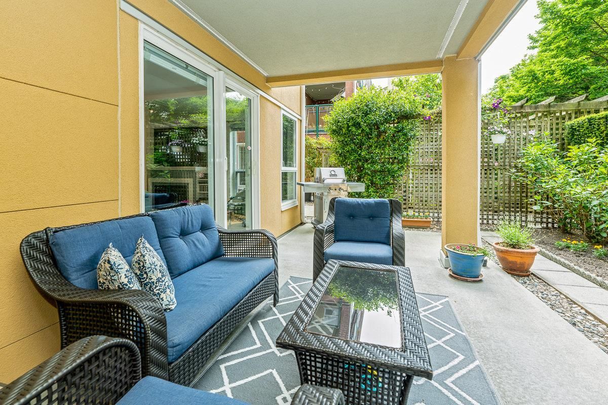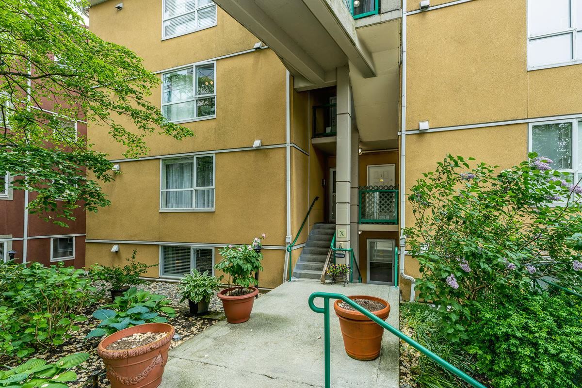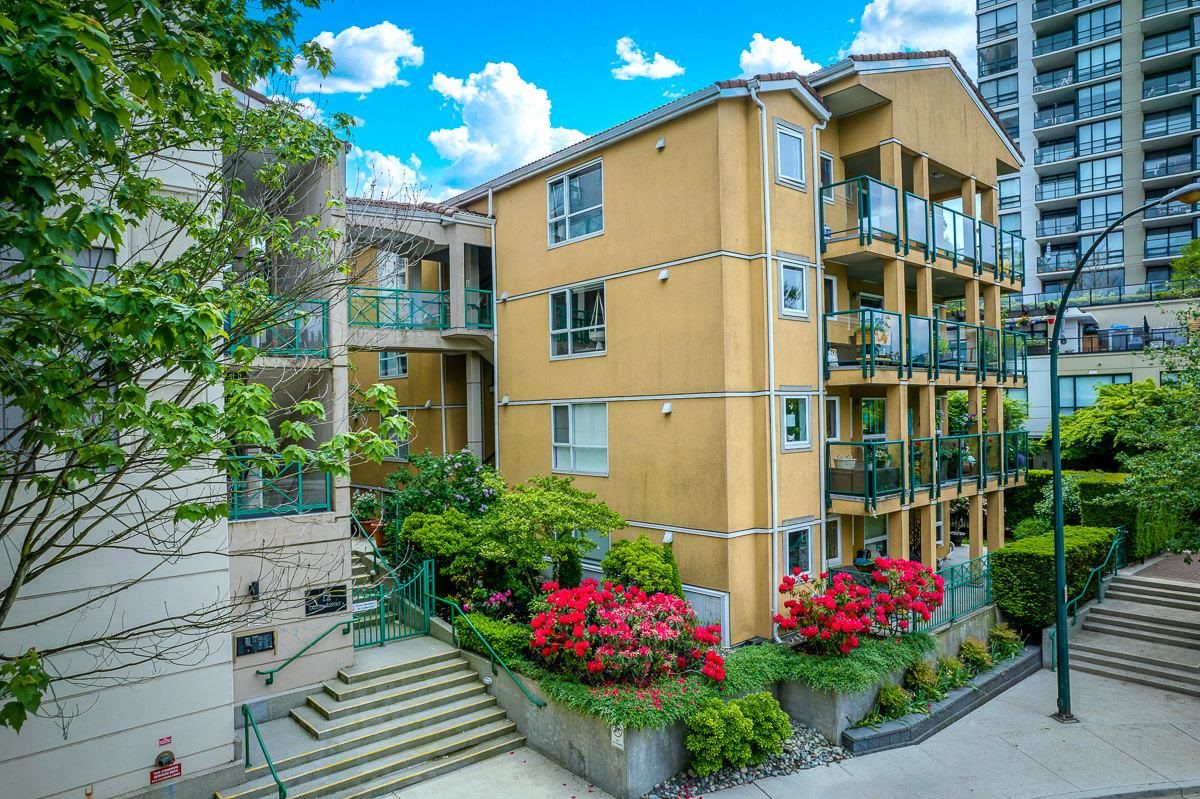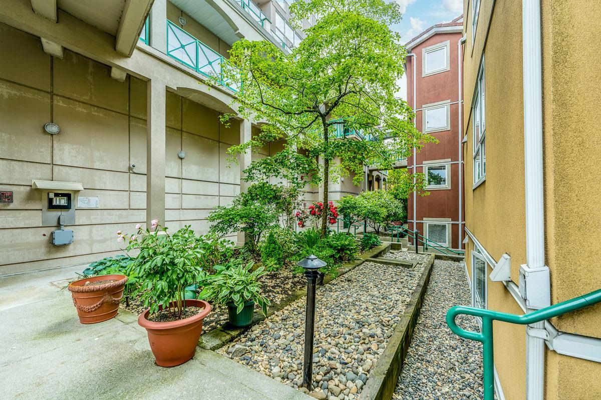 STUNNING 2 bdrm 2 bthrm condo w/ over 1200 sqft, this spacious unit offers a fantastic layout & own separate entrance, truly making it feel like a house! The real highlight is the BEAUTIFUL private patio that awaits you, providing an oasis for gardening, BBQ'ing & entertaining. Come & discover a thoughtfully renovated interior that exudes elegance. HW flooring sets a warm & inviting tone throughout, while the incredible bthrms showcase stylish design & high-quality finishes. Kitchen is a chef's dream, featuring S/S appliances, ample counter space, LARGE pantry & an office nook. Excellent building recently re-piped, new fire panel, rain screened, fully equipped gym, secure visitor parking, resident caretaker. 2 Pets OK! Close to Boardwalk, Quayside Market, Parks, Skytrain, Transit!