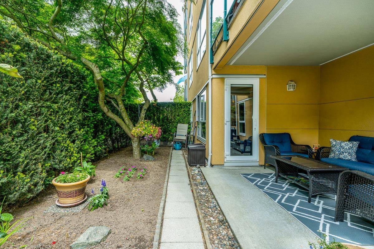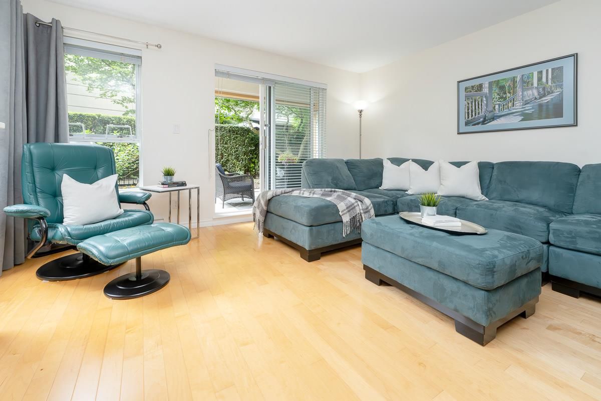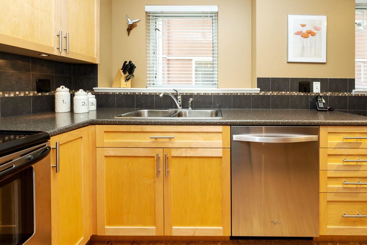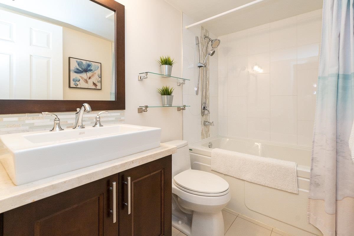 STUNNING 2 bdrm 2 bthrm condo w/ over 1200 sqft, this spacious unit offers a fantastic layout & own separate entrance, truly making it feel like a house! The real highlight is the BEAUTIFUL private patio that awaits you, providing an oasis for gardening, BBQ'ing & entertaining. Come & discover a thoughtfully renovated interior that exudes elegance. HW flooring sets a warm & inviting tone throughout, while the incredible bthrms showcase stylish design & high-quality finishes. Kitchen is a chef's dream, featuring S/S appliances, ample counter space, LARGE pantry & an office nook. Excellent building recently re-piped, new fire panel, rain screened, fully equipped gym, secure visitor parking, resident caretaker. 2 Pets OK! Close to Boardwalk, Quayside Market, Parks, Skytrain, Transit!