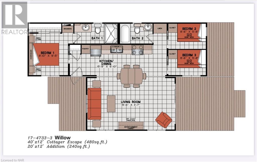 Welcome to Vineridge Resort, a most sought-after vacation community in beautiful Niagara-on-the-Lake. The resort is open from May 1 to October 31, where you are able to enjoy spring, summer and fall in this beautiful, tranquil setting. The Willow is the largest cottage on the resort and with 3 bedrooms and 2 bathrooms this cottage has ample space for the whole family! It comes complete with central A/C and furnace, all appliances, furniture, beds/sofa bed, window coverings, and these extras: TV with antenna, patio table and chairs and BBQ. This unit also includes a transferable extended warranty valid into 2024! The annual management fee includes water/sewage, electricity, unlimited use of all resort facilities for you and your family, including the heated inground pool, tennis/basketball court, picnic areas, playground, volleyball, WIFI in the Welcome Centre, Kids Club and the many scheduled activities and events planned throughout the season. Also included is lawn maintenance and garbage removal. Owners pay for their own propane and insurance. The annual resort fees for 2023 are FULLY PAID for this season, a $7,990 savings!! You'll be close to Niagara Falls, Niagara-On-The-Lake Old Town, hiking, cycling, the Niagara River Parkway trail, golfing, award winning wineries, incredible restaurants, shopping and the Niagara outlet mall. All offers welcome! (id:22211)