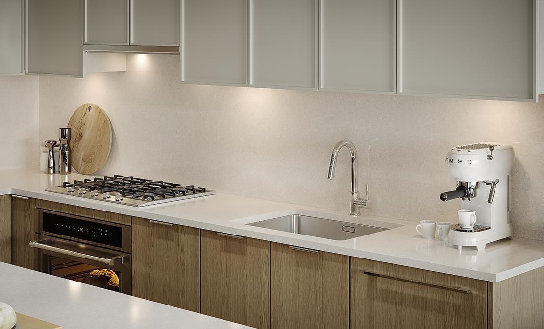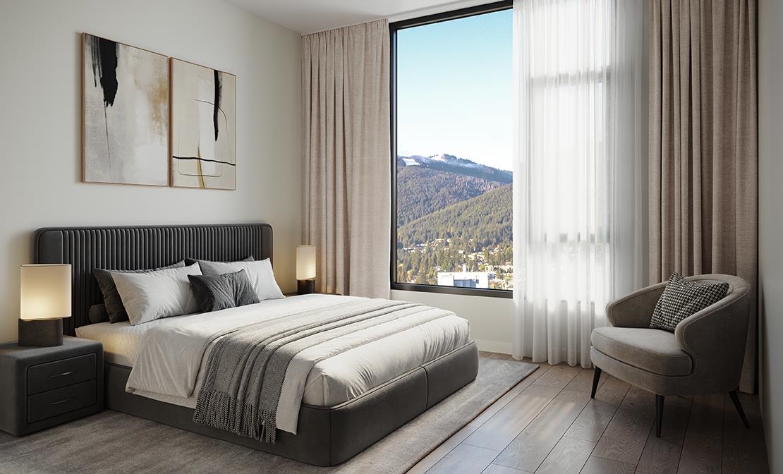 Live in a new concrete apartment residence at Elle, Polygon's boutique collection of 1, 2 and 3 bedroom homes in North Vancouver. This bright 1 bedroom, 1 bath 678 sq. ft. home boasts overheight ceilings in main living areas, warm engineered wood flooring, and a deck off the living room. The kitchen features integrated appliances, engineered stone countertops, full-height engineered stone backsplash and a large central island with overhang - designed for entertaining. Enjoy a spa-inspired bathroom with porcelain tile flooring and shower with bench. Plus, enjoy access to a private terrace with integrated seating and firepit!