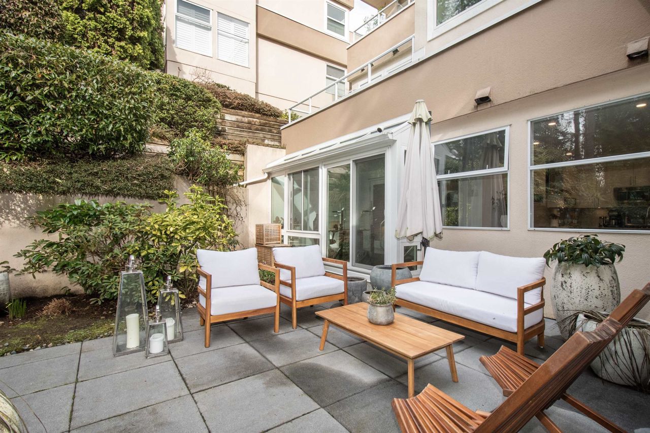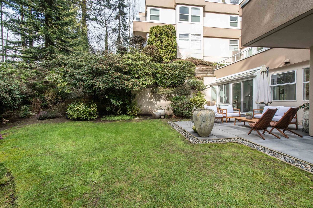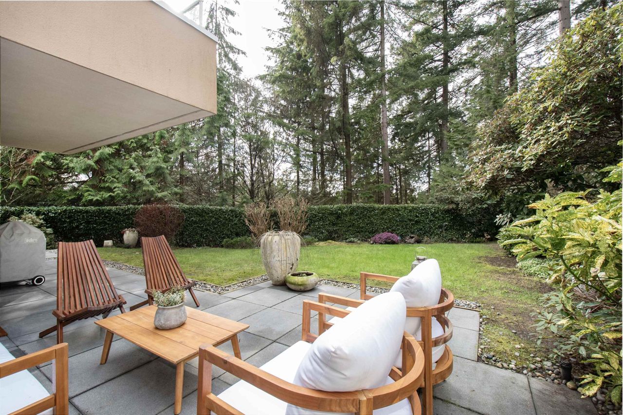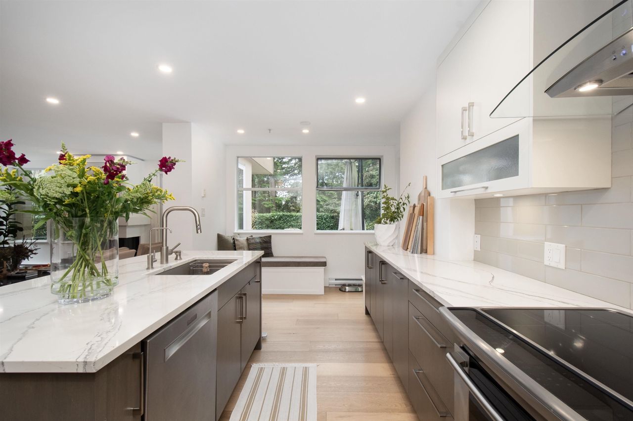 It's rare to find a one-level townhouse, especially one made of concrete! With over 1,953 Sq Ft of interior space renovated in 2018/2023 and an ample patio space leading out to a private lawn and garden. The unit has two bedrooms and a large den/bedroom with an ensuite. Features include a chef-style kitchen, hardwood throughout, a walkout patio, three parking stalls, a natural gas fireplace, and more! Located just a stone's throw from all the shops of Edgemont Village, Delbrook Rec Centre, great trails, and inside the Highlands Elementary School catchment, this is the perfect location for families and downsizers! This is a must-see townhouse!