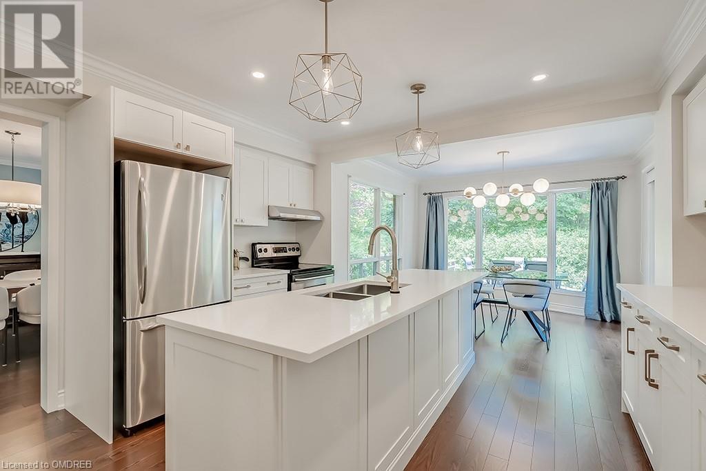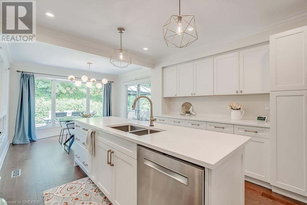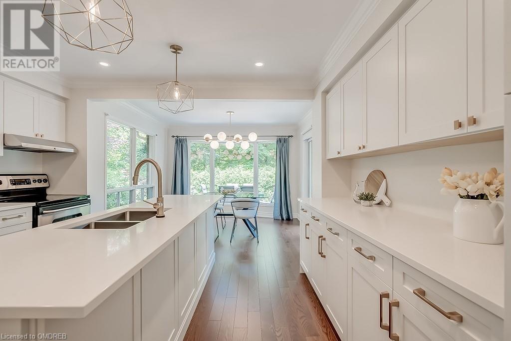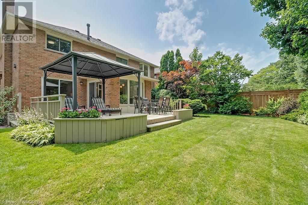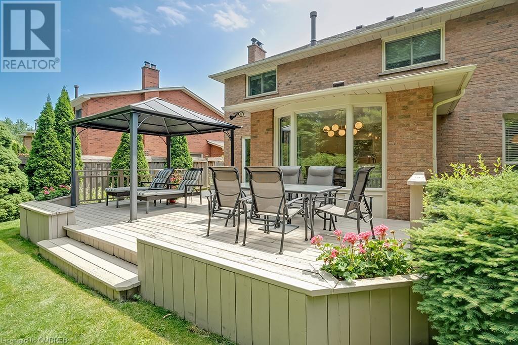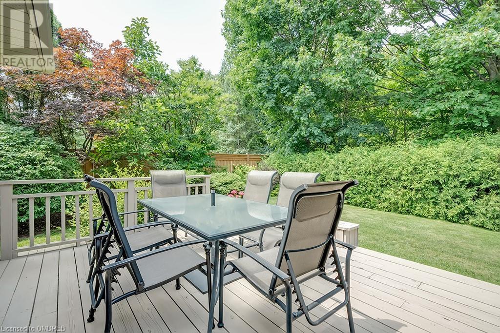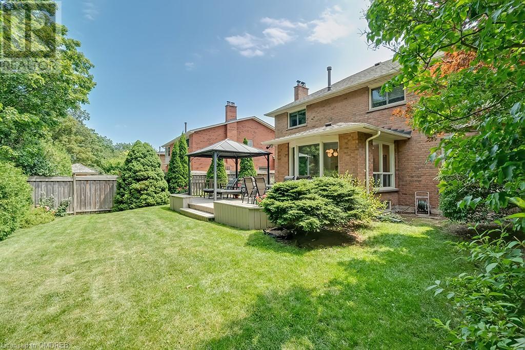 Imagine sitting in your private backyard on the deck with view of trees!! A Prime address on a pool-size wooded lush ravine lot in the heart of Glen Abbey. Spacious, elegant & updated home with a traditional floor plan is waiting for a new family to enjoy highly-rated schools, the Glen Abbey Golf Club, & all the family adventures this community has to offer. Experience a spacious elegant vibe the moment you step into the separate vestibule & view the grand entrance hall with an impressive staircase. Formal entertaining will be a breeze in the bright living room & adjoining dining room with crown mouldings & hardwood floors. The gorgeous renovated Aya white kitchen will inspire the resident chef with an island, breakfast bar, quartz counters, pot lights, stainless steel appliances & breakfast room with W/O to the deck & private rear yard. Stoke up a crackling fire in winter or W/O to the deck in summer from the family room. Laundry room with inside entry to the garage & a beautifully renovated powder room. Upstairs you will find 4 bedrooms & 2 full bathrooms. Primary bedroom offers a 4-piece ensuite bath with a soaker tub & separate shower. Recent improvements - Vintage ¾” solid hardwood floors, renovated kitchen (2022), foyer tiles (2020), roof re-shingled, powder room renovation, left side of fence replaced (2021), new air conditioner (2022) & most lighting replaced (’20-’23). Newer front entry door system & most windows except bay window in ensuite & windows in basement and living room. Extensive crown mouldings & hardwood floors on main floor, upper hall & primary bedroom. A 5-minute drive to hospital & GO Station, 2-minutes to QEW. A Must See! (id:22211)