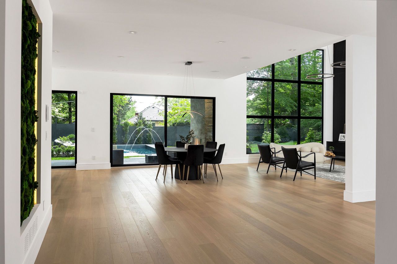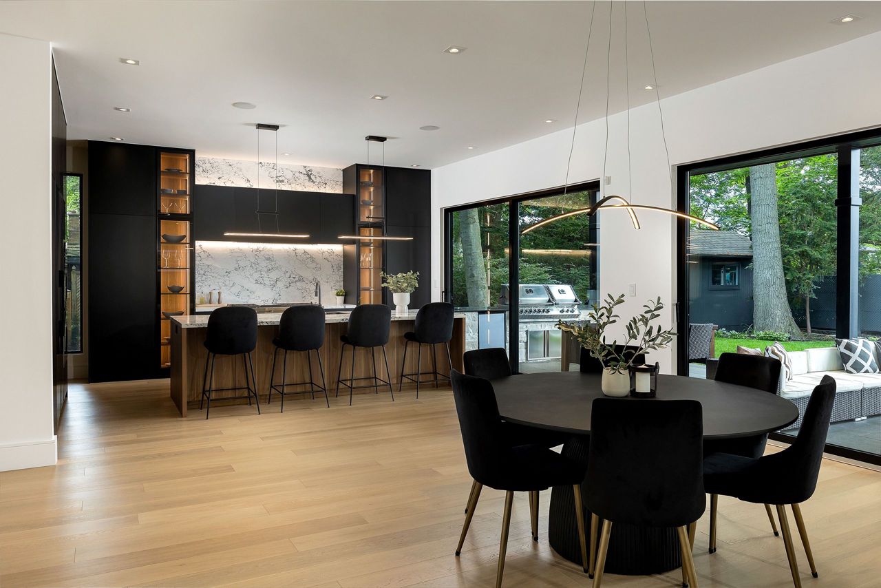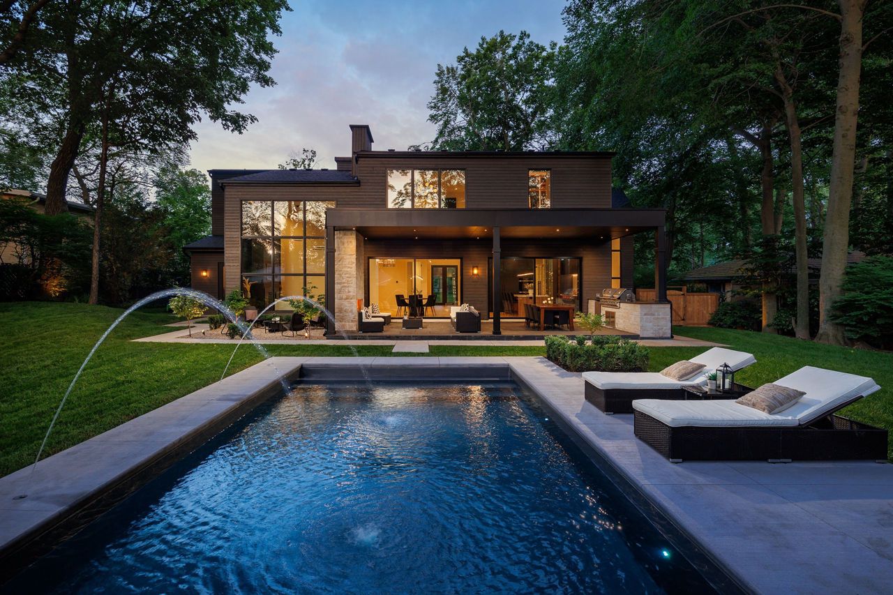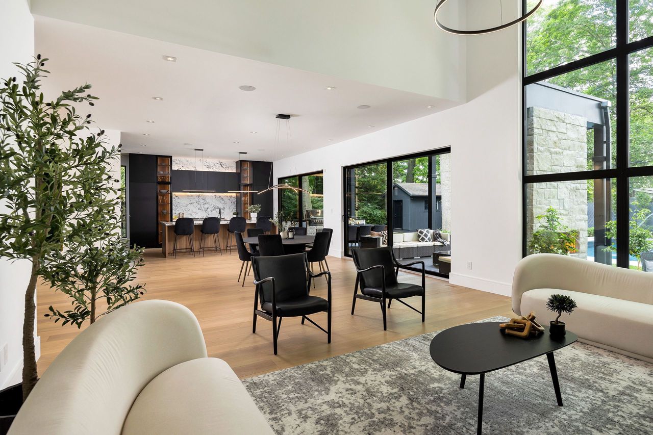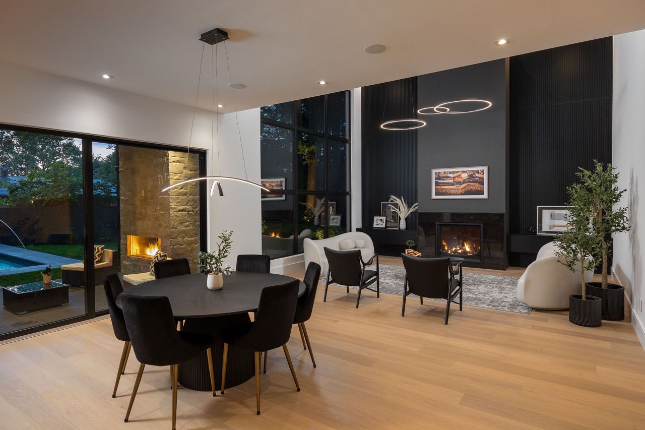 Welcome to a captivating living experience that transcends the ordinary! Newly custom-built residence offering over 7,450 sq ft of curated living space magnificently set on a 100 x 150 manicured lot with pool and triple car garage. This 4+1 bedroom, 6.1 bath home exudes elegance and refinement. The interplay of textures, materials, thoughtful finishes and detailing makes every room a showcase of modern luxury. At the heart of the home is the open concept kitchen featuring oversized commercial grade appliances with double oven, with a fully equipped hidden pantry room like none other. Finely crafted full height seamless cabinetry and a large quartz island make for an ideal entertainment space. The kitchen flows through the generous breakfast room into a light filled great room with 16 ft floor to ceiling windows and numerous sliders. Perhaps one of the most special features of this home is the stunning dining room located in a private wing adorned with a wine feature-wall, 16 ft ceiling, dedicated servery and expansive windows. The upper level offers a private double door entry to the primary suite. 5-piece en-suite with heated large format, porcelain tiles, curbless shower and freestanding bathtub. The walk-in closet featuring custom floor to ceiling seamless cabinetry with integrated lighting and smoked glass display shelving. 3 large bedrooms with walk-in closets and en-suites. A spacious laundry room with task sink and plenty of storage completes this floor. A sophisticated lower level with Radiant heat floors, oversized walk-up, bedroom with en-suite glass framed gym, steam shower, sauna, wet bar with all the fixings & a plush private theatre. Thoughtfully appointed outdoor living spaces including a covered porch with double sided fireplace, outdoor kitchen with large built in BBQ and salt water pool with 2 deck fountains. And exceptionally tasteful home with timeless modern appointments rooted in function, good taste, and expert craftsmanship.