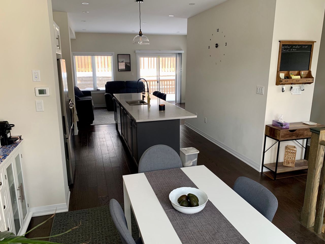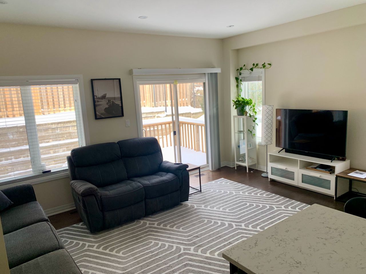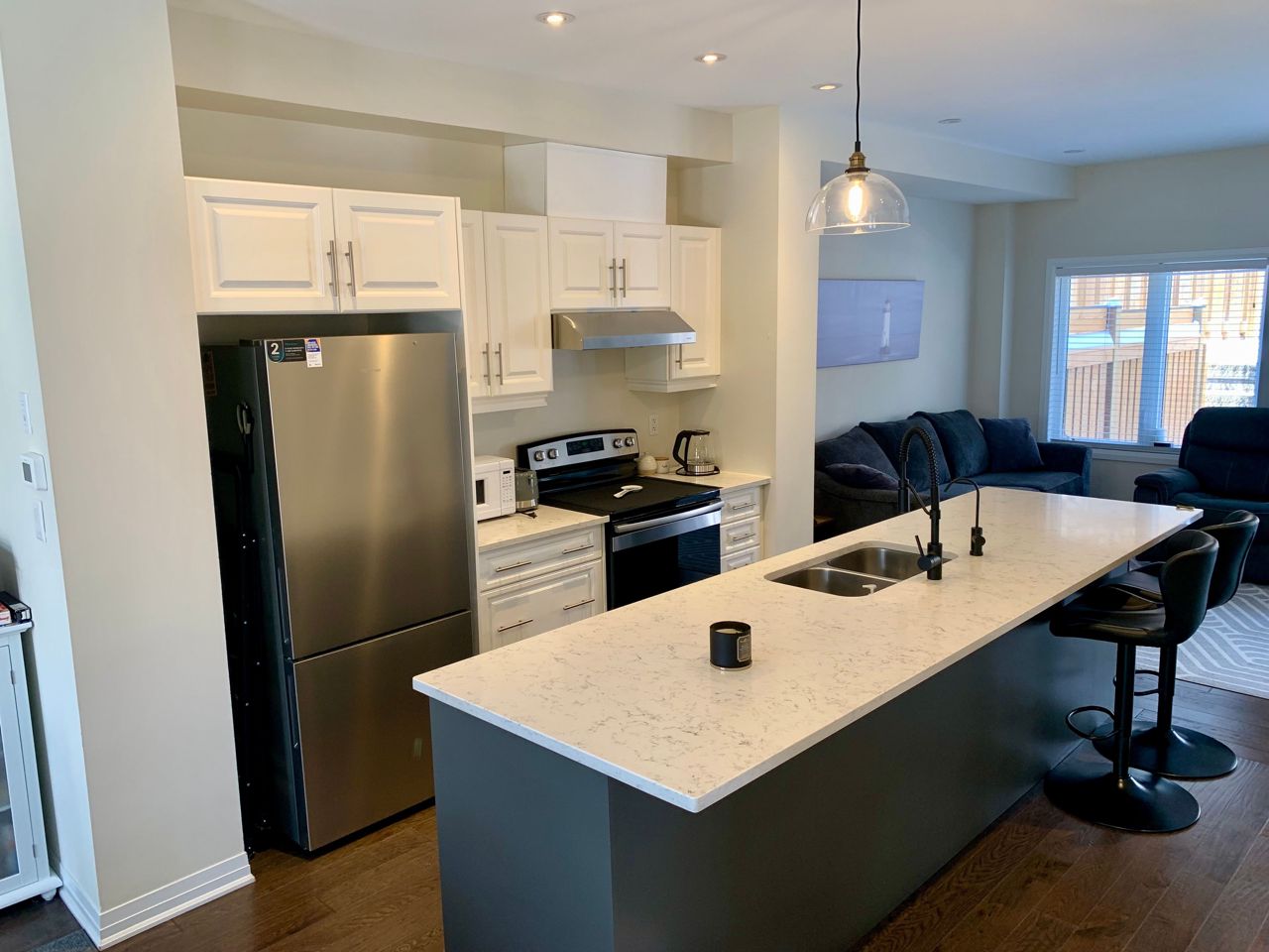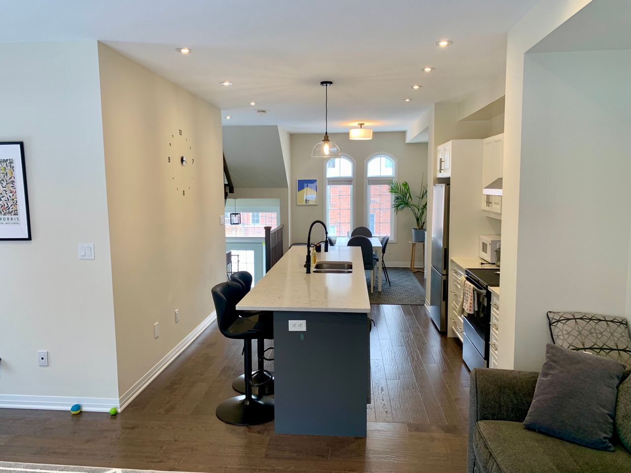 Beautiful 2 storey end unit townhome is located in a prime downtown location, offering both comfort and convenience. Nicely located in quiet area with very private fenced backyard. One of the largest lots in the neighbourhood. Main level showcases stunning hardwood flooring that radiates warmth and elegance, complemented by plenty of pot lights that fill the area with light, enhancing the contemporary atmosphere. The heart of the home is the gourmet kitchen, with water treatment system complete with a center island featuring a breakfast bar and quartz counters, the perfect spot for casual dining or entertaining guests. This open layout seamlessly connects the kitchen to the Dining Room and Living Room with walk-out to backyard, creating a roomy and inclusive space for entertaining family and friends. Ascend to the upper level with upgraded Berber carpet where there are 3 bedrooms including the primary bedroom with spa like 3 piece ensuite. These well-appointed rooms offer comfort and privacy, making them perfect for a growing family or accommodating overnight guests. The completely finished lower level provides extra living area with direct entry to the garage, making it an ideal space for a home office setup or family rec room.