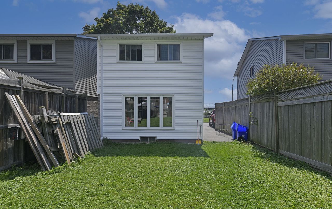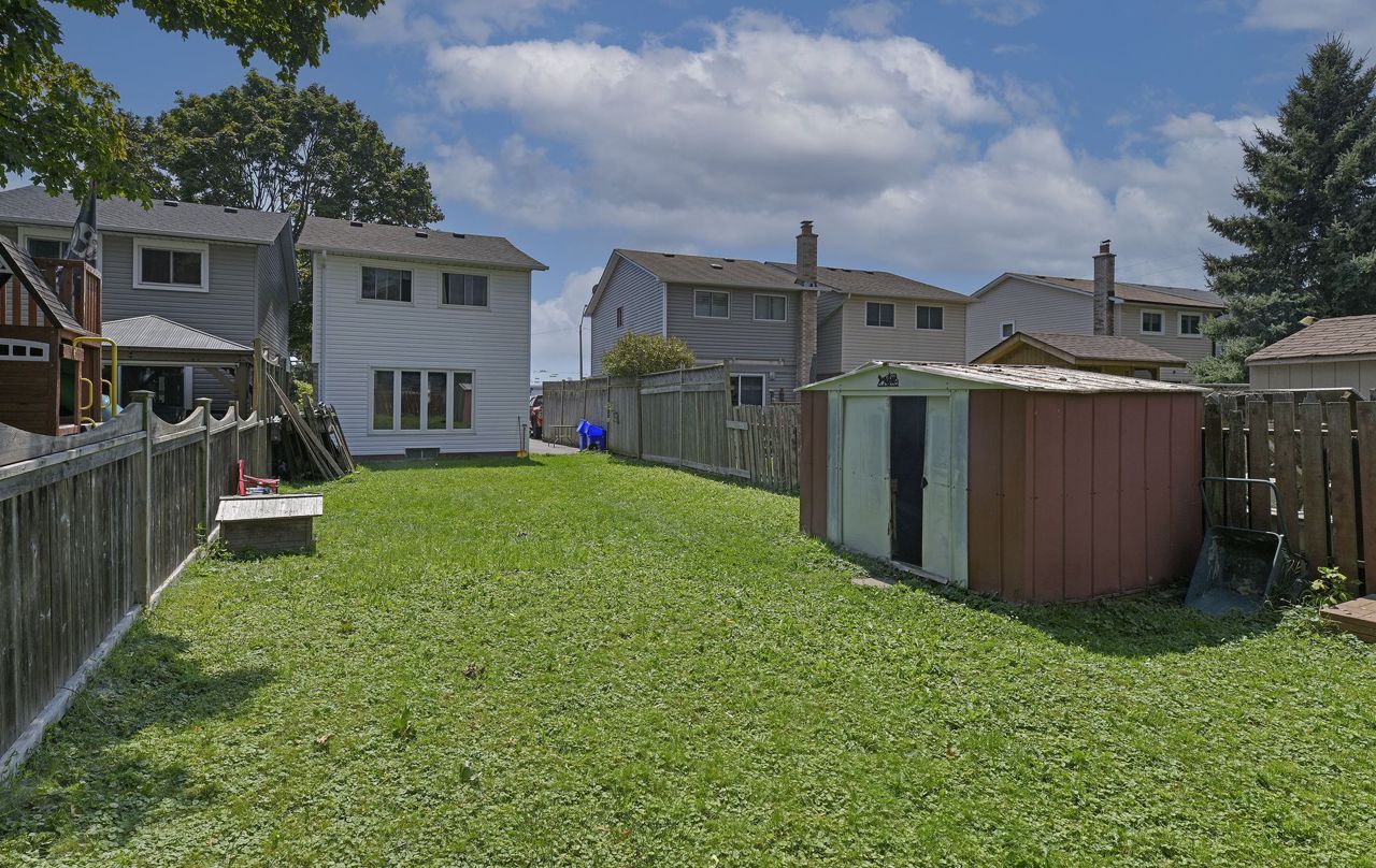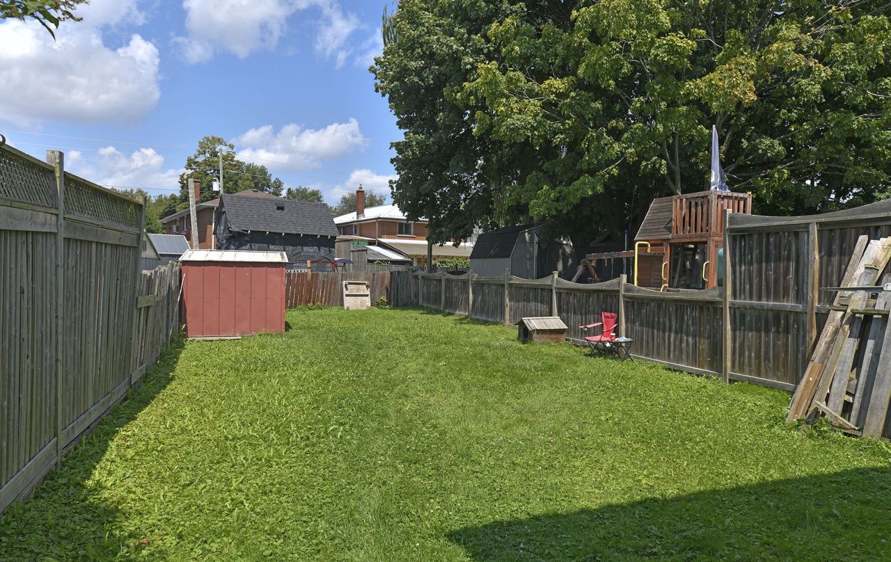 Offers Anytime! Great starter home located close to lake, 401, schools, parks, public transit and shopping. Main floor features a large eat-in kitchen with ample cupboards and counter space. Separate dining area. Living room with huge window provides lots of natural light. Side entrance to yard. Upstairs has 3 spacious bedrooms, all with large closets and a good sized 4 piece washroom. Laminate flooring on main floor and second floor. Full unfinished basement ready for your finishing touches. Extra deep rear yard with storage shed.Laminate flooring on main and second floor installed in 2019. Electric baseboard heaters installed in 2019. Roof re-shingled and vents installed in 2022. Windows and exterior doors installed in 2019. Driveway redone in 2020.