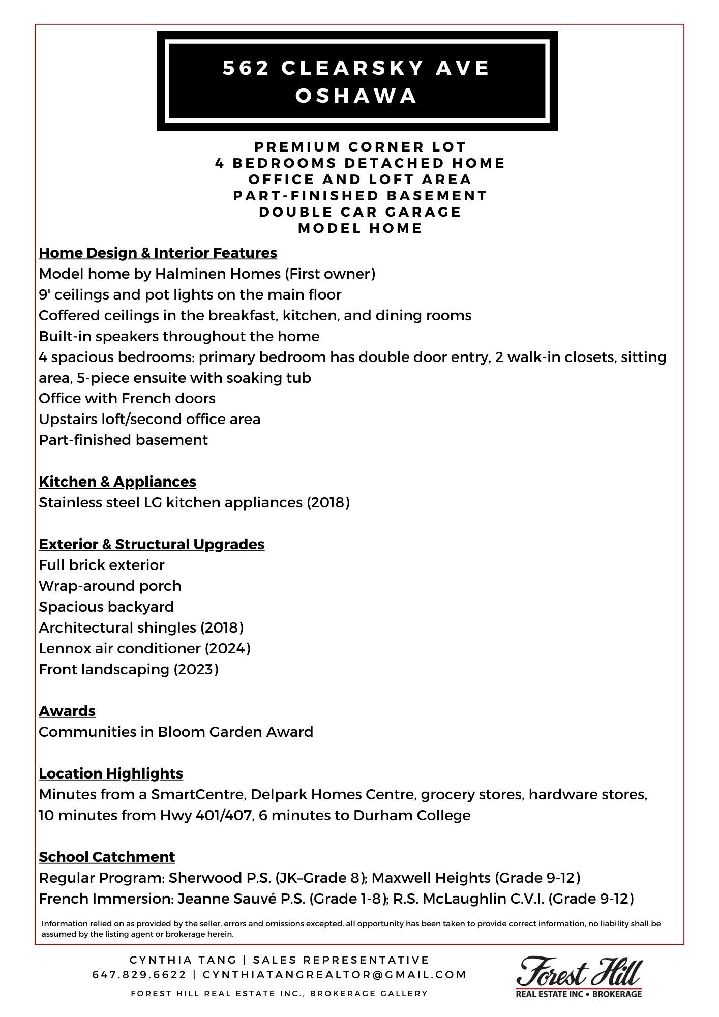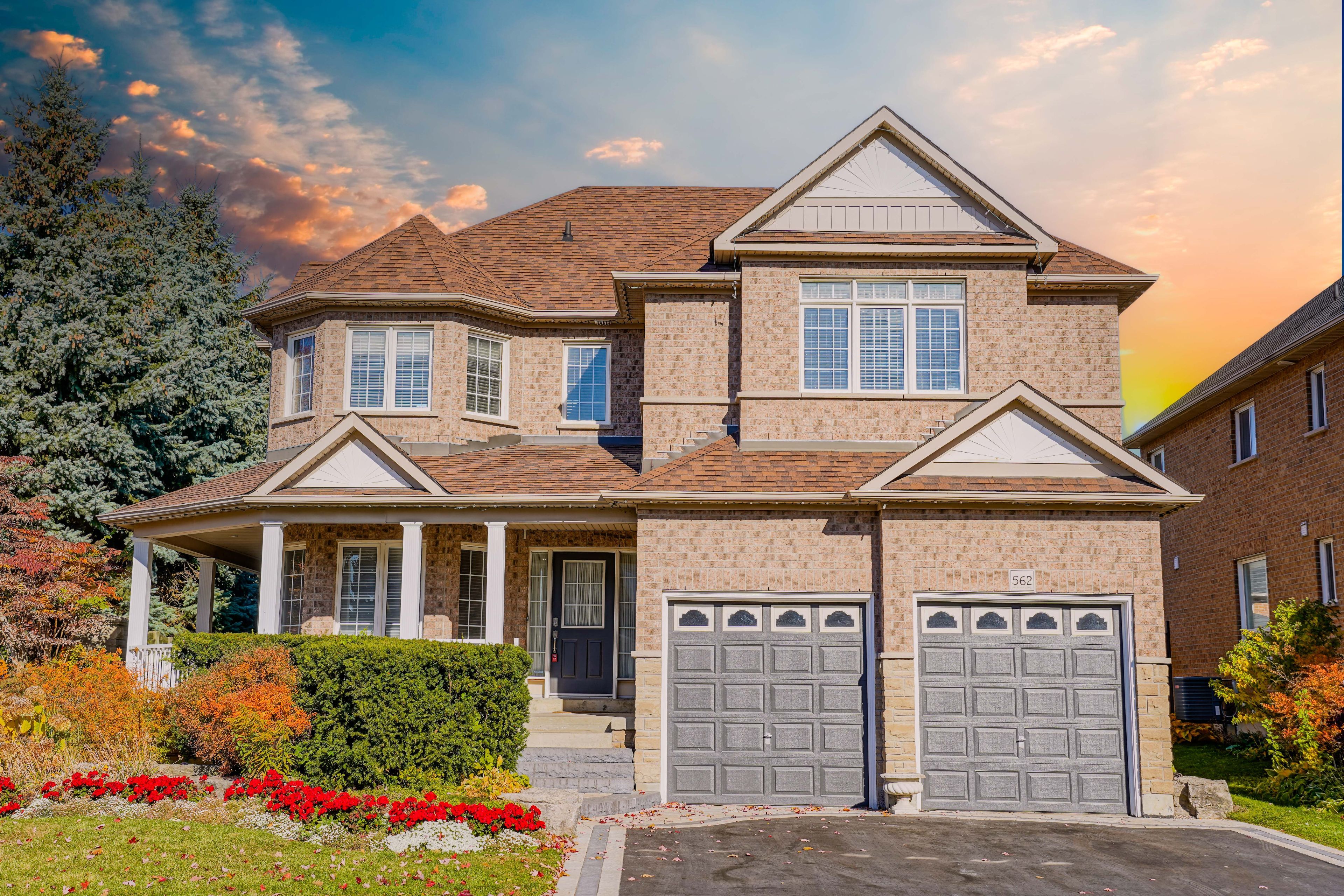 Welcome to 562 Clearsky Ave in North Oshawa, a classic elegant model home by Award-winning Halminen Homes, perfect for those seeking luxury and convenience! This one-time owner gem situated on a premium corner lot, almost 3000 sqft of living space boasts 9' ceilings, pot lights, and elegant coffered ceilings in the kitchen, dining, and breakfast areas. With built-in speakers throughout, this home is designed for modern living. The primary bedroom is your personal retreat, featuring a double door entry, two walk-in closets, a sitting area and a luxurious 5-piece ensuite with a soaking tub. It also features 4 spacious bedrooms, a dedicated office with French doors, and an additional loft area perfect for a second office or cozy lounge, this home offers plenty of space for work and play with a part-finished basement. Enjoy cooking with stainless steel LG appliances (2018), relax on the charming wrap-around porch, and take pride in the award-winning garden. Located just minutes from a SmartCentre, Delpark Homes Centre, parks and within easy reach of highways 401/407, this home offers everything you need for comfortable, convenient living. School catchment: Regular program: Sherwood P.S (JK Grade 8); Maxwell Heights (Grade 9-12) French Immersion: Jeanne Sauve P.S (Grade 1-8); R.S. Maclaughlin C.V.I. (Grade 9-12) Don't miss your chance to call 562 Clearsky Ave home!Recent upgrades like the Lennox air conditioner (2024) and front landscaping (2023) make this home truly move-in ready!