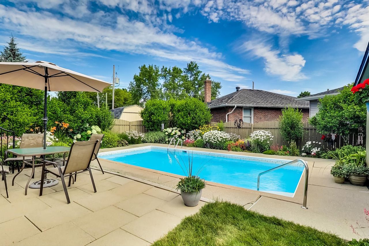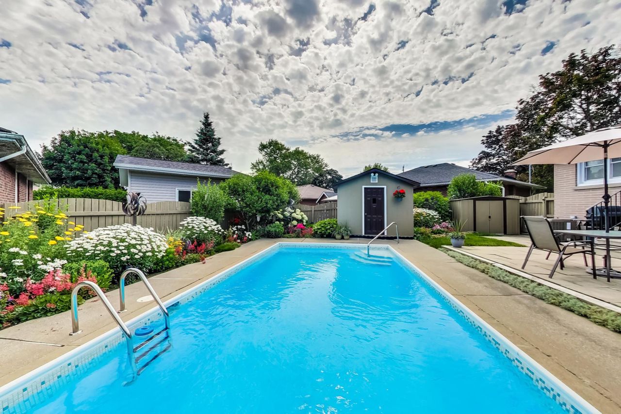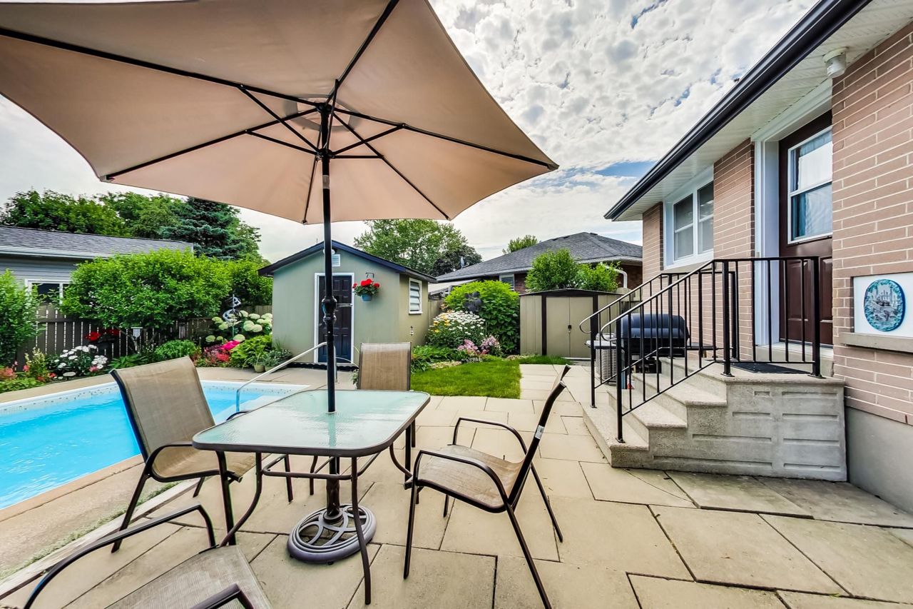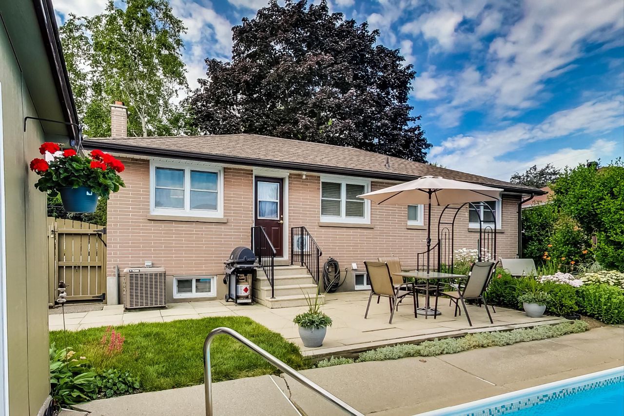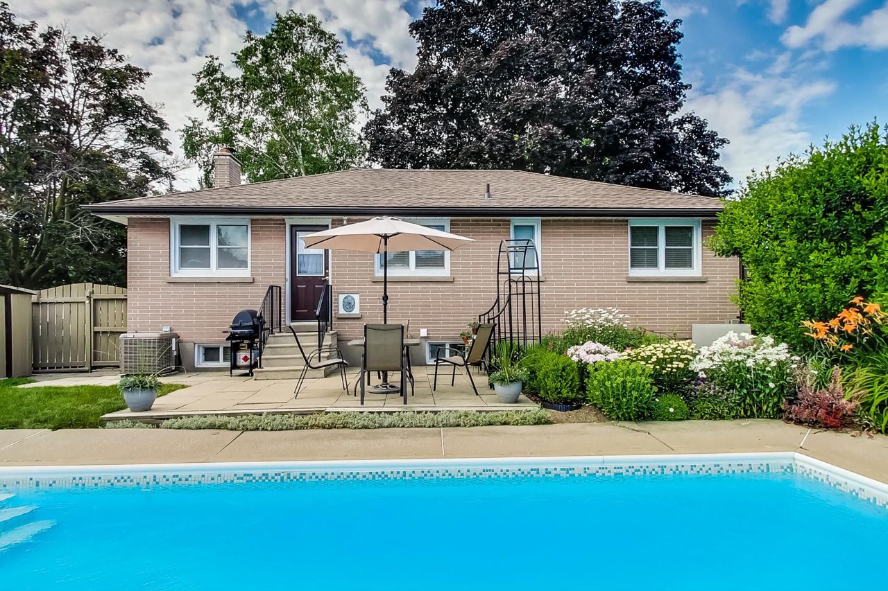 Bright & Spotless 3 bdrm bungalow tucked away in quiet mature neighbourhood. Meticulously cared for home with backyard oasis and inviting in-ground pool. Separate entrance to basement featuring Large L-shaped rec. room with retro bar, exercise area & workshop. Many recent updates including newer furnace 2022; central air (3 yrs old); Roof, soffit & eaves updated 2016 with lifetime transferable warranty (to one owner); new insulation 2016; vinyl windows & exterior doors replaced 2002, chimney rebuilt from roof up in 2015; HWT owned 2021, 2 garden sheds. Shows 10++Avg. monthly hydro approx. $290 (remember no gas bill)