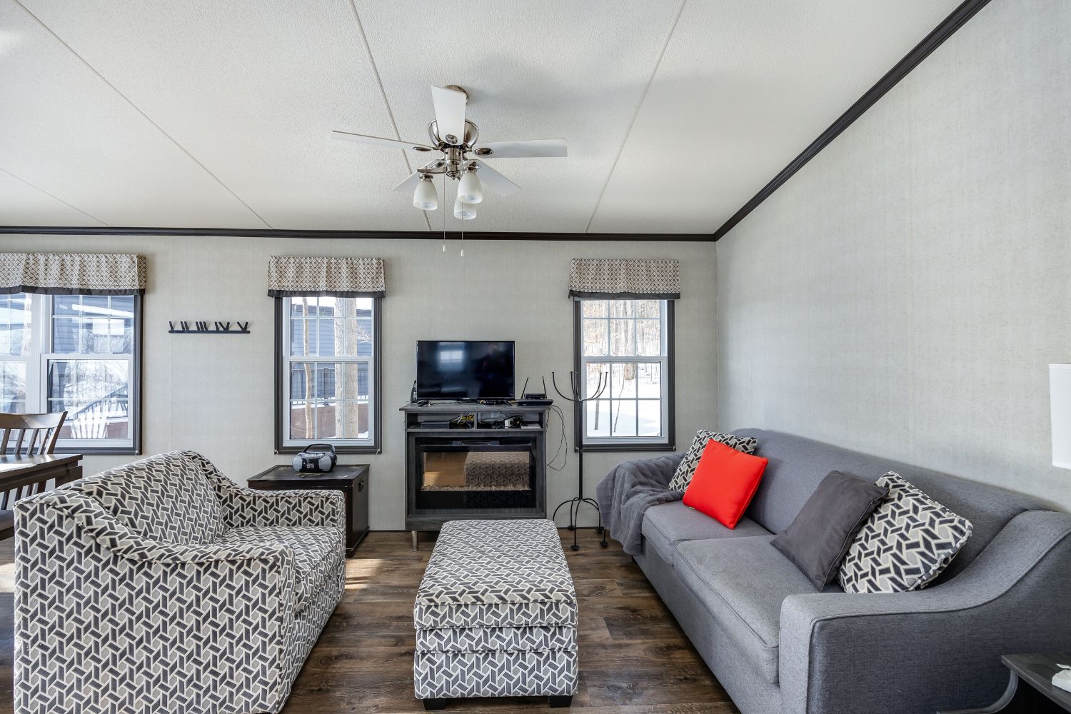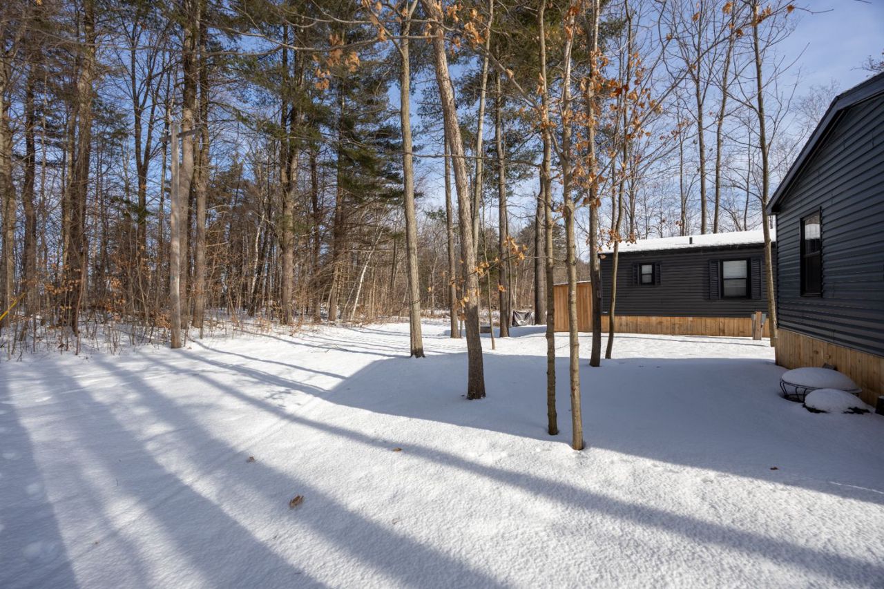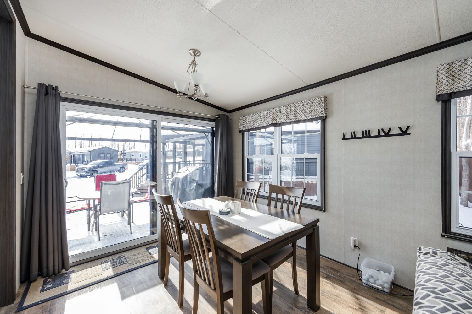 Welcome to 66 Cherry Hill Lane at Bellmere Winds Golf Resort on Rice Lake! Located on a prime dead-end lane, this Northlander Superior model offers 3 beds, 2 baths, and 800 sqft of open-concept living space. First occupied in 2021, this fully furnished, never-rented cottage features a primary bedroom with queen bed, ensuite bath and double closet, a second bedroom with closet, and a third bedroom with double bunk beds. The modern kitchen includes an island and full-size appliances, while the living/dining area boasts a fireplace, pull-out couch and walks-out to the patio. For comfort, this unit includes a propane furnace, AC, instant hot water tank, and outdoor heater. Enjoy privacy on a rare deep pie-shaped lot backing onto a wooded area, including new glass railings and an extended deck. Resort fees include six unlimited golf memberships and access to pools, a beach, amenities and resort activities. 2025 site fees are $10,875+HST. Owners winterized with the Carefree Platinum Package. **EXTRAS** Site fees include water, hydro, lawn, parking, amenities, and 6 golf memberships. Amenities: 18-hole golf overlooking Rice Lake, 2 pools, splashpad, beach, resort activities. Boat slips extra charge. Internet available. Pet friendly.