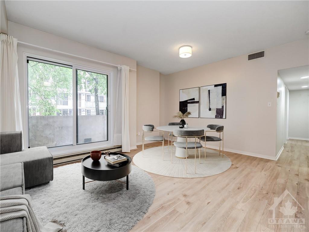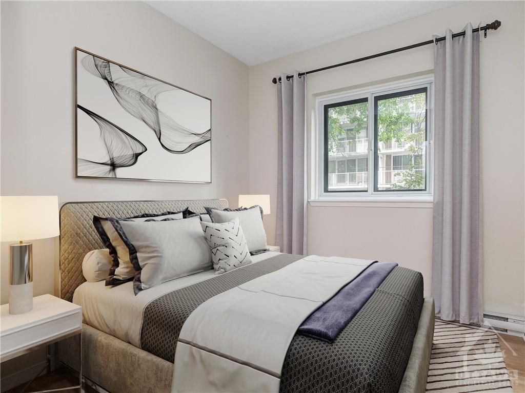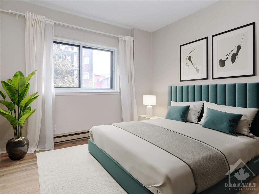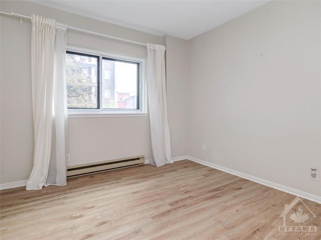 Located in one of Ottawa's premium addresses in the heart of the bustling business district with a walk score of 100, this 815 sq.ft 2bed/1bath condo with 2 underground parking spots is the perfect fit for any urbanite looking to take advantage of everything the Nation's Capital has to offer. Bright and airy open-concept main living area with patio doors leading to oversized south-facing balcony with views of the St Patrick Basilica. Renovated eat-in kitchen with white cabinetry, stainless steel appliances and sight lines of living space. Spacious primary bedroom with wall-to-wall closets. Generous secondary bedroom. Updated full-bath with soaker tub. Ample storage in utility closet. In-unit laundry. Storage locker included. Kent Towers features 24h security, indoor pool, sauna, gym, and party room. Parking spot leased indefinitely from condo corp. Some pictures virtually staged. Hydro $100/month. Quick closing available. Steps to LRT, Parliament Hill, Lebreton Flats, and Canal!