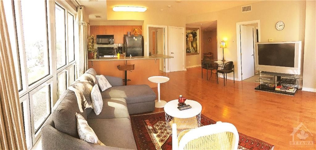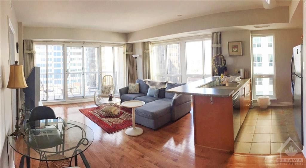 Executive corner 2 bedroom & 2 bathroom condo (double suites) Huge window on both sides, hardwood floor throughout, 9' ceiling, northern exposure overlooking the Byward Market & Gatineau hills. Insuite laundry, smart toilets, newer upgraded washer and dryer, owned large underground parking with storage, best balcony to watch fireworks 8000 sqft rec center, indoor pool, sauna, 2 fitness, movie theatre, party room, 24hrs security, walk to everythingFridge stove washer dryer and dishwasher are included. All furniture and other appliances are negotiable.