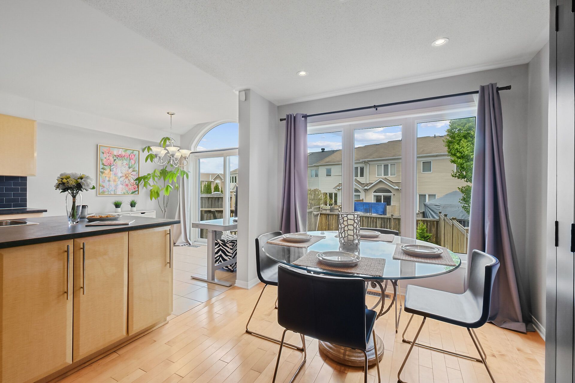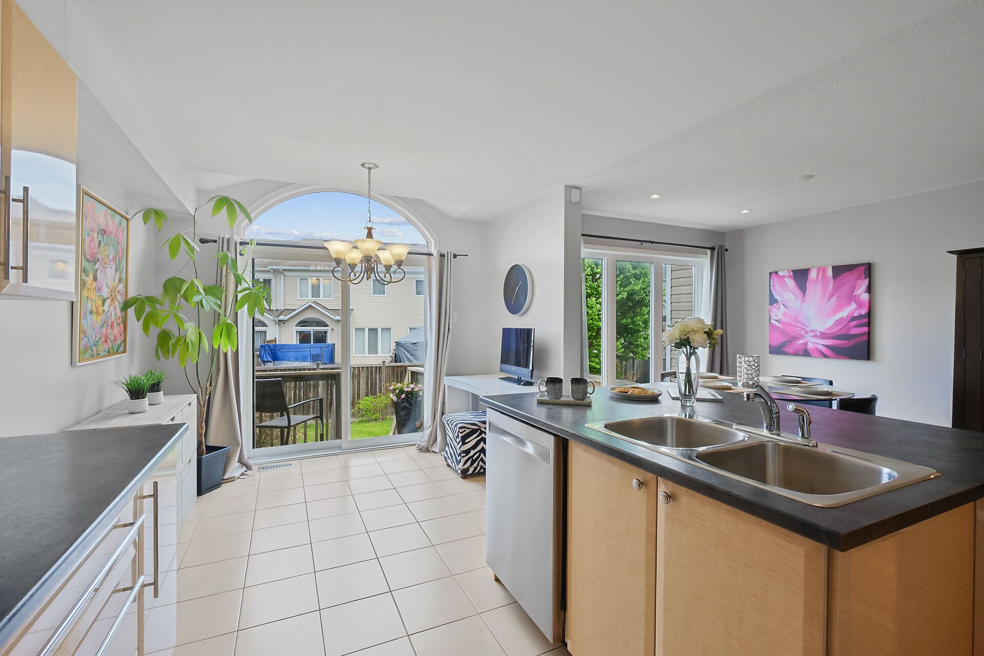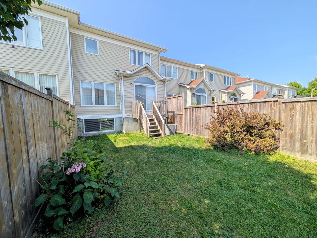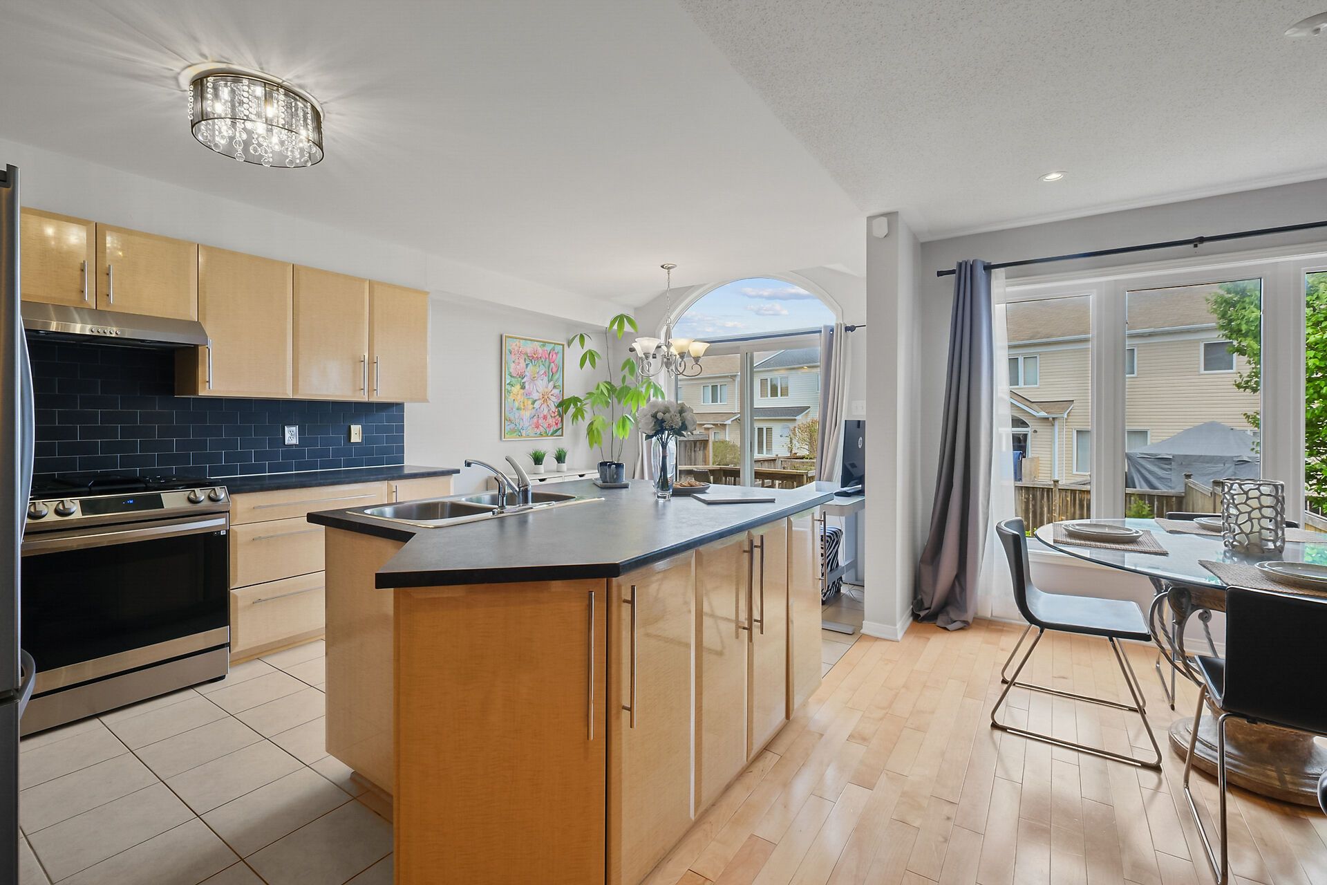 Located in Morgans Grant, this lovely 3 bedroom, 3 bath townhome with finished lower level has exquisite decor. Open plan living & many updates from decor through to appliances, furnace & more. Move-in & enjoy the birch hardwood & tile flooring throughout the main level & soft grey paint palette. Location of this home is ideal, on a quiet street & steps to Dunollie Park & J. Donahue Public School. A short walk to high-tech, many parks, shops, rec center & bus service. Pretty front porch with new front door with inset window & black handle. Porcelain tiled foyer has an updated crystal chandelier & access to a 2 piece powder room with updated mirror & light fixture. Spacious living & dining room has recessed lighting & a tall 3 pane window allowing natural light into the room. Kitchen has an extended island, perfect for entertaining, meal preparation & storage. Features include upgraded light cabinets, subway tiled backsplash, pot drawers, tile flooring & updated high quality S/S appliances.There is also a spacious eating area with vaulted ceiling & patio door to deck & fenced backyard (no right of way). It is presently being used as a home office. Curved staircase with decorative niche & chandelier takes you to the 2nd level. Primary bedroom has upgraded birch hardwood flooring that continues into the walk-in closet, light neutral decor, a big window with views of the backyard and a 4 piece ensuite. White vanity with drawers is complemented by a chic mirror, updated light fixture, tile flooring, roman tub with tile surround & a separate shower. 2 more good-sized bedrooms, each with double windows with blinds & double closets. Main bath is close by & it has a combined tub/shower with tile surround & flooring. Finished lower level is great space for movie nights, play and an office. Lovely fenced backyard has plenty of room for gardens, play and enjoying time with family & friends. No right of way in backyard. Furnace 2025, A/C 2019. 24 hours irrevocable on all offers.