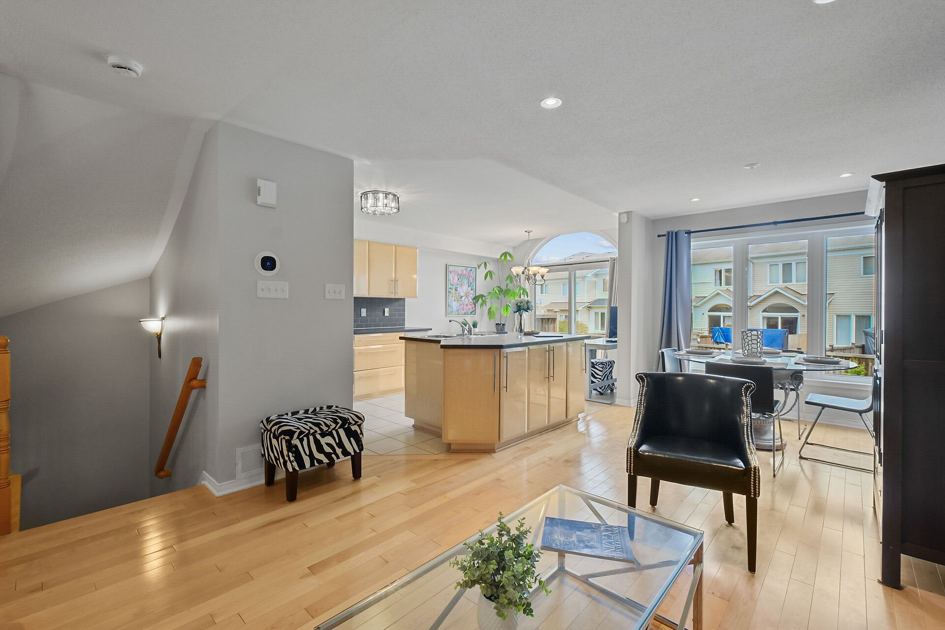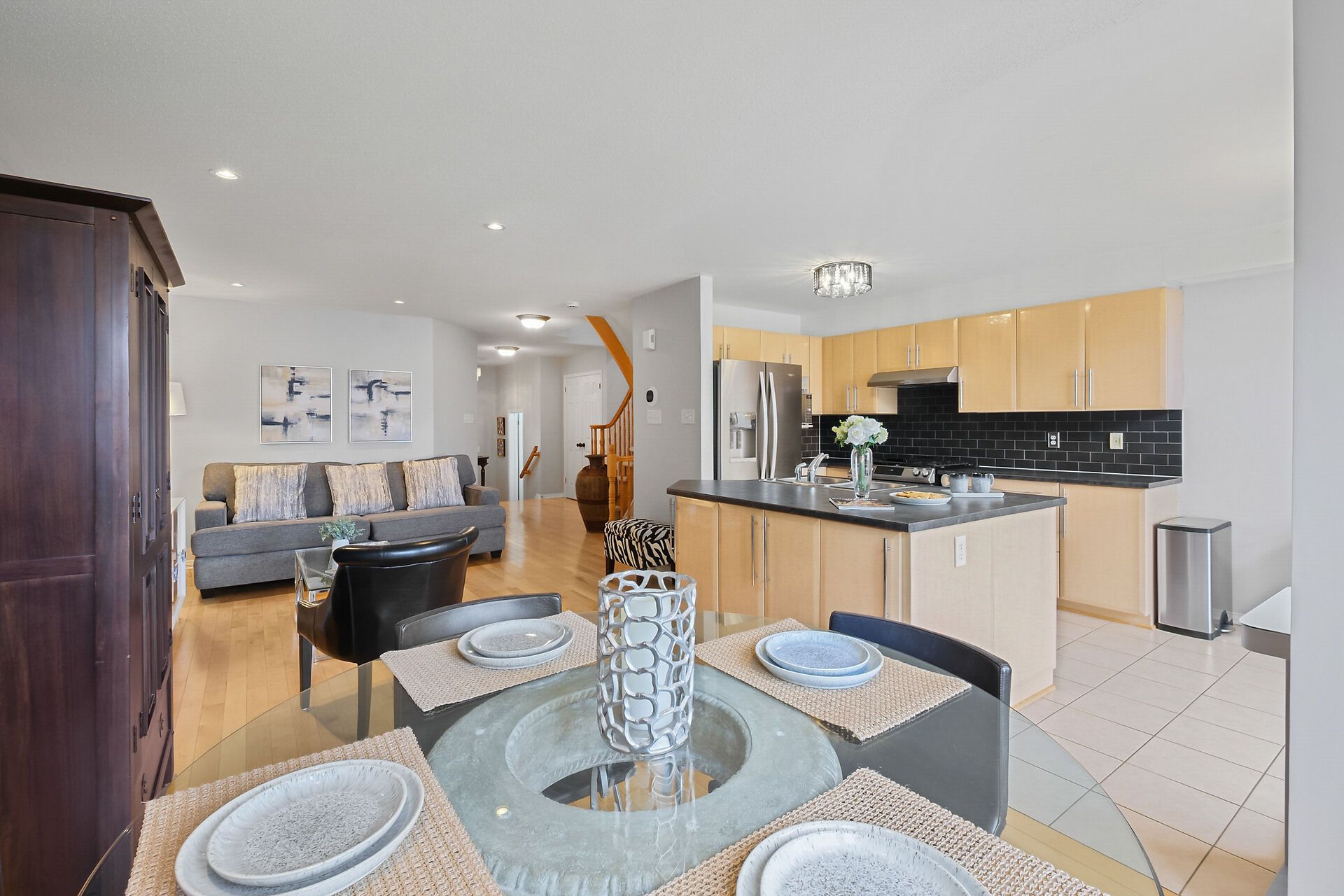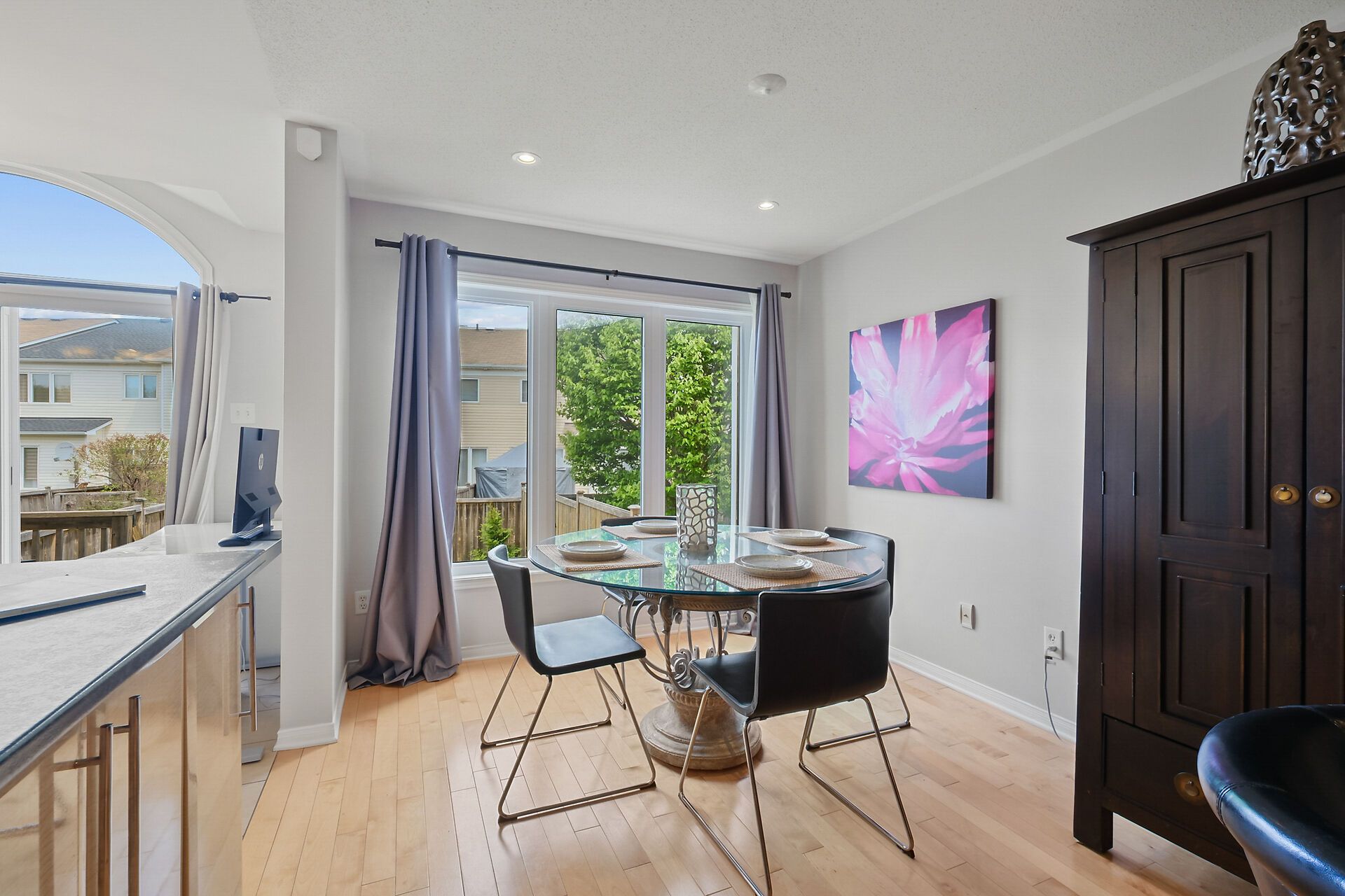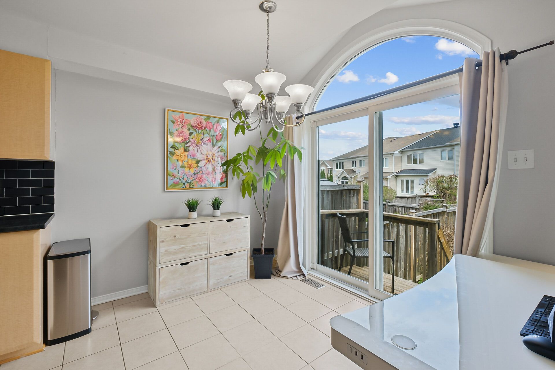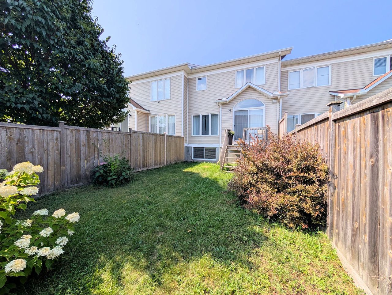 Located in Morgans Grant, this lovely 3 bedroom, 3 bath townhome with finished lower level has exquisite decor. Open plan living & many updates from decor through to appliances, furnace & more. Move-in & enjoy the birch hardwood & tile flooring throughout the main level & soft grey paint palette. Location of this home is ideal, on a quiet street & steps to Dunollie Park & J. Donahue Public School. A short walk to high-tech, many parks, shops, rec center & bus service. Pretty front porch with new front door with inset window & black handle. Porcelain tiled foyer has an updated crystal chandelier & access to a 2 piece powder room with updated mirror & light fixture. Spacious living & dining room has recessed lighting & a tall 3 pane window allowing natural light into the room. Kitchen has an extended island, perfect for entertaining, meal preparation & storage. Features include upgraded light cabinets, subway tiled backsplash, pot drawers, tile flooring & updated high quality S/S appliances.There is also a spacious eating area with vaulted ceiling & patio door to deck & fenced backyard (no right of way). It is presently being used as a home office. Curved staircase with decorative niche & chandelier takes you to the 2nd level. Primary bedroom has upgraded birch hardwood flooring that continues into the walk-in closet, light neutral decor, a big window with views of the backyard and a 4 piece ensuite. White vanity with drawers is complemented by a chic mirror, updated light fixture, tile flooring, roman tub with tile surround & a separate shower. 2 more good-sized bedrooms, each with double windows with blinds & double closets. Main bath is close by & it has a combined tub/shower with tile surround & flooring. Finished lower level is great space for movie nights, play and an office. Lovely fenced backyard has plenty of room for gardens, play and enjoying time with family & friends. No right of way in backyard. Furnace 2025, A/C 2019. 24 hours irrevocable on all offers.
