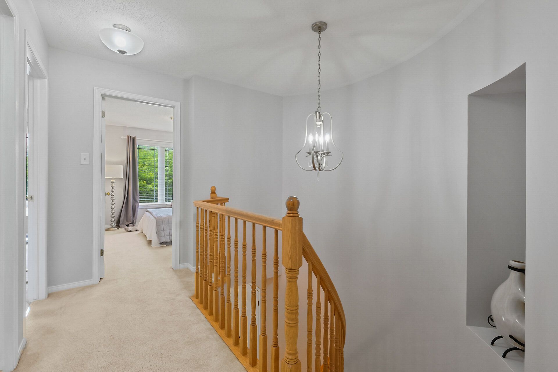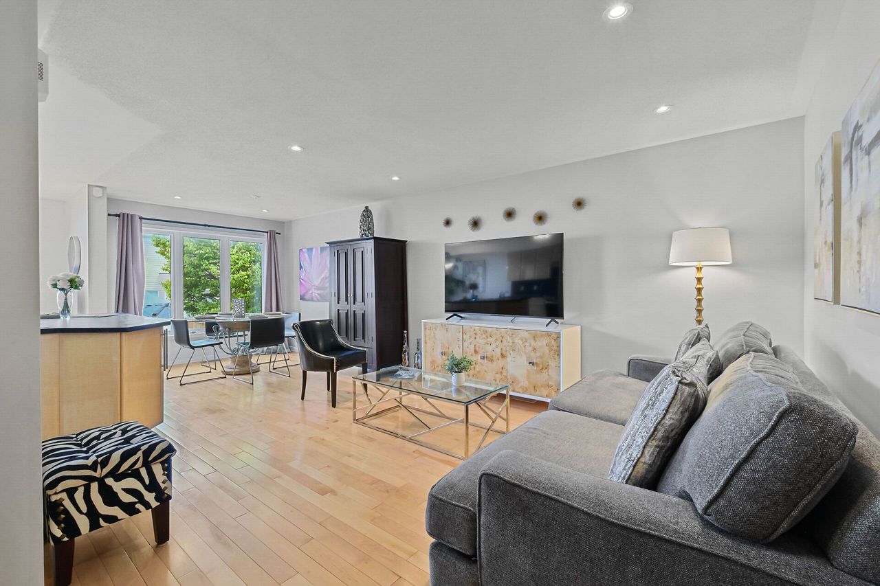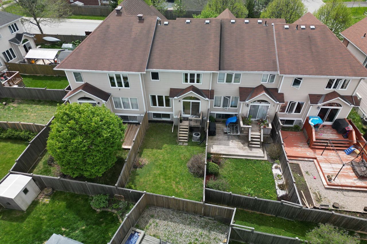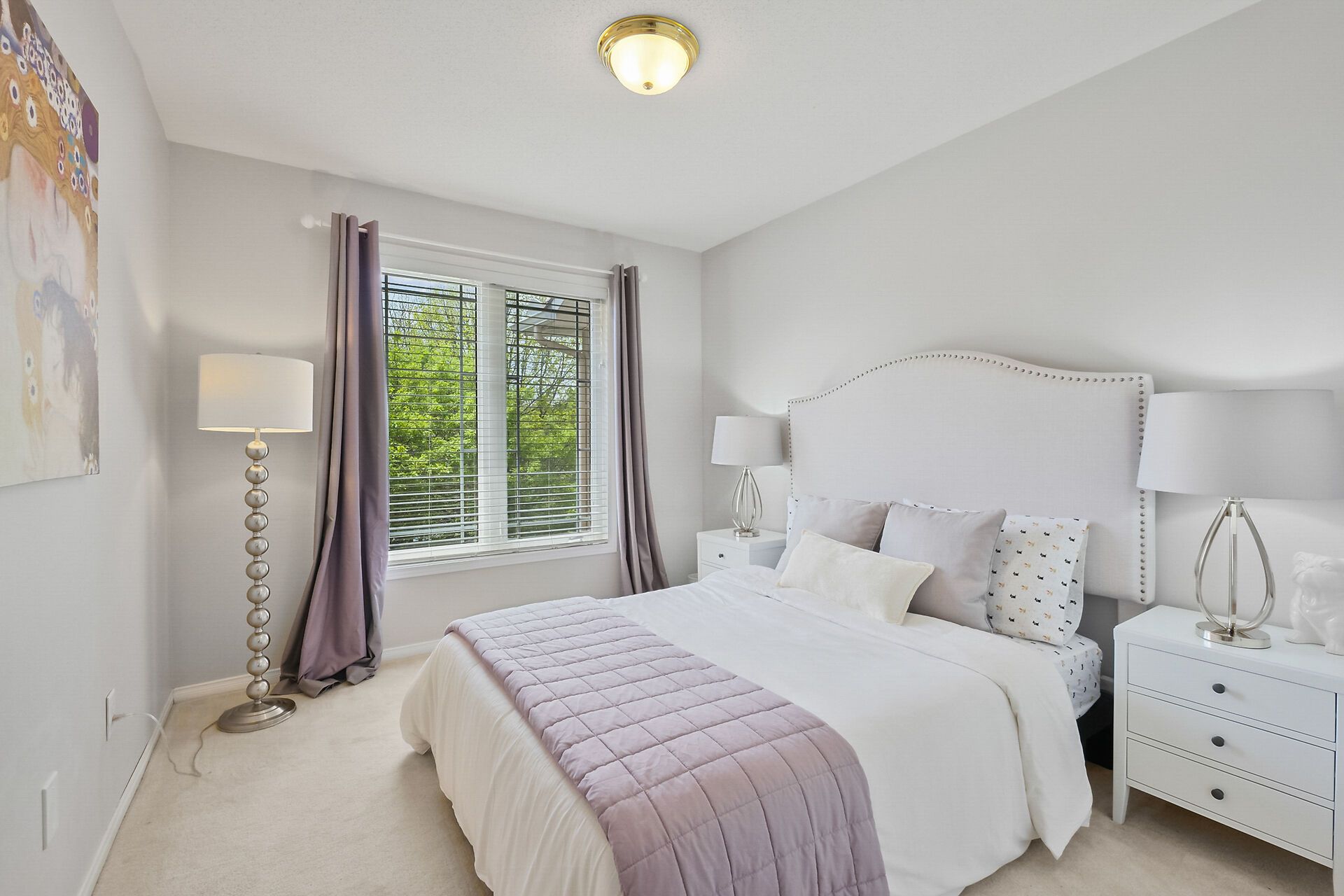 Located in Morgans Grant, this lovely 3 bedroom, 3 bath townhome with finished lower level has exquisite decor. Open plan living & many updates from decor through to appliances, furnace & more. Move-in & enjoy the birch hardwood & tile flooring throughout the main level & soft grey paint palette. Location of this home is ideal, on a quiet street & steps to Dunollie Park & J. Donahue Public School. A short walk to high-tech, many parks, shops, rec center & bus service. Pretty front porch with new front door with inset window & black handle. Porcelain tiled foyer has an updated crystal chandelier & access to a 2 piece powder room with updated mirror & light fixture. Spacious living & dining room has recessed lighting & a tall 3 pane window allowing natural light into the room. Kitchen has an extended island, perfect for entertaining, meal preparation & storage. Features include upgraded light cabinets, subway tiled backsplash, pot drawers, tile flooring & updated high quality S/S appliances.There is also a spacious eating area with vaulted ceiling & patio door to deck & fenced backyard (no right of way). It is presently being used as a home office. Curved staircase with decorative niche & chandelier takes you to the 2nd level. Primary bedroom has upgraded birch hardwood flooring that continues into the walk-in closet, light neutral decor, a big window with views of the backyard and a 4 piece ensuite. White vanity with drawers is complemented by a chic mirror, updated light fixture, tile flooring, roman tub with tile surround & a separate shower. 2 more good-sized bedrooms, each with double windows with blinds & double closets. Main bath is close by & it has a combined tub/shower with tile surround & flooring. Finished lower level is great space for movie nights, play and an office. Lovely fenced backyard has plenty of room for gardens, play and enjoying time with family & friends. No right of way in backyard. Furnace 2025, A/C 2019. 24 hours irrevocable on all offers.