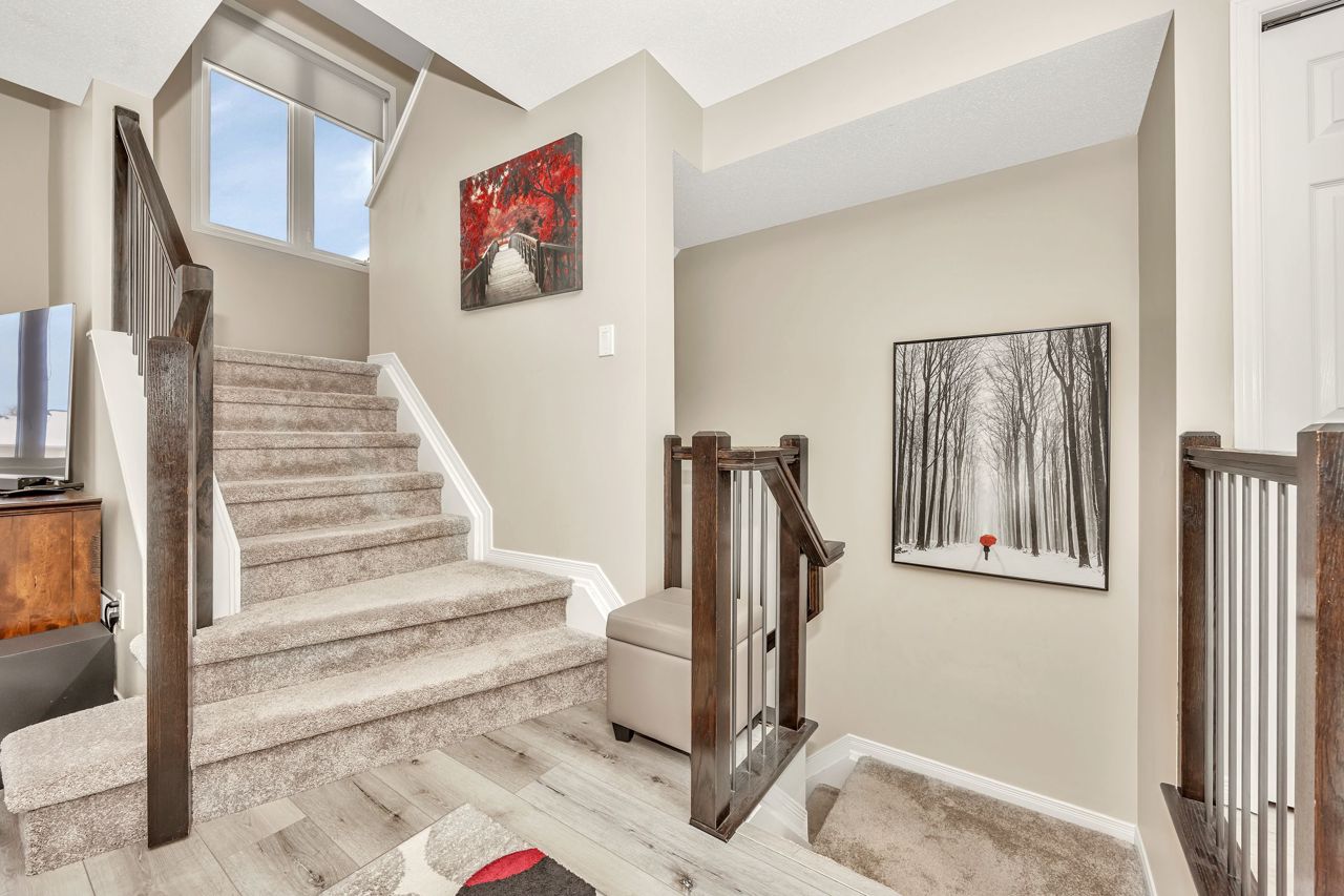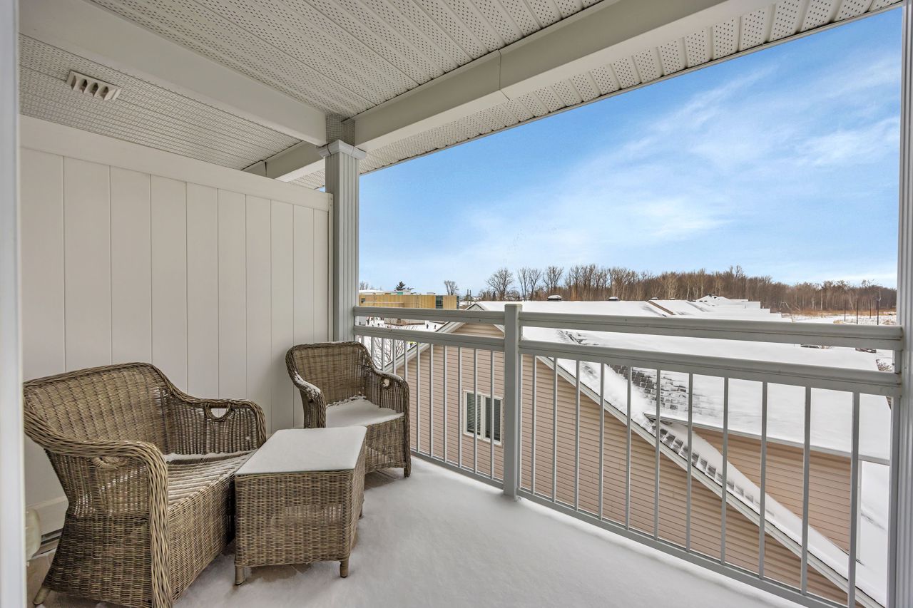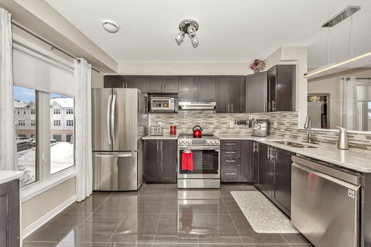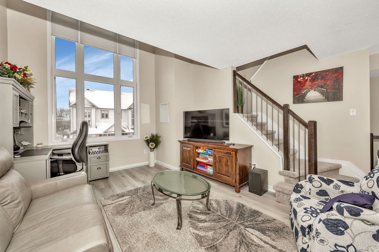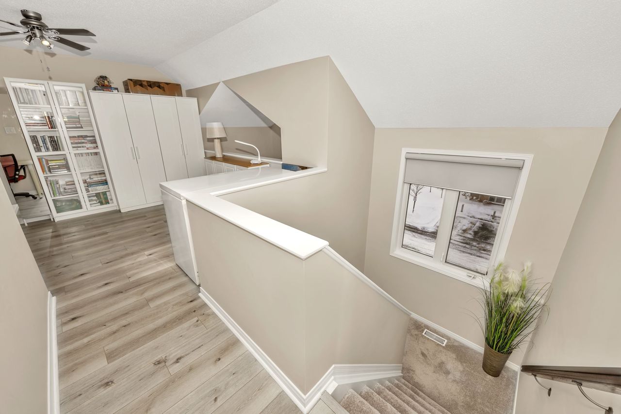 Exquisite upper-level corner end unit with loft, in prestigious Chapel Hill South Community! Quiet section of the development. 25K of upgrades in 2022 including flooring, custom blinds, fixtures and dimmers & painted throughout. This rarely available 2-bedroom, 2-bathroom gem offers over 1,500 square feet of thoughtfully designed living space, bathed in natural light from an abundance of windows. The soaring vaulted ceilings create an airy and open atmosphere, making this home feel even more expansive. Luxury vinyl flooring throughout main living area and bedrooms. Elegant upgraded light fixtures throughout. The main floor features a spacious, open-concept layout perfect for entertaining family and friends. The gourmet kitchen with ample cabinet and counter space boasts sleek quartz countertops, stainless steel appliances (on site appliances will be replaced by new appliances on closing), and sleek ceramic tile flooring. A good sized breakfast nook area leads to a sun-filled private balcony. The main level also includes a powder room, a laundry area & mechanical/storage area for added convenience. Upstairs, the primary suite offers a walk-in closet, a private balcony & cheater-door to the main bathroom. A second well-sized bedroom and a versatile loft space add flexibility to the home, making it ideal for a TV room or home office. Enjoy the best of both worlds with easy access to public transit, walking trails, and nearby parks. **EXTRAS** Condo fees include: Snow removal, lawn care, building insurance, maintenance, water, reserve fund