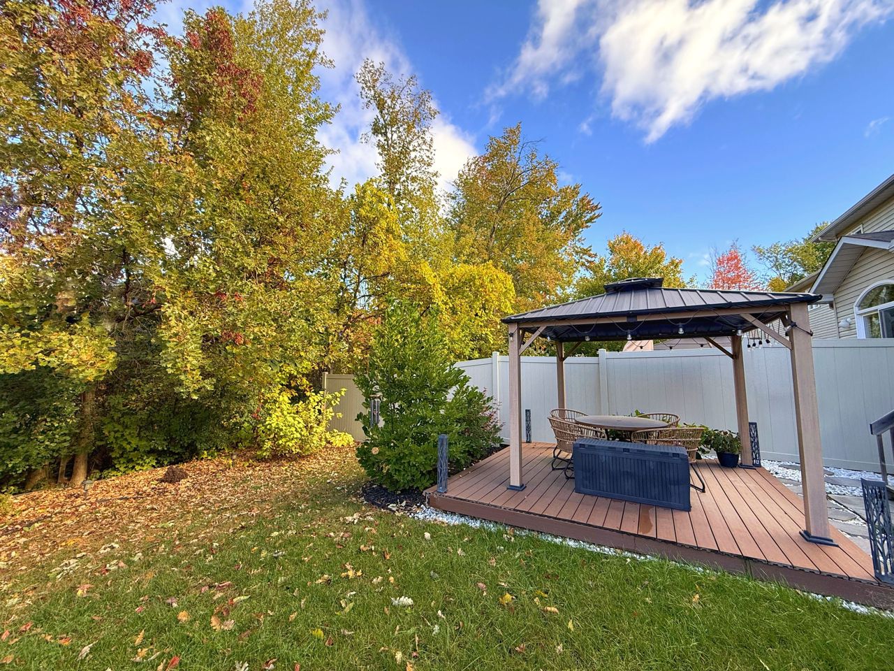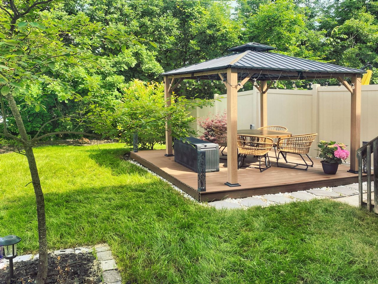 户外绿洲:步入私密的庭院休憩区,设有新安装的无线网络就绪浇水系统、带凉亭的大型甲板和成熟的树木,非常适合户外休闲。