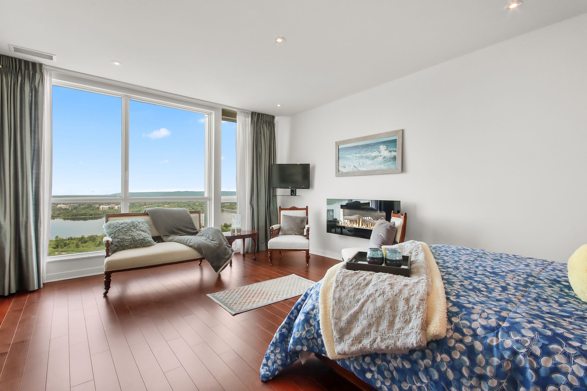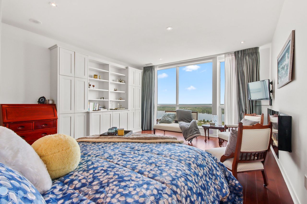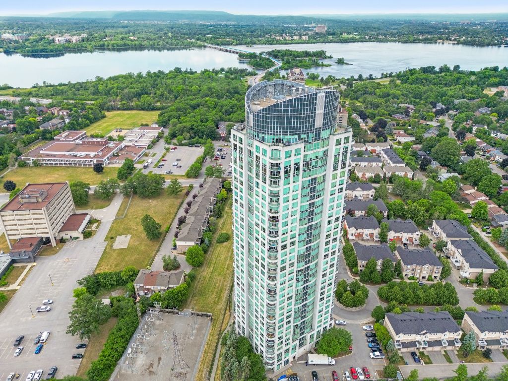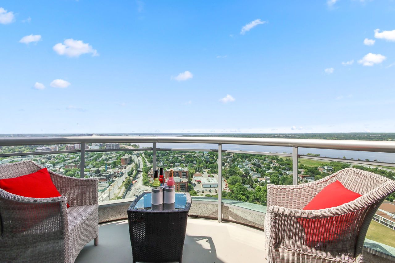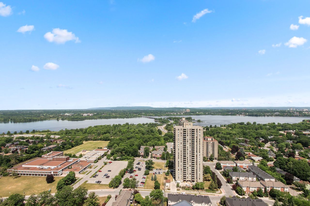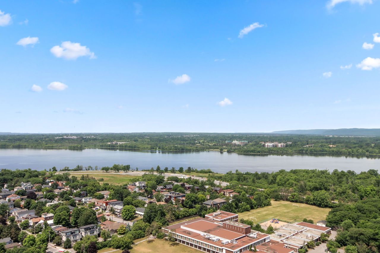 Escape to this luxurious 2470 sqft, 32nd floor penthouse condo w/breathtaking views of the Ottawa River & Laurentian Mountains. Greeted by an abundance of natural light flooding the expansive living spaces, motion censored fireplace, 9ft ceilings, oversized windows revel the everchanging tapestry of nature's beauty. This custom designed kitchen also features top of the line SS appliances, an extra freezer & Corian Quartz counters. Enjoy dining inside or from your 1 of your 2 private balconies. A separate wing features your expansive primary bedroom, extensive wraparound walkin closet, elegant ensuite w spa like soaker tub & oversized shower. The large 2nd bedroom features a private ensuite & oversized closets. All rooms have their own independent sound system & thermostat. Extensively upgraded this home was originally built for the owners who spared no expense in upgrades and custom details! With only 3 units on the entire floor & secure access to your floor your privacy is guaranteed.Amenities are located on the main floor. Ample visitors parking. Private fenced backyard with gazebo. Car wash basin, bike rack, electric car charging station. Please see attachment for a full list of features and upgrades.