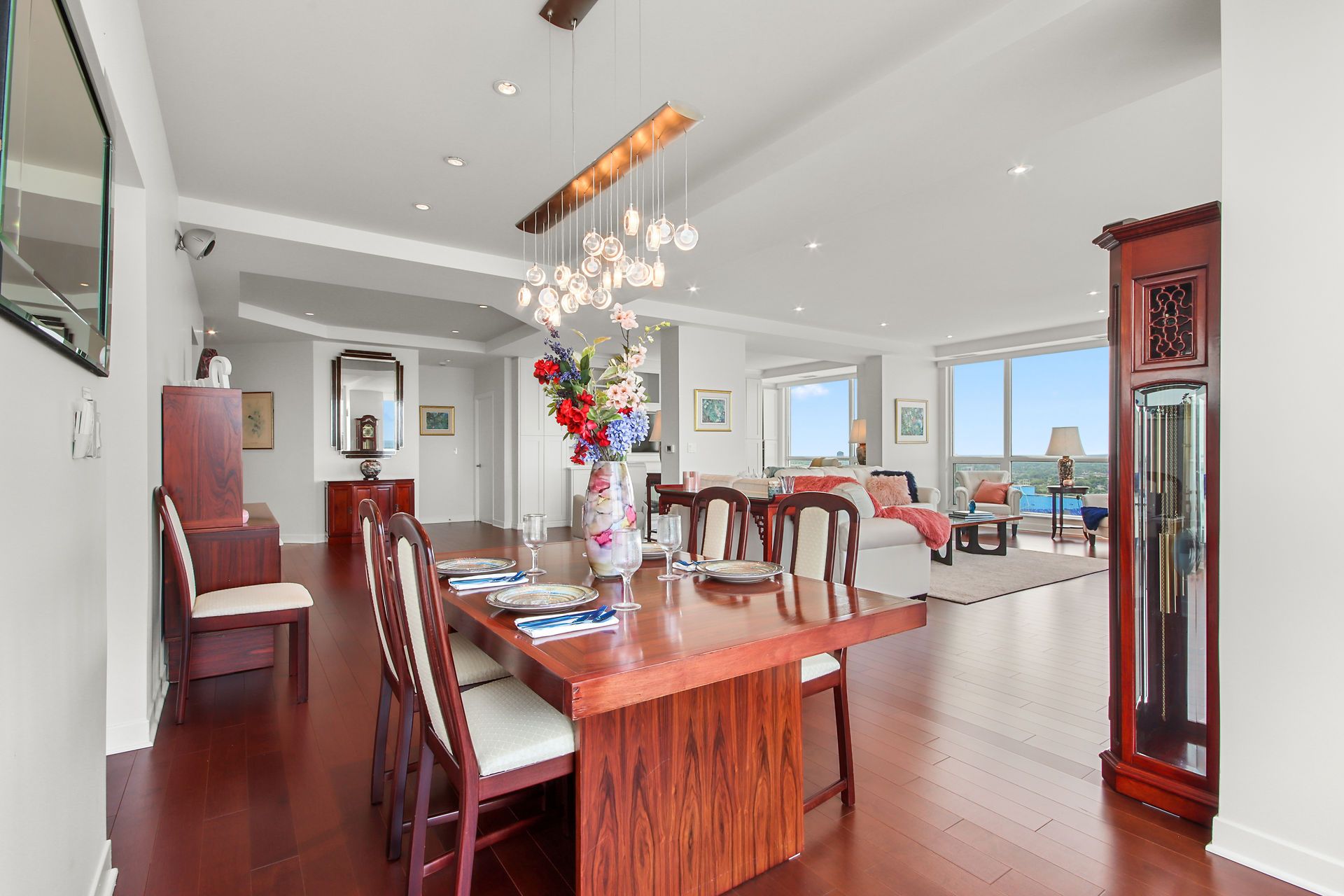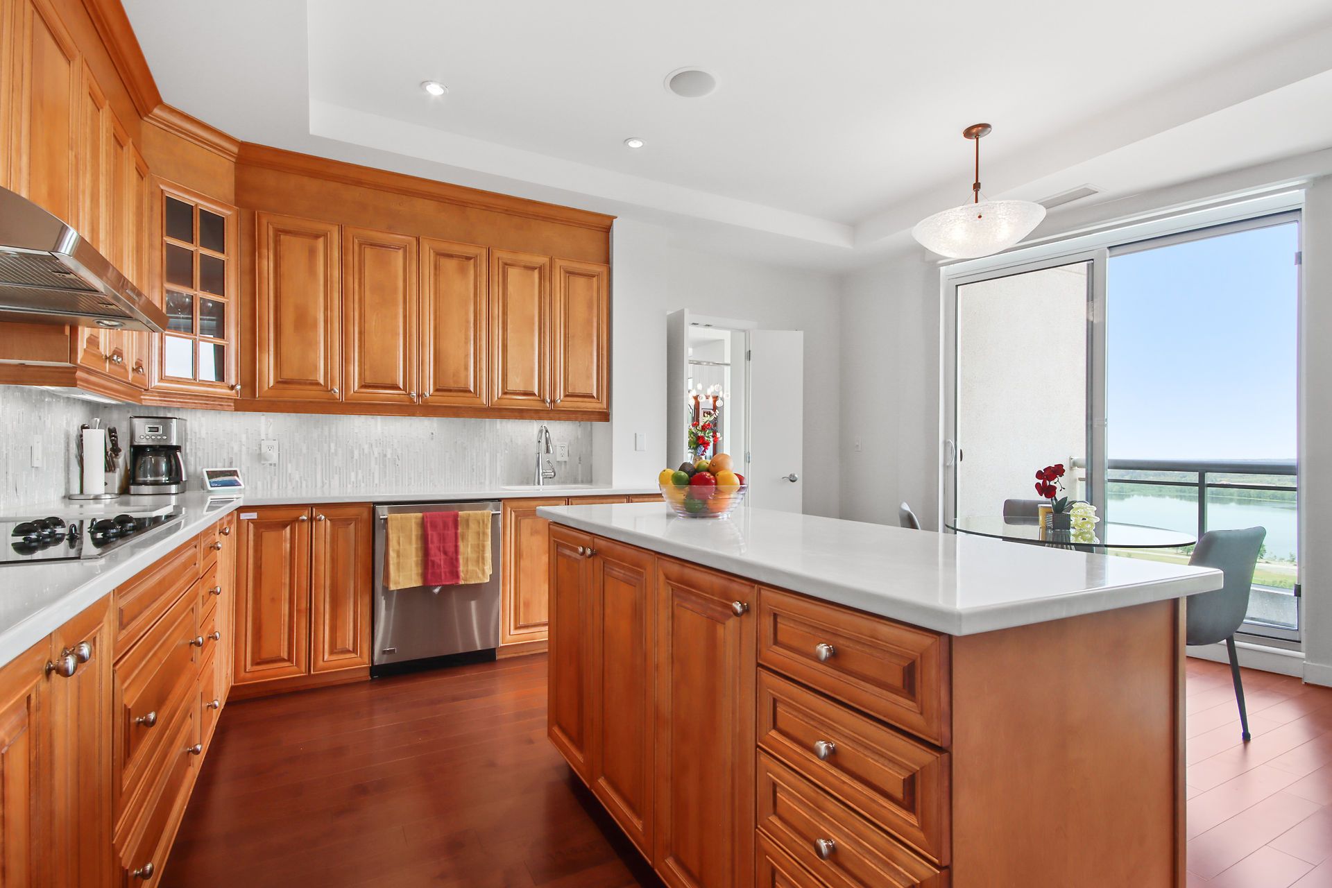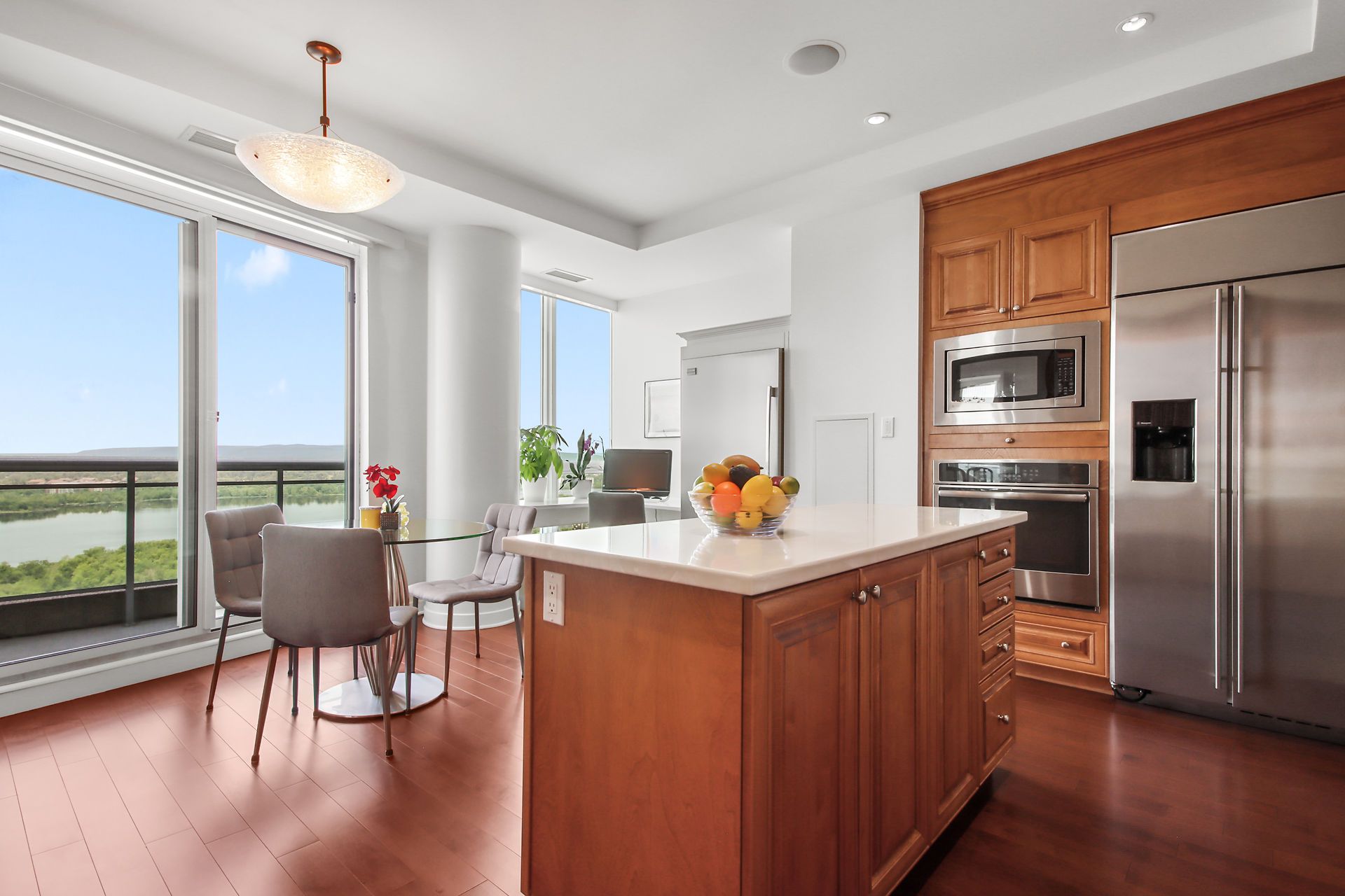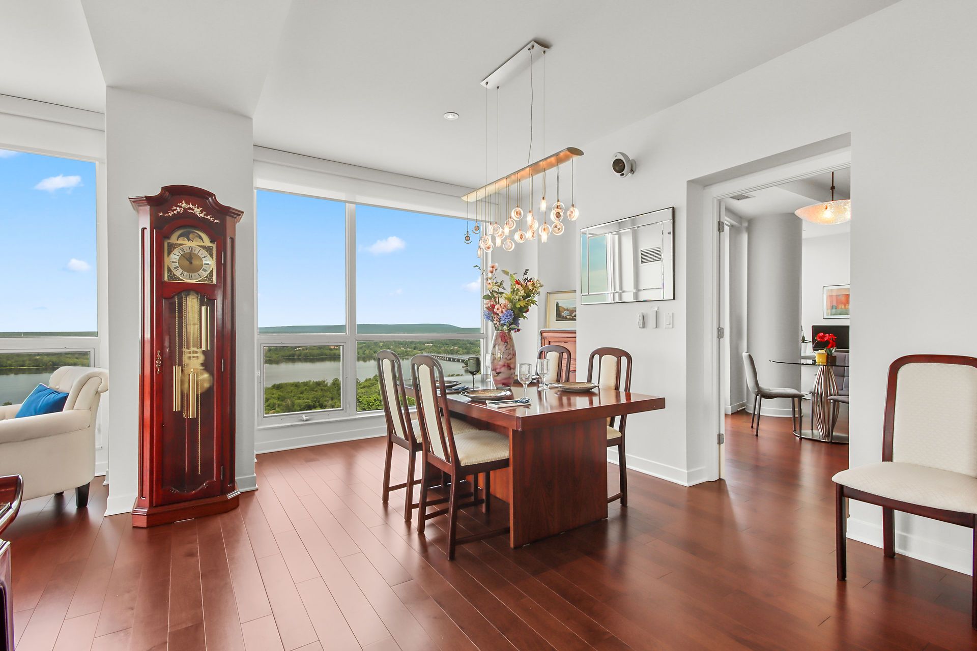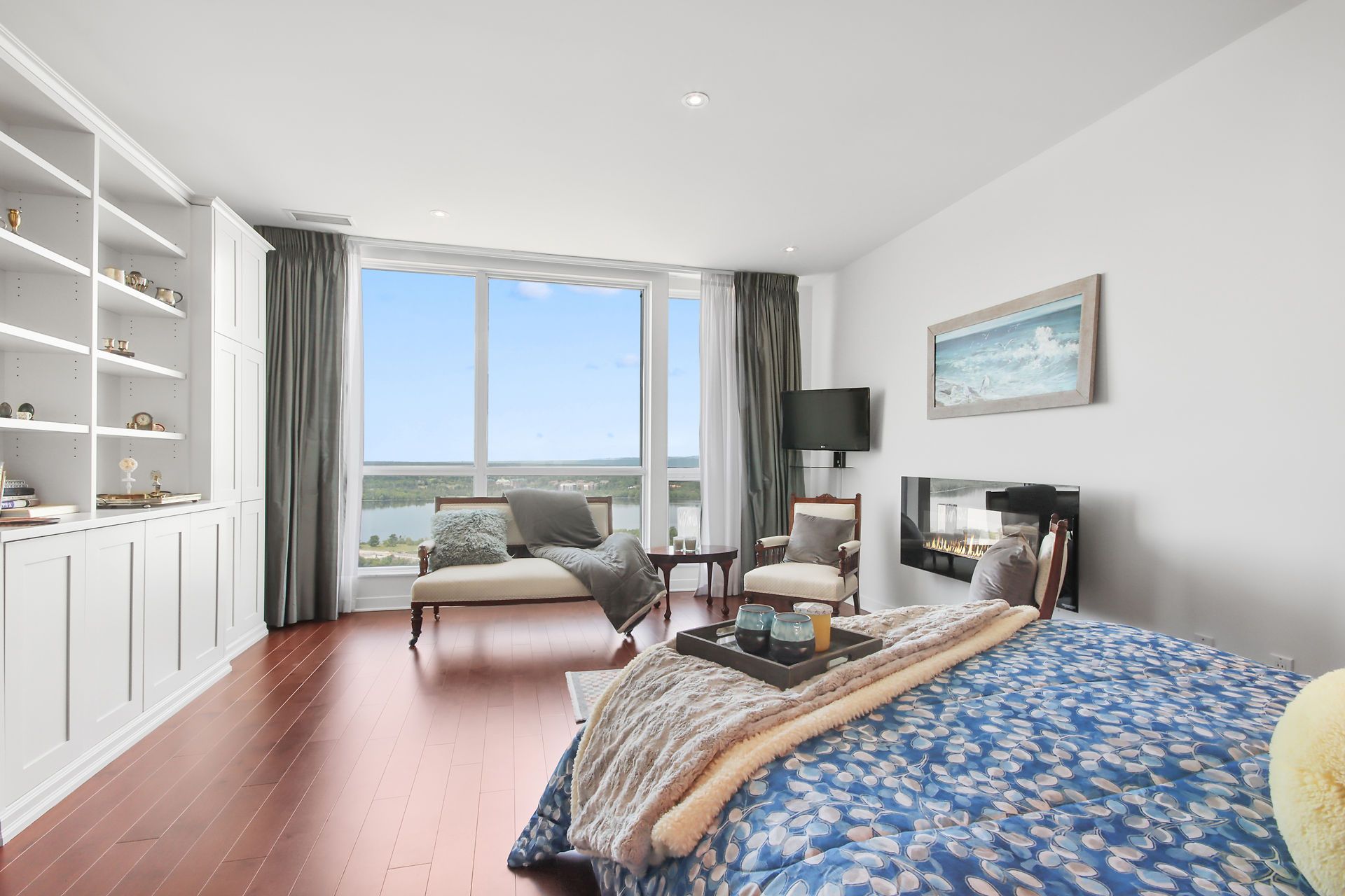 Escape to this luxurious 2470 sqft, 32nd floor penthouse condo w/breathtaking views of the Ottawa River & Laurentian Mountains. Greeted by an abundance of natural light flooding the expansive living spaces, motion censored fireplace, 9ft ceilings, oversized windows revel the everchanging tapestry of nature's beauty. This custom designed kitchen also features top of the line SS appliances, an extra freezer & Corian Quartz counters. Enjoy dining inside or from your 1 of your 2 private balconies. A separate wing features your expansive primary bedroom, extensive wraparound walkin closet, elegant ensuite w spa like soaker tub & oversized shower. The large 2nd bedroom features a private ensuite & oversized closets. All rooms have their own independent sound system & thermostat. Extensively upgraded this home was originally built for the owners who spared no expense in upgrades and custom details! With only 3 units on the entire floor & secure access to your floor your privacy is guaranteed.Amenities are located on the main floor. Ample visitors parking. Private fenced backyard with gazebo. Car wash basin, bike rack, electric car charging station. Please see attachment for a full list of features and upgrades.