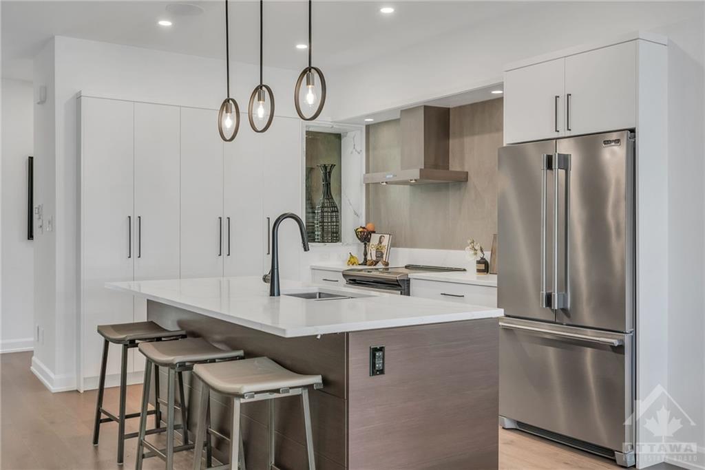 This luxurious 3 bed, 4 bath end unit townhome has casual yet sophisticated style built with superior quality & impeccable design. It has spacious bedrooms, modern kitchen, & spa-like bathrooms. This home is equipped w/ quality features from top to bottom starting from the wine rack, recessed TV (included), wall & ceiling speakers, glass wall waterfall stairs, quartz counters in the kitchen & all washrooms. The second level boasts the master bedroom with a huge ensuite with a spacious walk-in closet, 2 other spacious bedrooms, and the laundry area. Maintenance free backyard has a permitted insulated garage (wired & cemented) w/ no neighbors right of access, a hook up for a hot tub, gas hose line for a fireplace. Basement has a big recreational room, full bath, an oversized window that lets in plenty of natural light! Smart automated home system including dimmable lights, HVAC, smart plugs, doorlocks, garage openers, alarm system! Close to the highway, downtown, and all amenities!