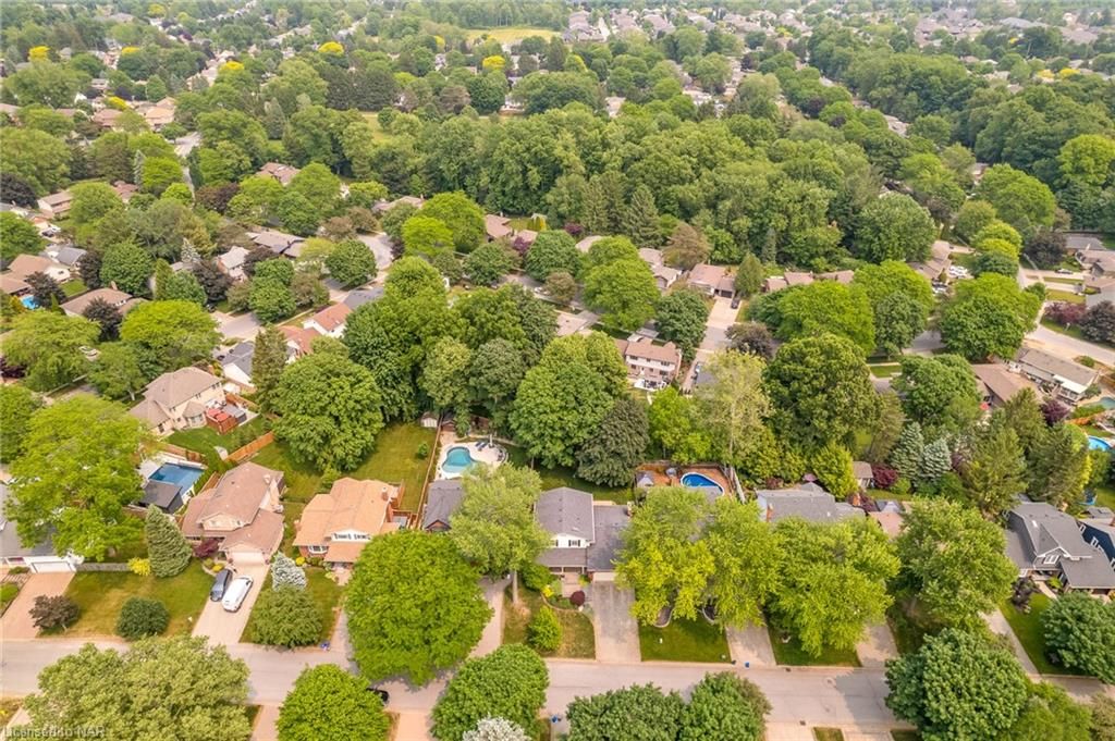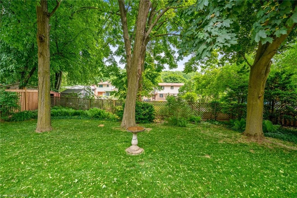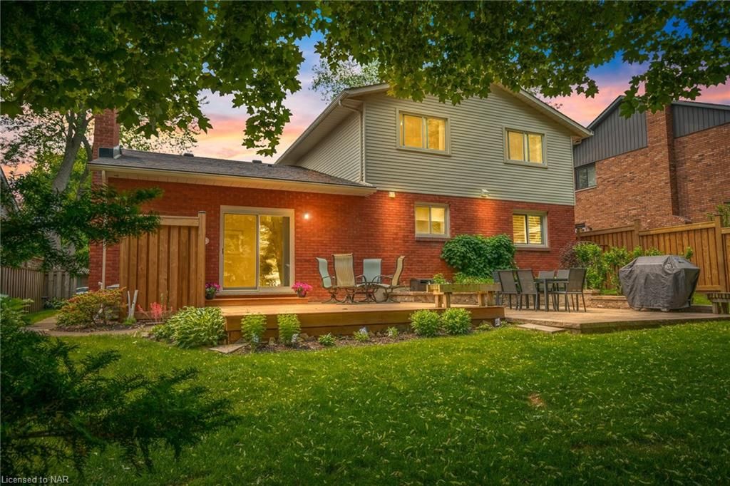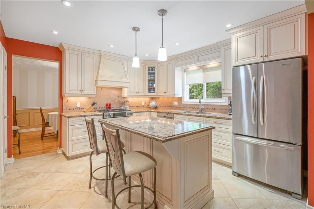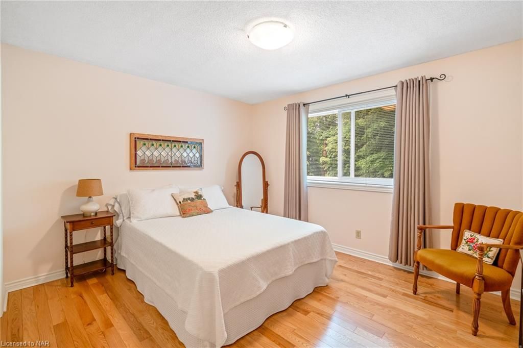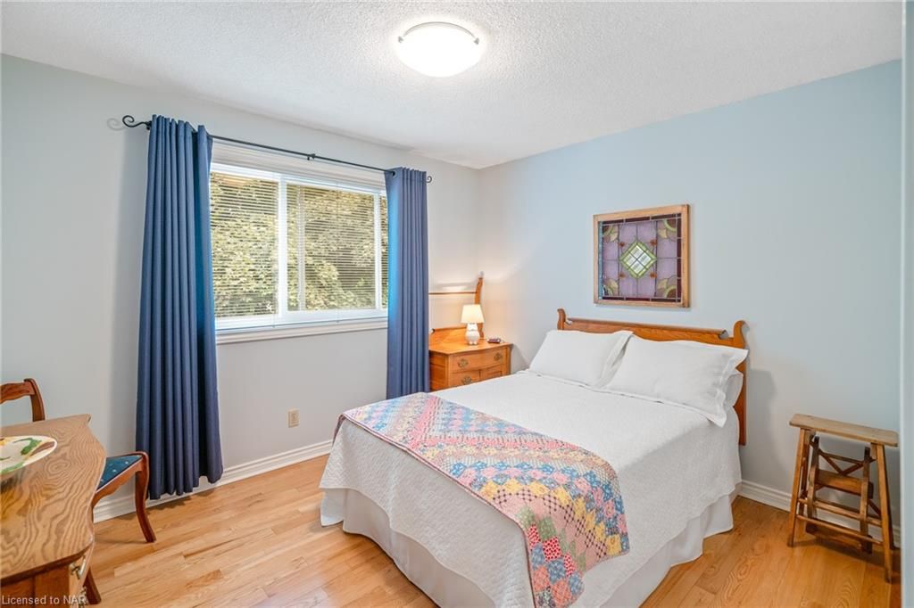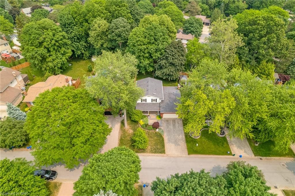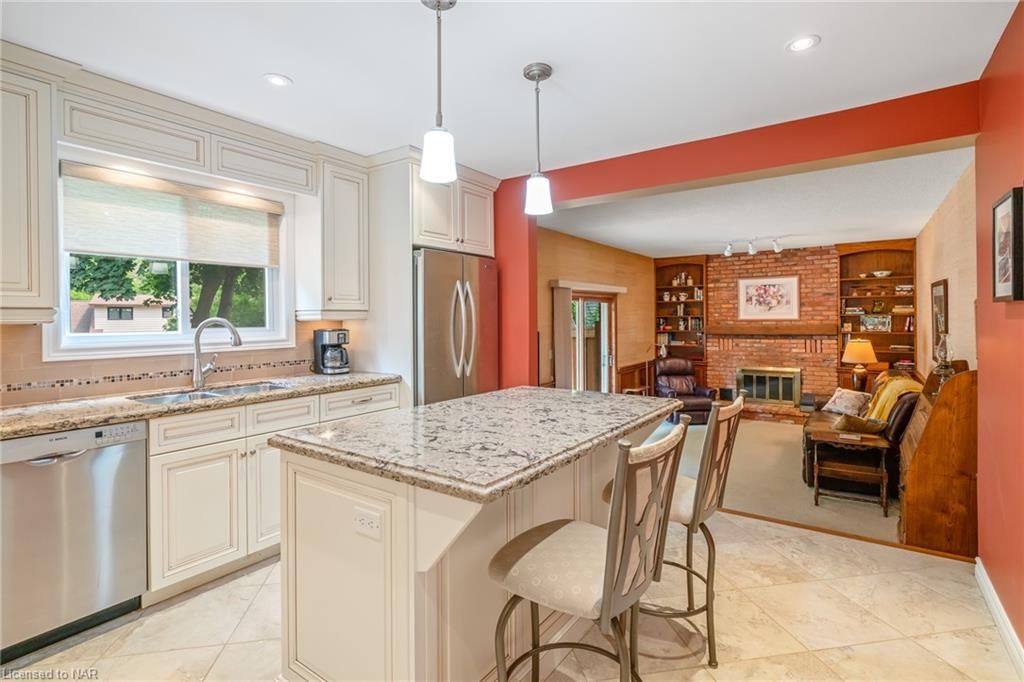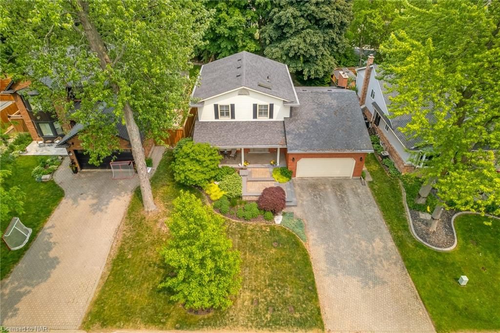 Located on a quiet street surrounded by mature trees in the wonderful community of Fonthill. Entering the home you get a sense of how well this home has been cared for. The gleaming hardwood floors in the living and dining room are in excellent shape. Kitchen cabinets finished in white with distress design are complemented by quartz countertops and tiled backsplash. The island has room for a little breakfast bar and serves as the prep station for cooking on the stainless-steel gas stove. Off the kitchen is a cozy sunken living room with wood fireplace and sliding door to the backyard. The upstairs boasts 3 large bedrooms with a 4 piece bath. The primary bedroom has its own 3 piece ensuite. Basement contains 1 bed, a sitting area, workshop with benches and a large furnace/storage area with shelving. Upgrades in the last 10-12 years include flooring, kitchen, ensuite, furnace, A/C and gutter guards. All the windows and shingles have also been replaced in the past 15 years.
