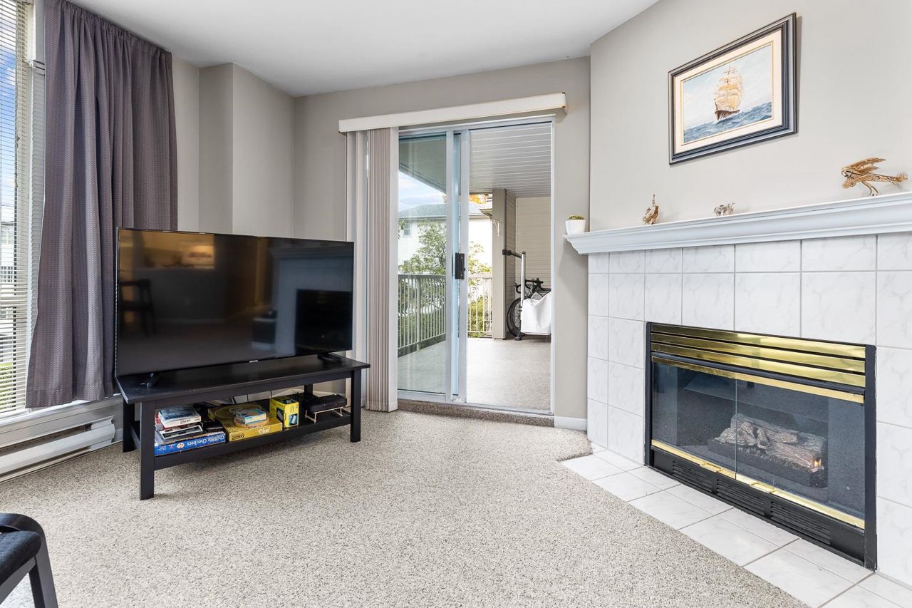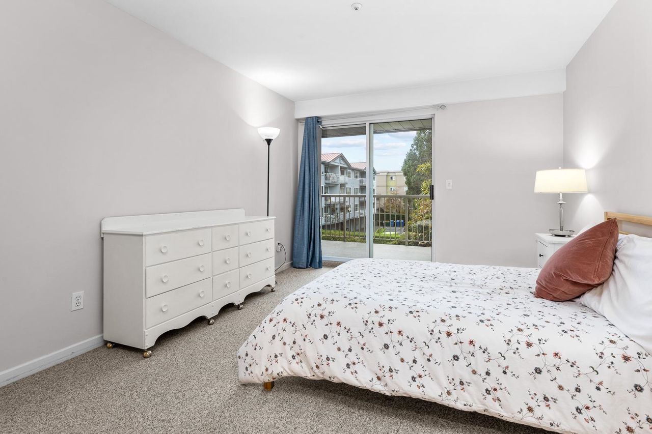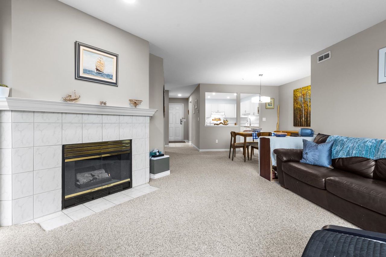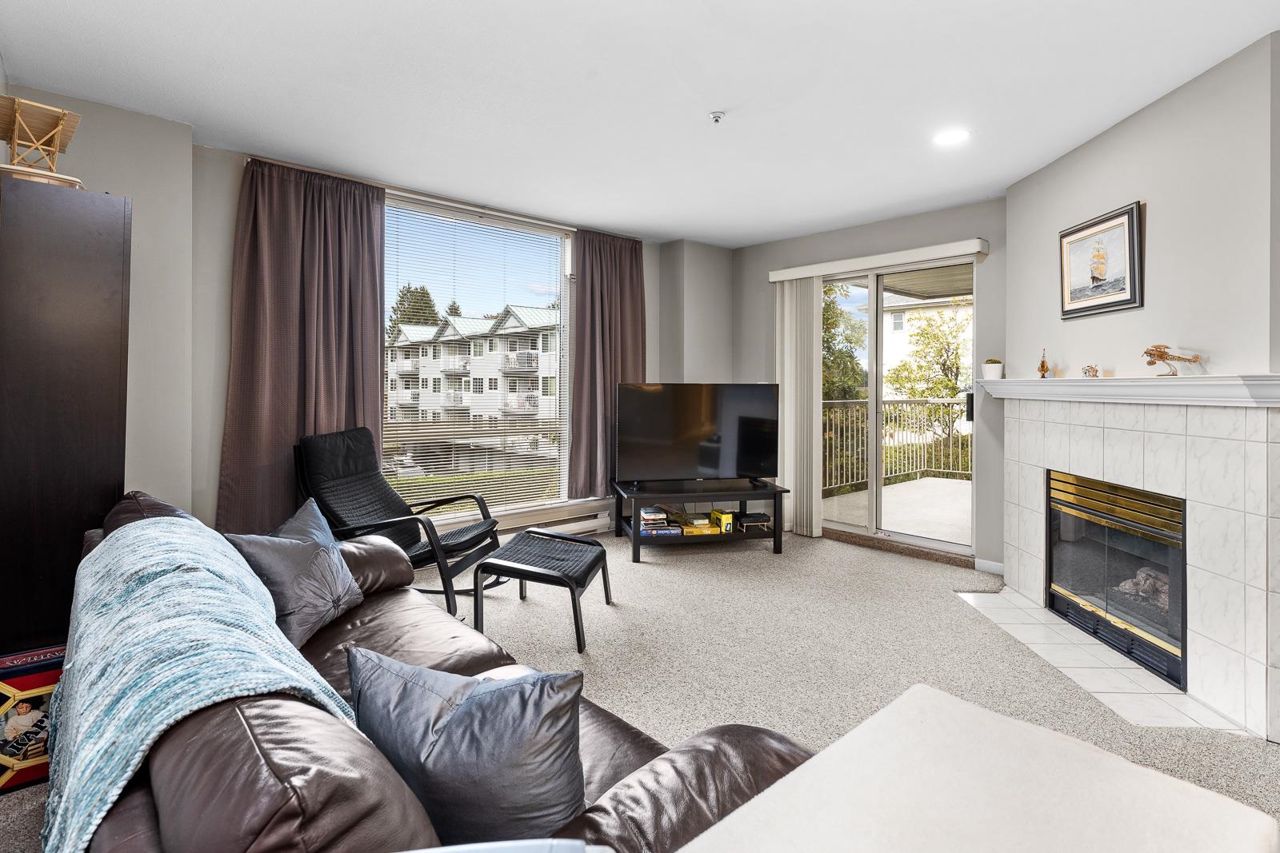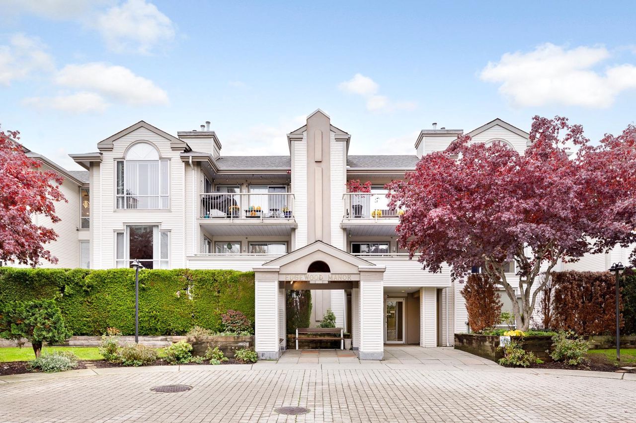Nestled in the Heart of Pitt Meadows, this is Edgewood Manor. A 2 bed 2 bath with over 1100 sq/ft of living space. Bright & spacious kitchen with white cabinetry, LED potlights & white tile backsplash. The open concept allows you to entertain with separate dining & living areas. Living room boasts fresh carpet throughout with oversize windows & access to large west-facing deck. Warm up in the winter months with your white-tiled gas fireplace. Primary bedroom is King bed compatible with 4-pce walk-in ensuite, including separate bath & shower. Second bed & bath with side by side laundry complete this amazing condo. Walkability is amazing with its proximity to schools, shopping & trails. This is one you won't want to miss! Book your private showing today.