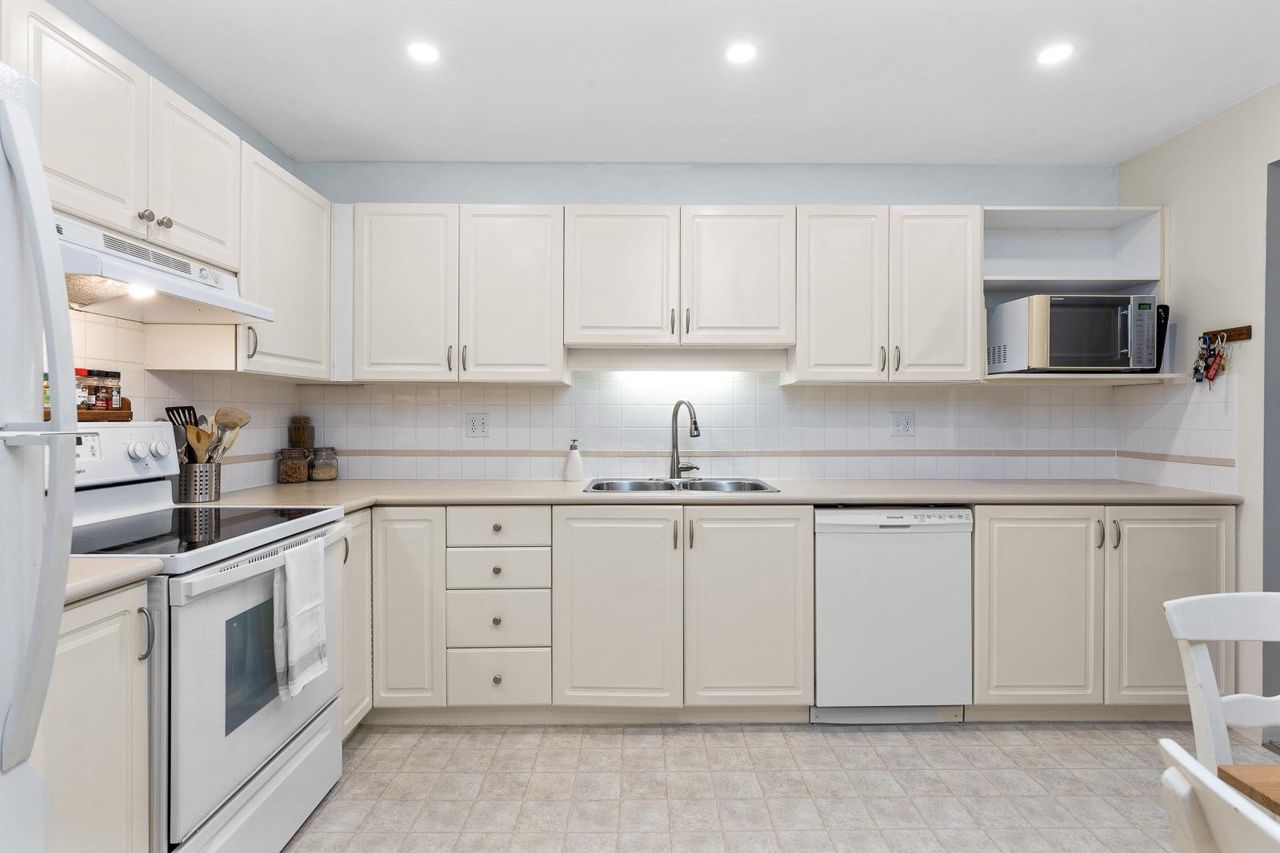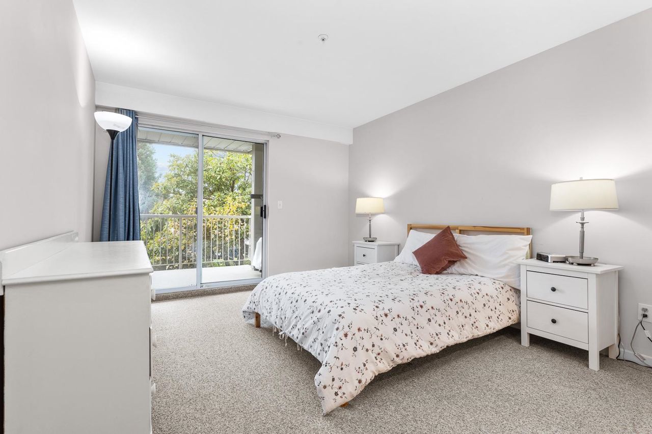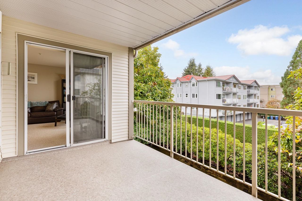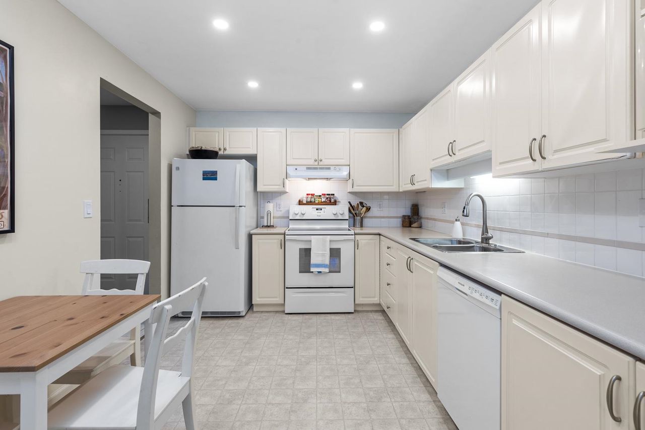 Nestled in the Heart of Pitt Meadows, this is Edgewood Manor. A 2 bed 2 bath with over 1100 sq/ft of living space. Bright & spacious kitchen with white cabinetry, LED potlights & white tile backsplash. The open concept allows you to entertain with separate dining & living areas. Living room boasts fresh carpet throughout with oversize windows & access to large west-facing deck. Warm up in the winter months with your white-tiled gas fireplace. Primary bedroom is King bed compatible with 4-pce walk-in ensuite, including separate bath & shower. Second bed & bath with side by side laundry complete this amazing condo. Walkability is amazing with its proximity to schools, shopping & trails. This is one you won't want to miss! Book your private showing today.