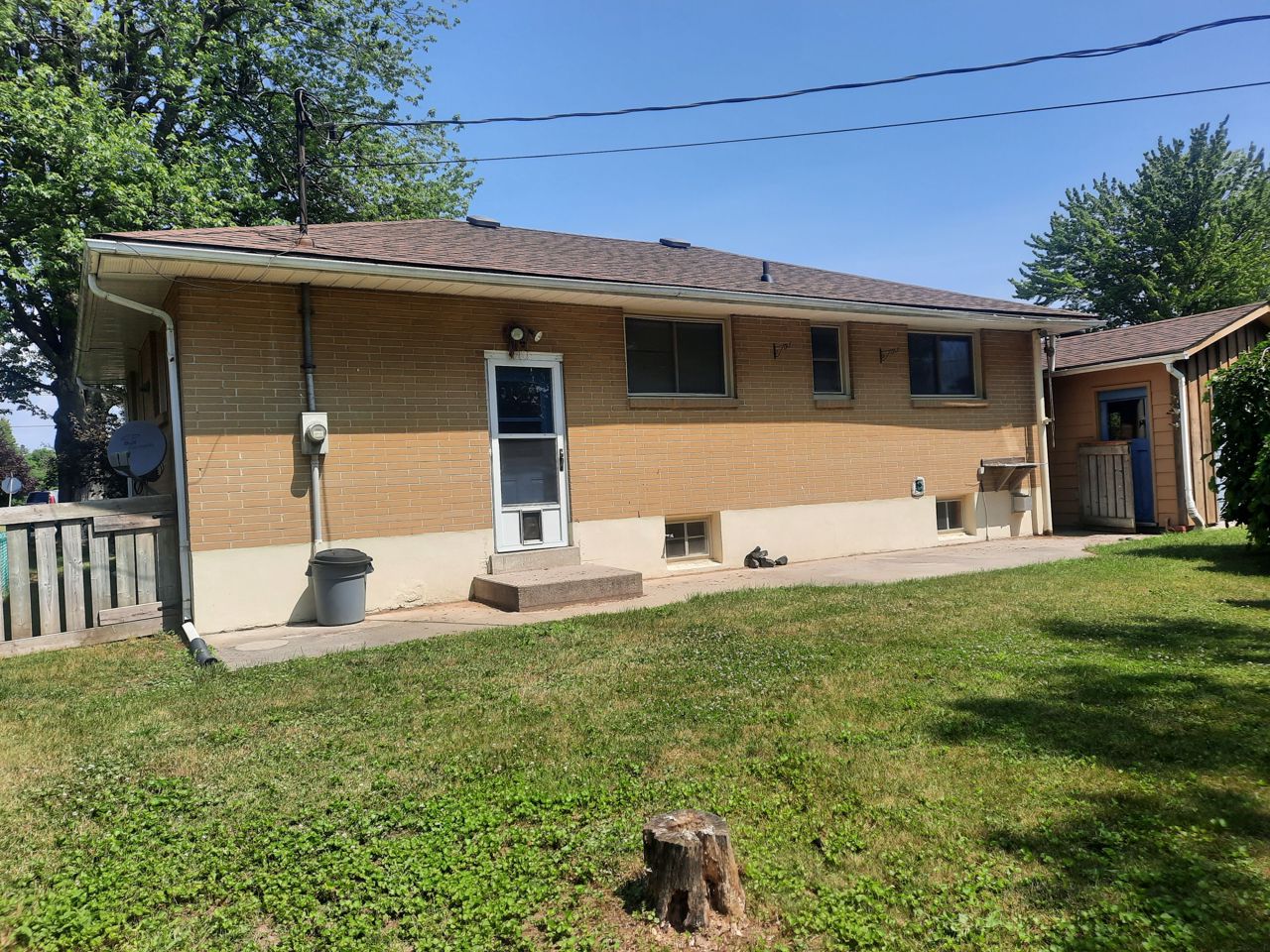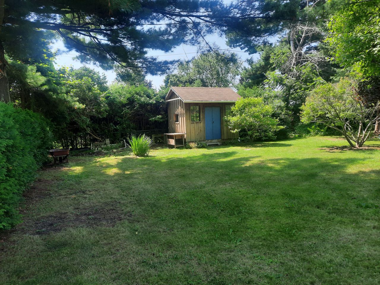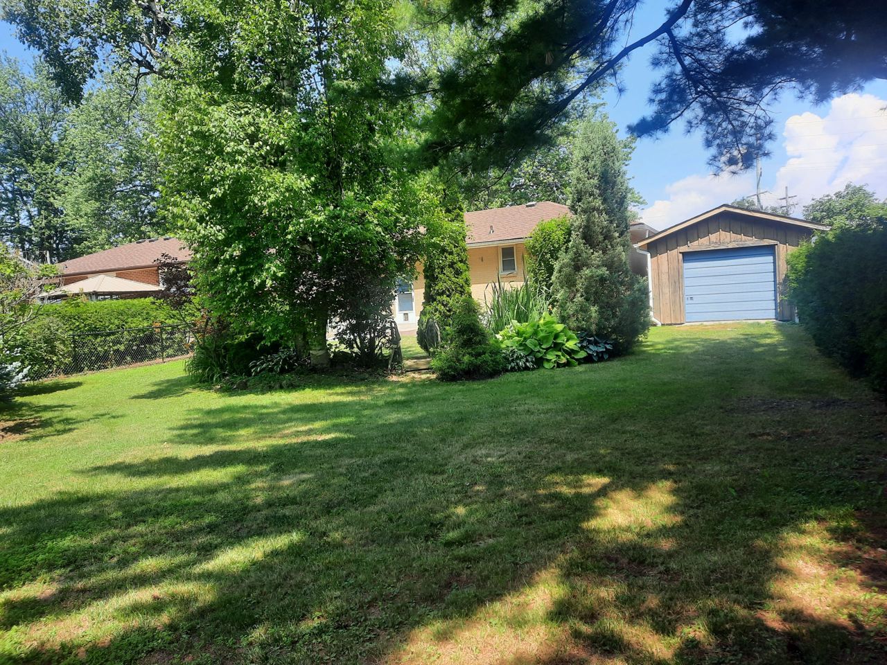 Large 14x24 drive thru garage with electricity. 12x8 garden shed with electricity. House 200 amp service. Napoleon fireplace in rec room. Large bay window in living room. Hardwood floors main level. Oak kitchen cupboards. Large fenced in yard with mature trees and shrubs.