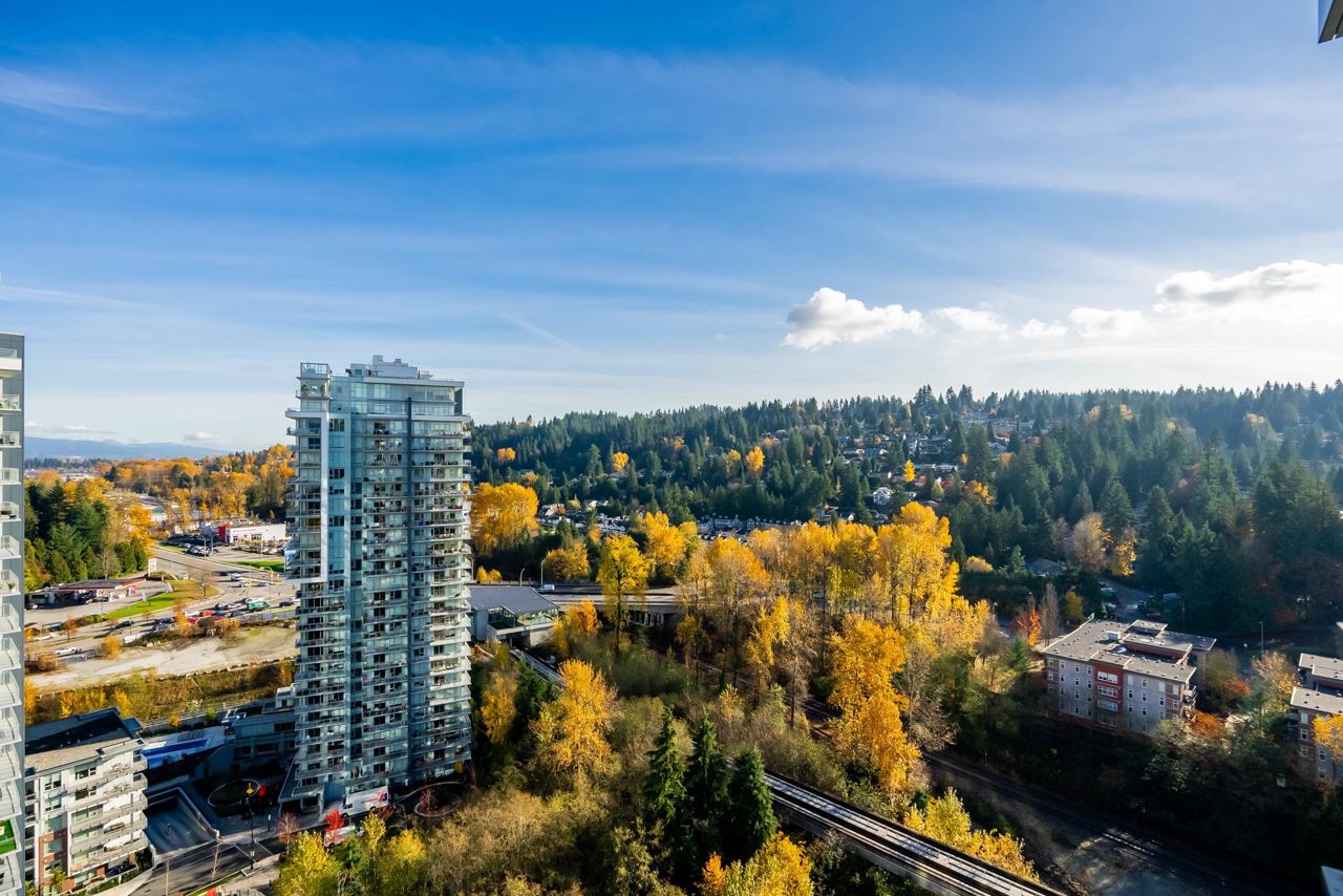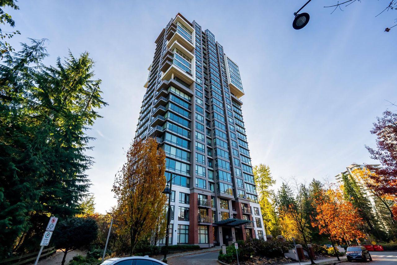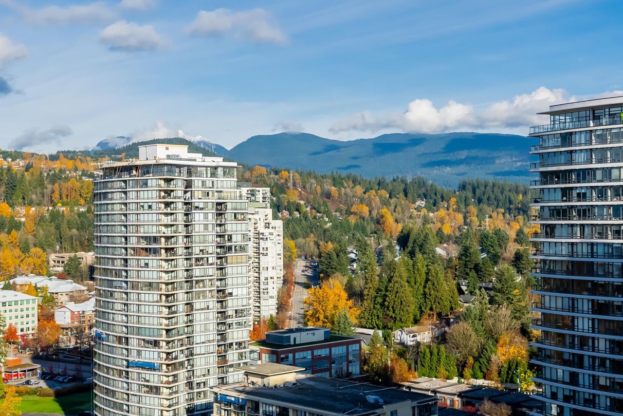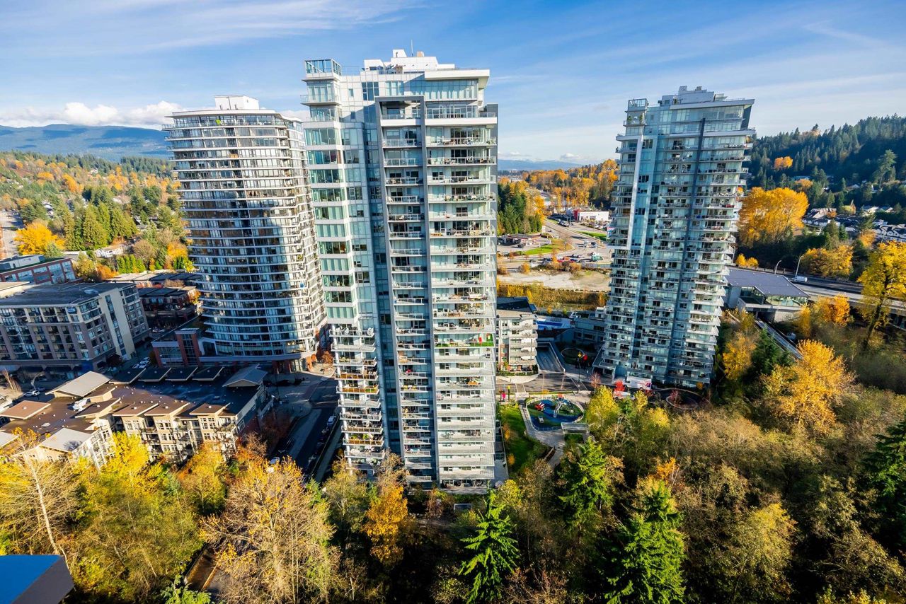 Welcome to the Residences in Suter Brook, Port Moody! This bright and spacious 24th floor 2 BED + OFFICE offers 954 sq ft of sky high living space! Featuring an open plan with an efficient kitchen with quartz countertops, floor to ceiling cabinets, S/S appliances, GAS cooktop and counter seating. Dining leads seamlessly to living, with access to a covered, private balcony. Bedrooms are located on either side of the living room for privacy, primary has access to the patio, a large WIC + 4 piece ensuite. Den is perfect for a home office. Floor to ceiling windows stream in natural light! Experience incredible views of the mountains, city and sunrises. Robust amenities and an unbeatable location with walking distance to Suter Brook Village, Skytrain, WCE, Rocky Point, trails & Brewers Row.