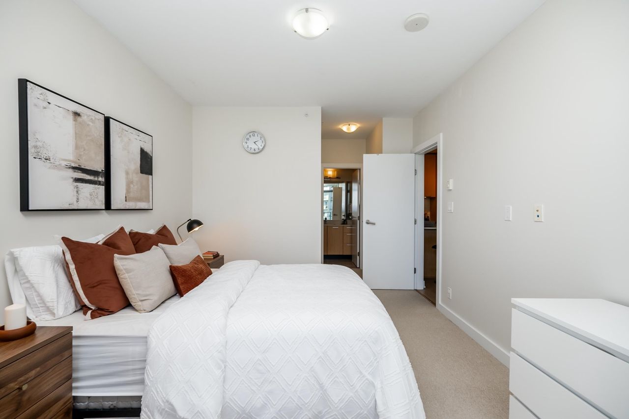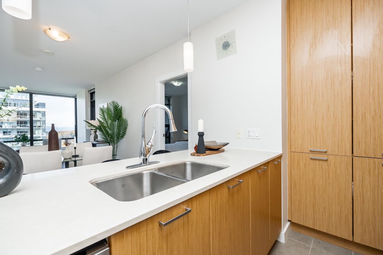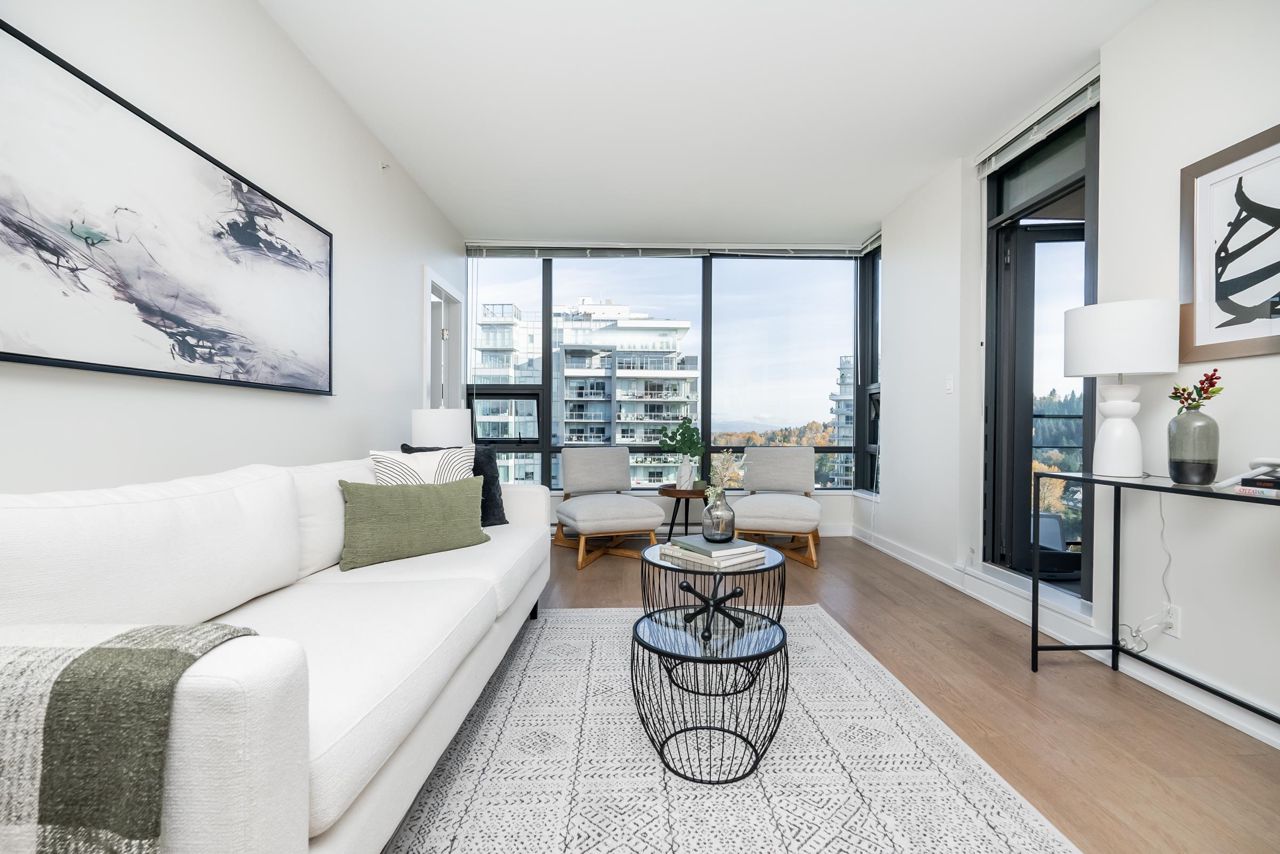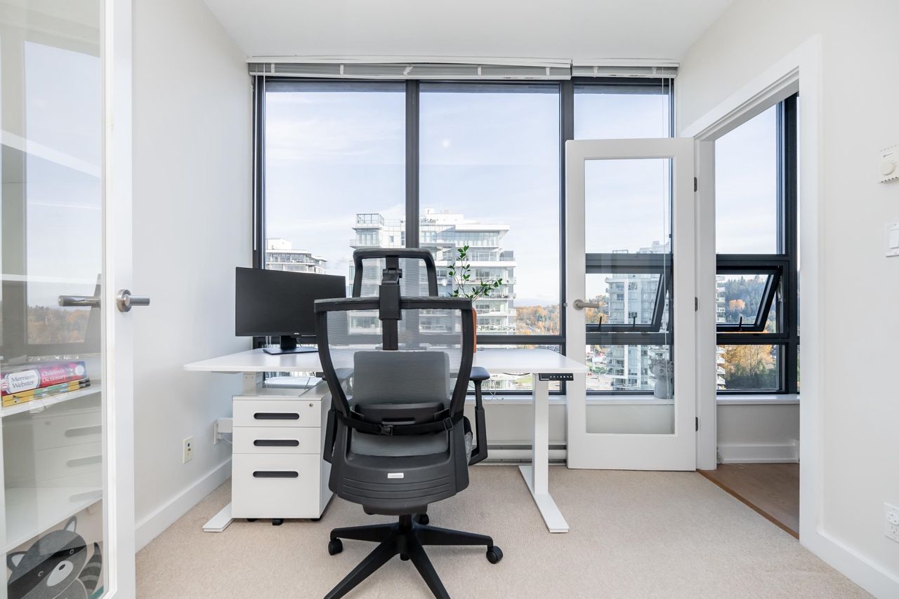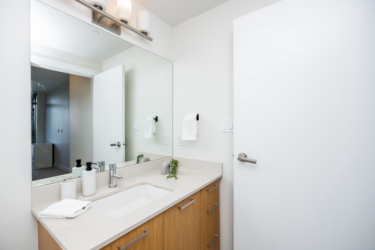 Welcome to the Residences in Suter Brook, Port Moody! This bright and spacious 24th floor 2 BED + OFFICE offers 954 sq ft of sky high living space! Featuring an open plan with an efficient kitchen with quartz countertops, floor to ceiling cabinets, S/S appliances, GAS cooktop and counter seating. Dining leads seamlessly to living, with access to a covered, private balcony. Bedrooms are located on either side of the living room for privacy, primary has access to the patio, a large WIC + 4 piece ensuite. Den is perfect for a home office. Floor to ceiling windows stream in natural light! Experience incredible views of the mountains, city and sunrises. Robust amenities and an unbeatable location with walking distance to Suter Brook Village, Skytrain, WCE, Rocky Point, trails & Brewers Row.
