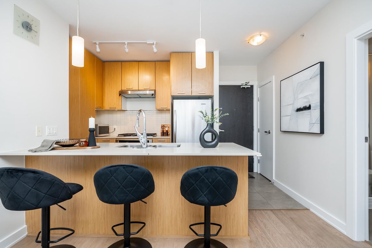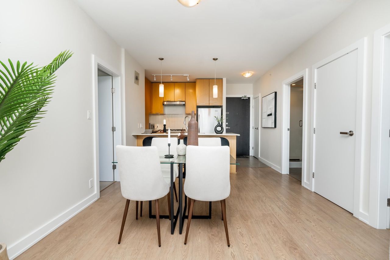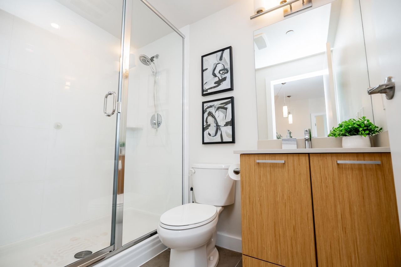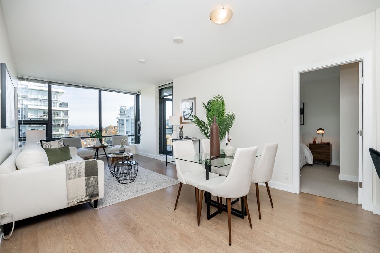 Welcome to the Residences in Suter Brook, Port Moody! This bright and spacious 24th floor 2 BED + OFFICE offers 954 sq ft of sky high living space! Featuring an open plan with an efficient kitchen with quartz countertops, floor to ceiling cabinets, S/S appliances, GAS cooktop and counter seating. Dining leads seamlessly to living, with access to a covered, private balcony. Bedrooms are located on either side of the living room for privacy, primary has access to the patio, a large WIC + 4 piece ensuite. Den is perfect for a home office. Floor to ceiling windows stream in natural light! Experience incredible views of the mountains, city and sunrises. Robust amenities and an unbeatable location with walking distance to Suter Brook Village, Skytrain, WCE, Rocky Point, trails & Brewers Row.