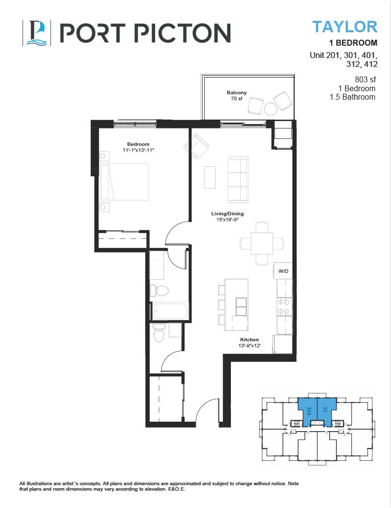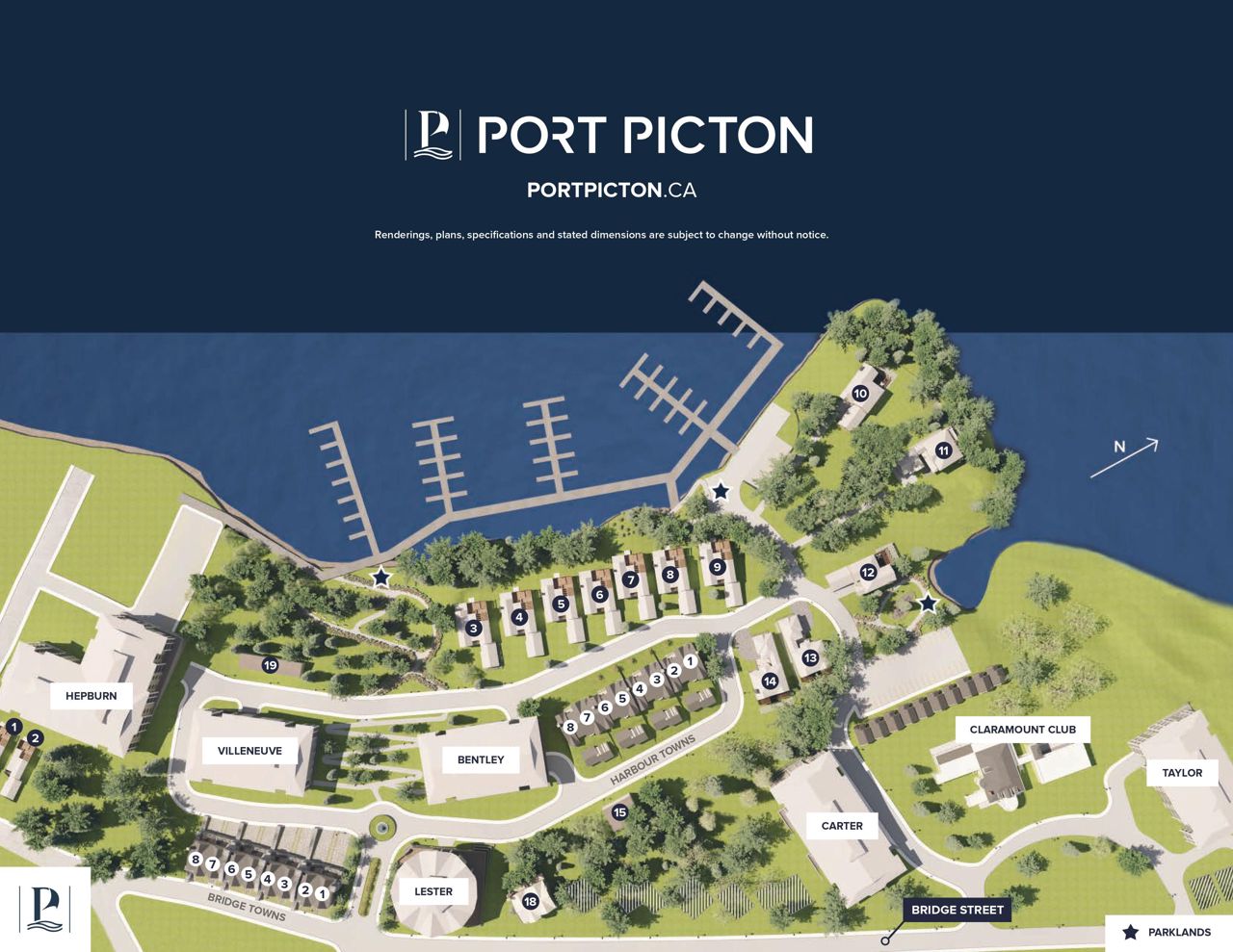 PORT PICTON - A luxury Harbourfront Community by PORT PICTON HOMES: The TAYLOR building - Enjoy the ease of stylish condominium living! This building hosts 42 condo suites with balconies or terraces, climate controlled underground parking and storage lockers. Suite 412 (803 sq ft) features spacious bedroom, 1.5 bathrooms, expansive kitchen and living room looking out to your balcony. Standard features include engineered hardwood throughout, quartz countertops, tiled showers/tubs, and more. It's a quick walk to the Claramount Club that will host a new fine dining restaurant and pub, spa, fitness facility, indoor lap pool, tennis court. Experience the tranquility of Port Picton with freedom from property maintenance. Condo/common fees $256.96/mth