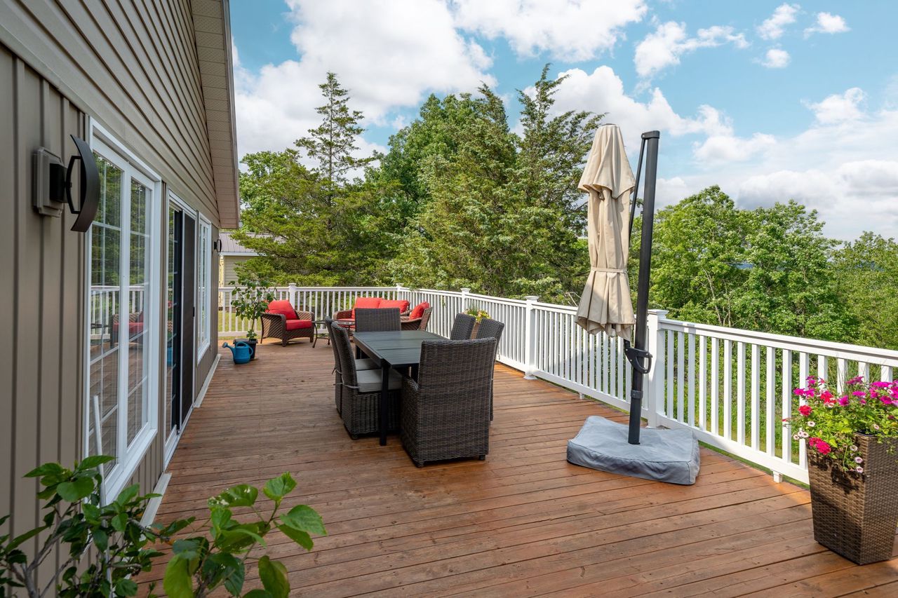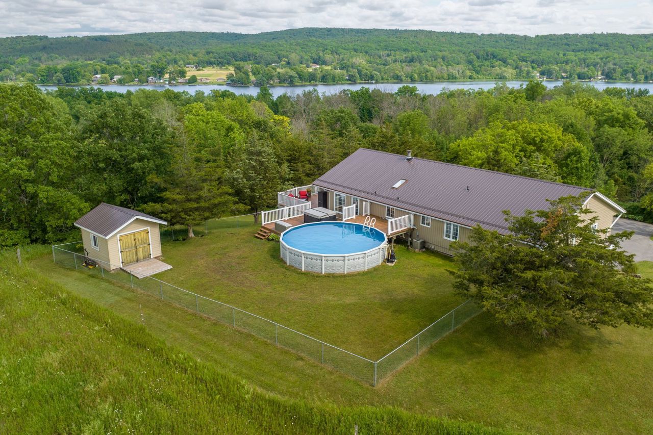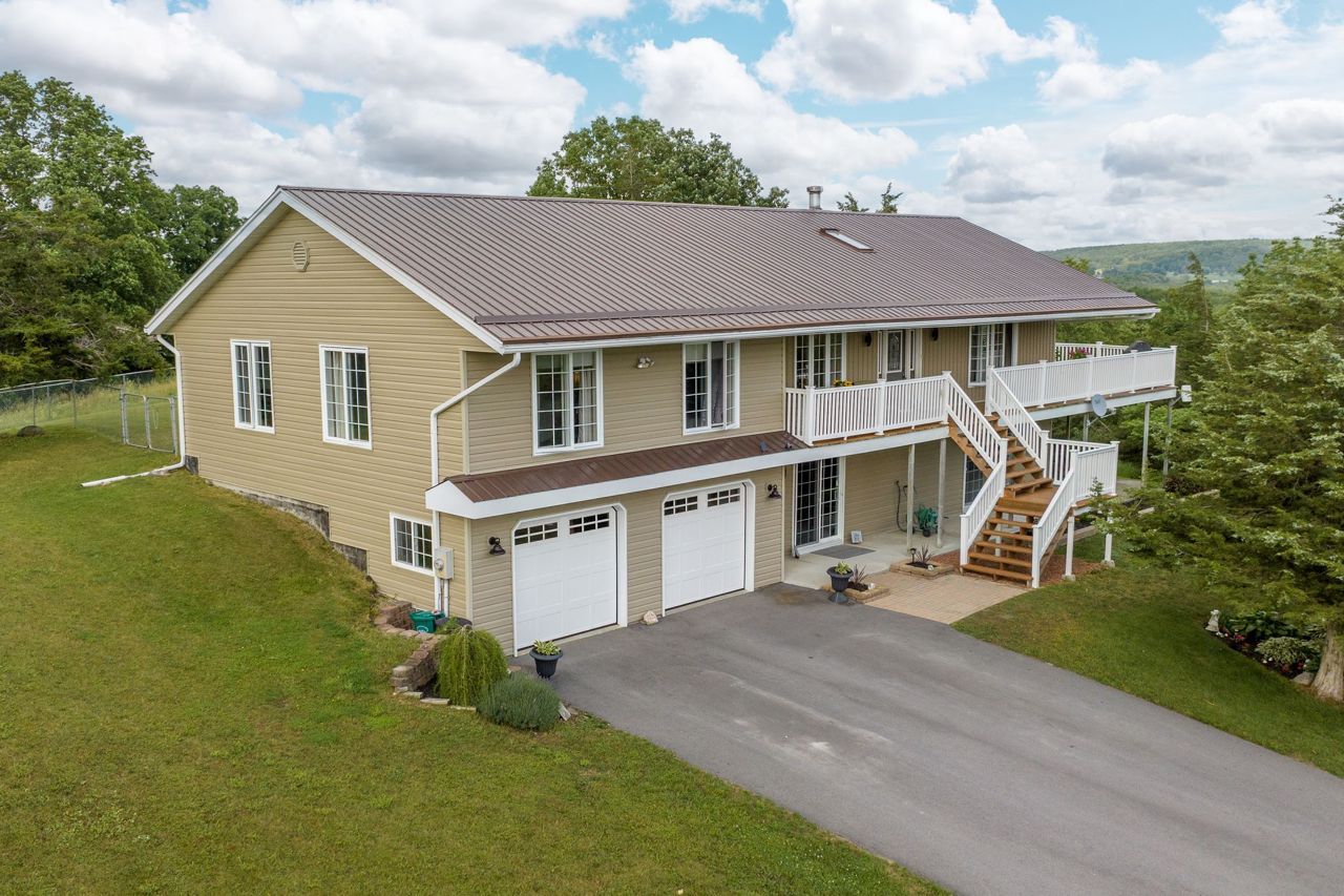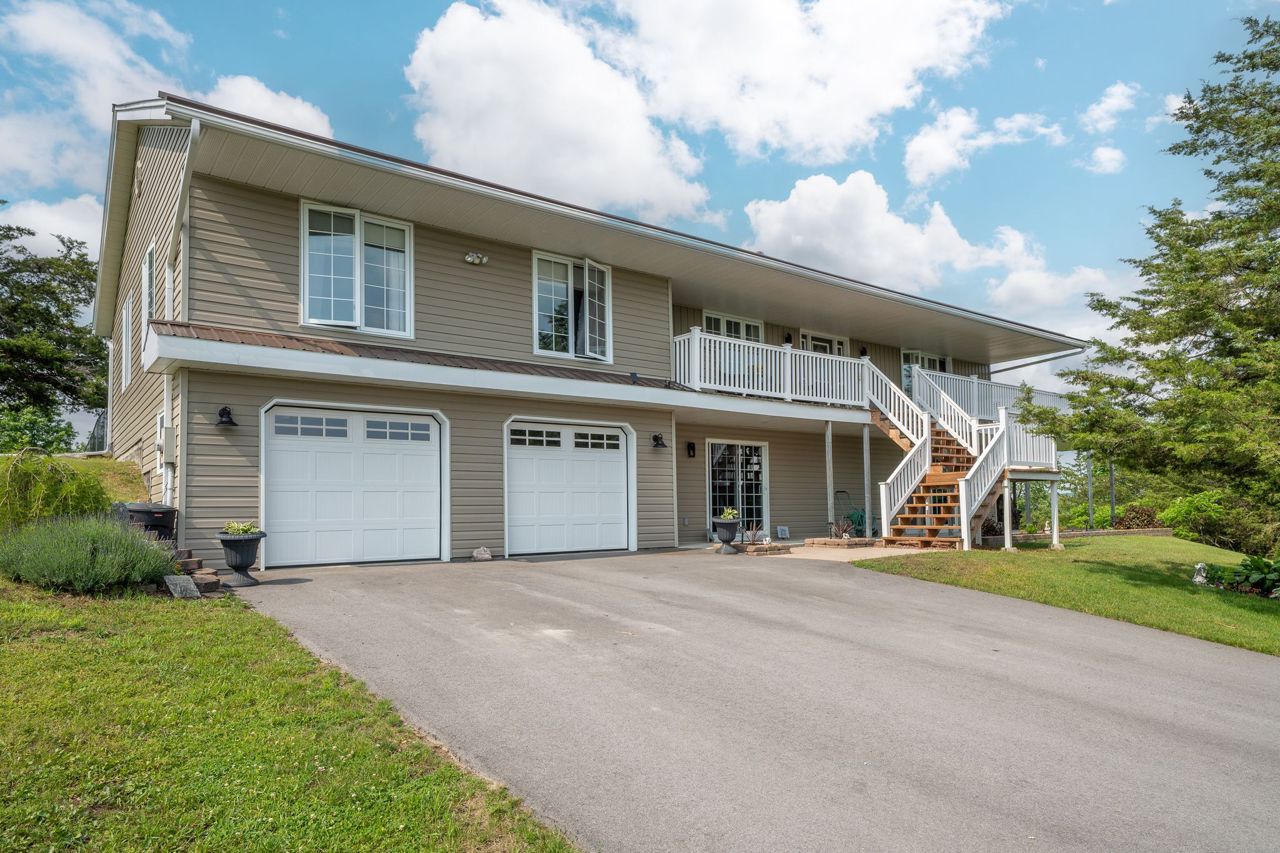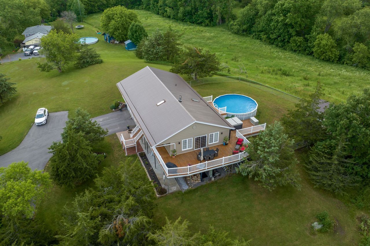 Pristine hilltop bungalow on 2.5 acres with million dollar views -- you can see for miles & miles... the river, the lights at night at the Batawa Ski Hill, 4 seasons of exquisite beauty . Main level has over 2000 sq.ft. of living space. Entertain with ease in the open concept living/dining/kitchen with hardwood & ceramic floors, cathedral ceiling and full size windows all around, stainless kitchen appliances/pantry & island, plus the ambiance of the wood burning fireplace on those chilly fall & winter days! Huge m/bedroom (approx.20ft x 24ft) with additional double walk in closet and 4 pc ensuite. Two more bedrooms on main, 4pc bath with hide away laundry area, propane heat, central air, generous foyer w/skylight, 4ft wide hallways. Lower level has infloor heating, massive rec room/games area with wet bar, 3pc bath, mechanical room and attached 4 bay garage (2wide x 2 deep, drywalled). Exterior updates include vinyl siding, metal roof, paved drive, wrap around deck with vinyl railing.Enjoy the above ground pool and hot tub --plus fenced backyard , storage shed, fire pit and more storage under the deck.