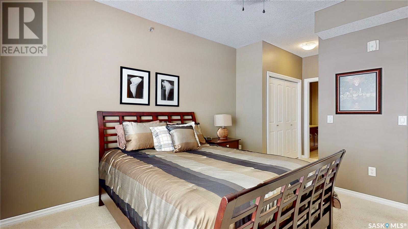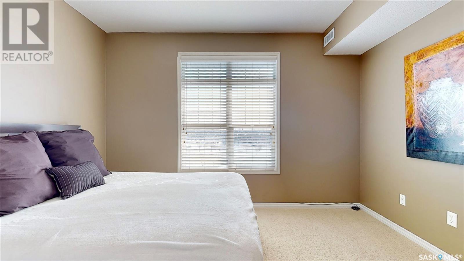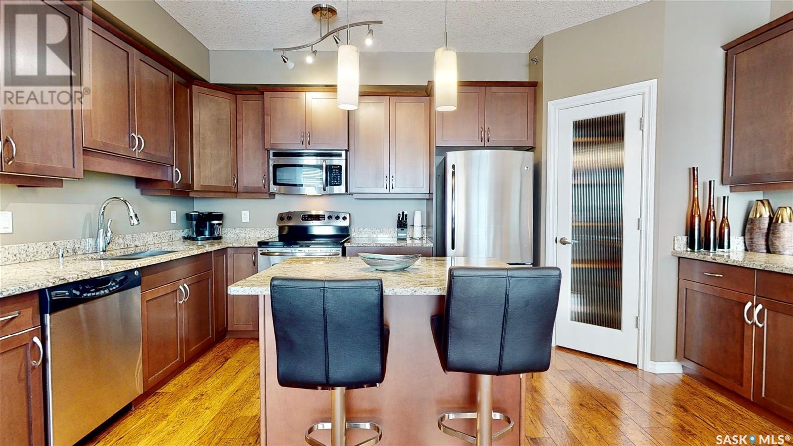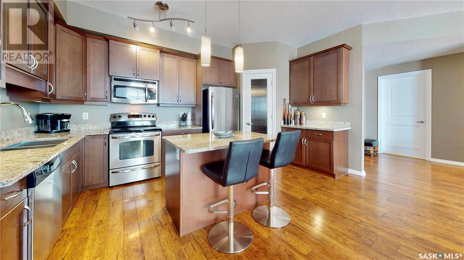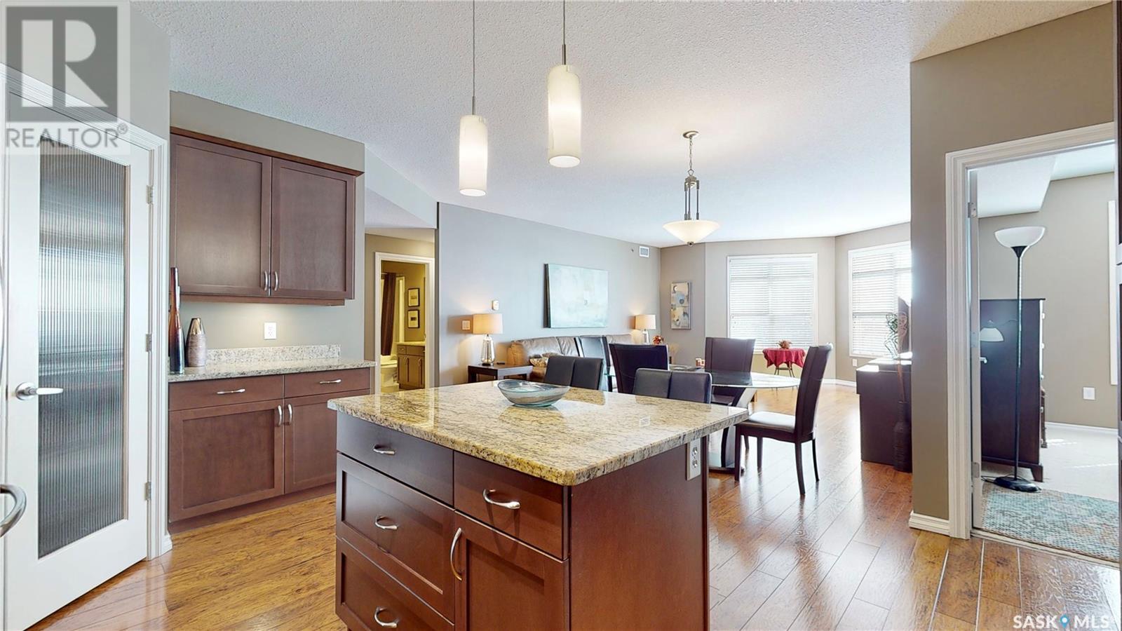 Welcome to this rare chance to own an executive 2 bedroom 2 bathroom top floor unit with a view of the lake. This home has been immaculately kept and this well laid out floor plan has neutral tones and is flooded with natural light. The foyer has lots of space with room for an entry table and even a chair. The beautiful large kitchen has tons of dark cabinets, gorgeous granite counters and matching granite back splash as well as an updated stainless steal appliance package. Extra storage is found in the large corner pantry. The kitchen is open to a spacious dining area as well as the large living room with lots of space for company. The generous sized primary bedroom has room for a king sized bed and a full bedroom set. It has a pass through with double closets and a 3 pc en-suite with walk in shower with a built in bench as well as an extra linen closet. Cabinets, granite and fixtures match the kitchen. There is a second spacious bedroom, a 4pc main bathroom with a tub/shower combo/matching finishes and completing this gorgeous unit is the convenient in-suite laundry/utility room. This complex offers security doors, secure heated underground parking with a storage unit and an extra parking stall above ground. There is ample guest parking, a common room with kitchenette, fireplace and pool table and a great community of neighbors. It's a wonderful place to live!! (id:22211)