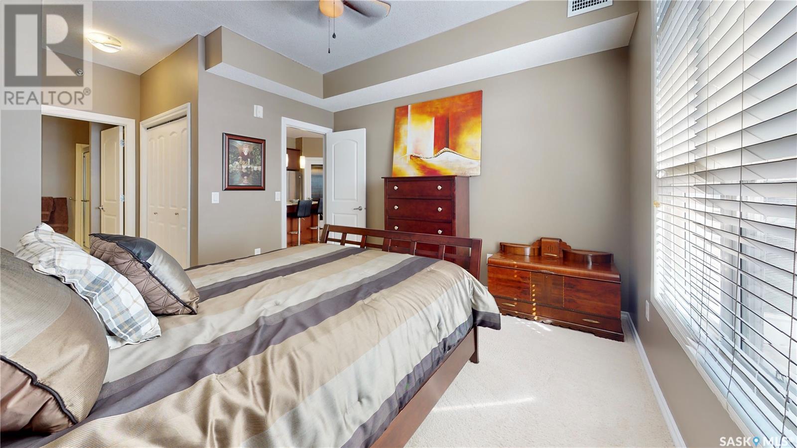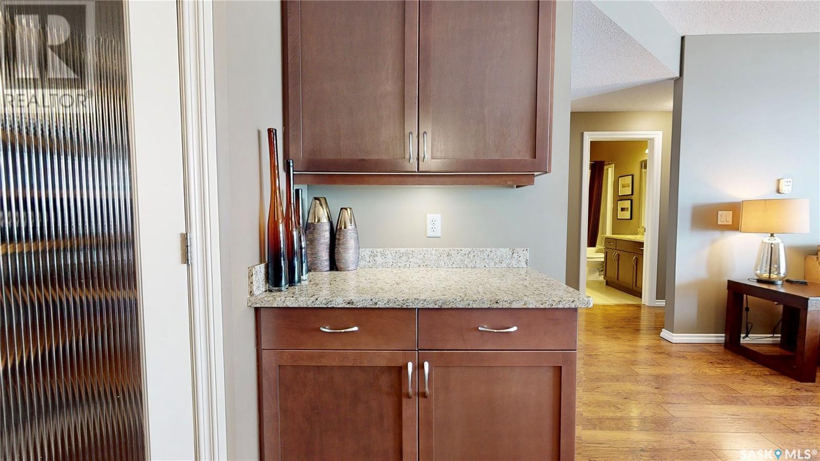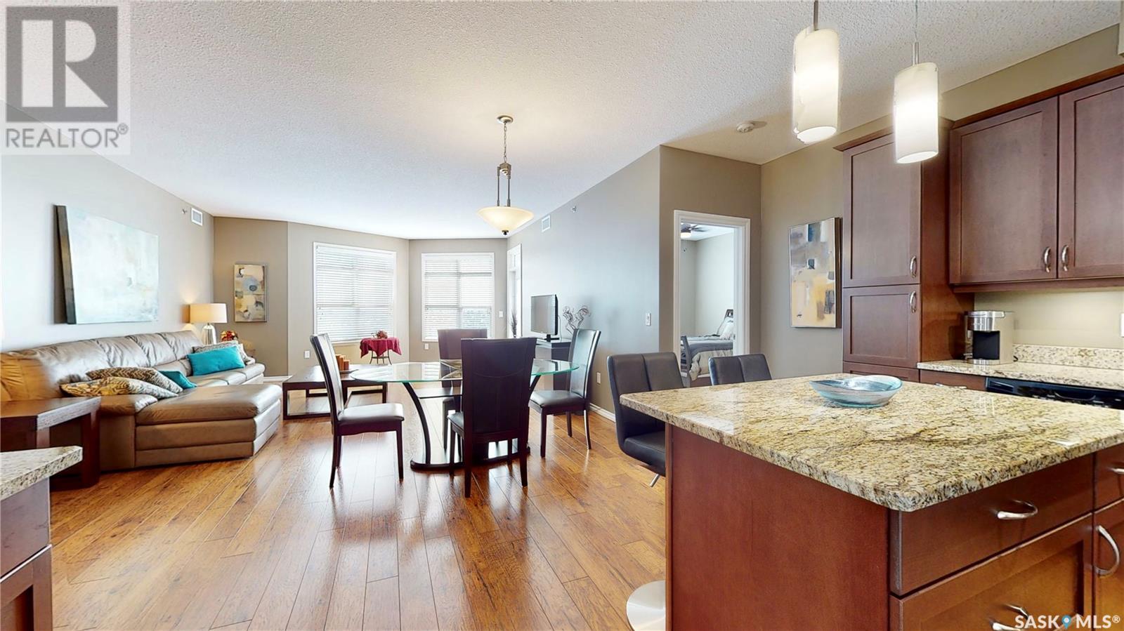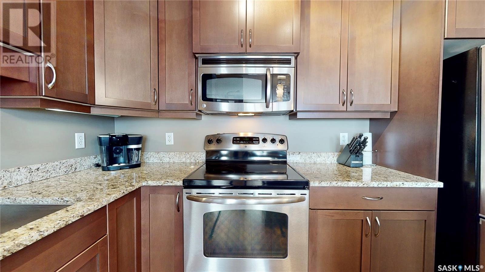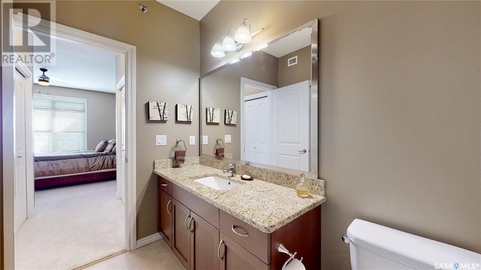 Welcome to this rare chance to own an executive 2 bedroom 2 bathroom top floor unit with a view of the lake. This home has been immaculately kept and this well laid out floor plan has neutral tones and is flooded with natural light. The foyer has lots of space with room for an entry table and even a chair. The beautiful large kitchen has tons of dark cabinets, gorgeous granite counters and matching granite back splash as well as an updated stainless steal appliance package. Extra storage is found in the large corner pantry. The kitchen is open to a spacious dining area as well as the large living room with lots of space for company. The generous sized primary bedroom has room for a king sized bed and a full bedroom set. It has a pass through with double closets and a 3 pc en-suite with walk in shower with a built in bench as well as an extra linen closet. Cabinets, granite and fixtures match the kitchen. There is a second spacious bedroom, a 4pc main bathroom with a tub/shower combo/matching finishes and completing this gorgeous unit is the convenient in-suite laundry/utility room. This complex offers security doors, secure heated underground parking with a storage unit and an extra parking stall above ground. There is ample guest parking, a common room with kitchenette, fireplace and pool table and a great community of neighbors. It's a wonderful place to live!! (id:22211)