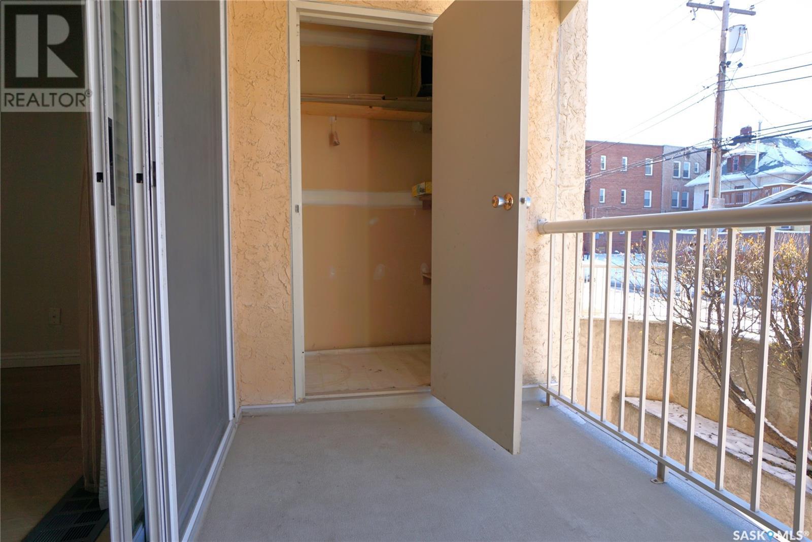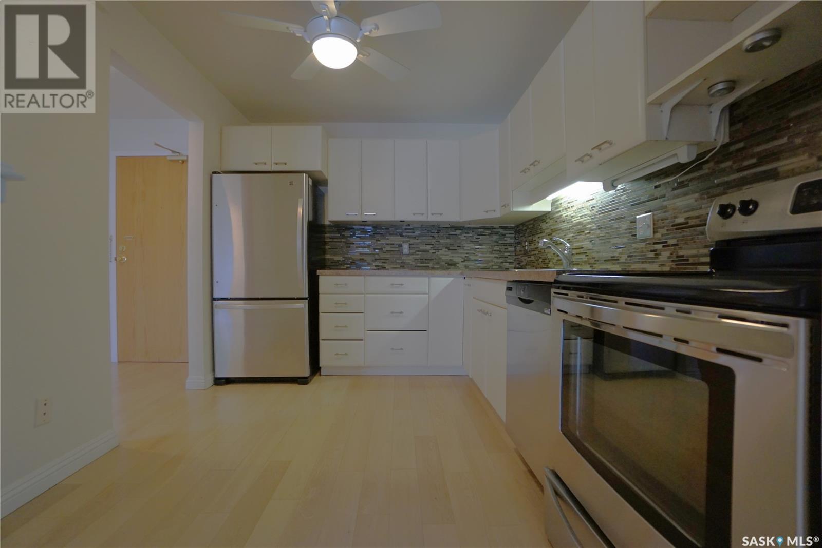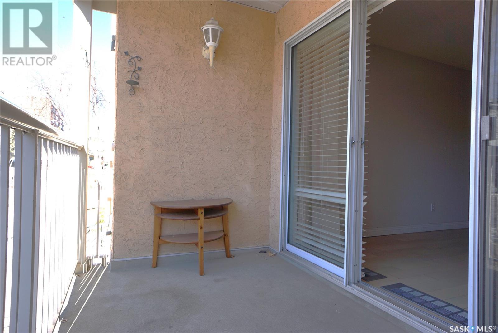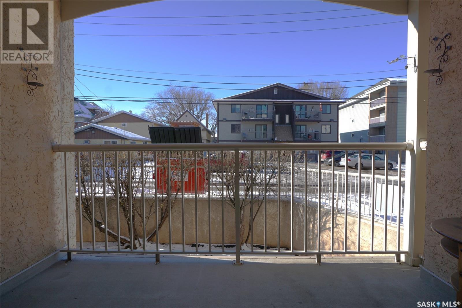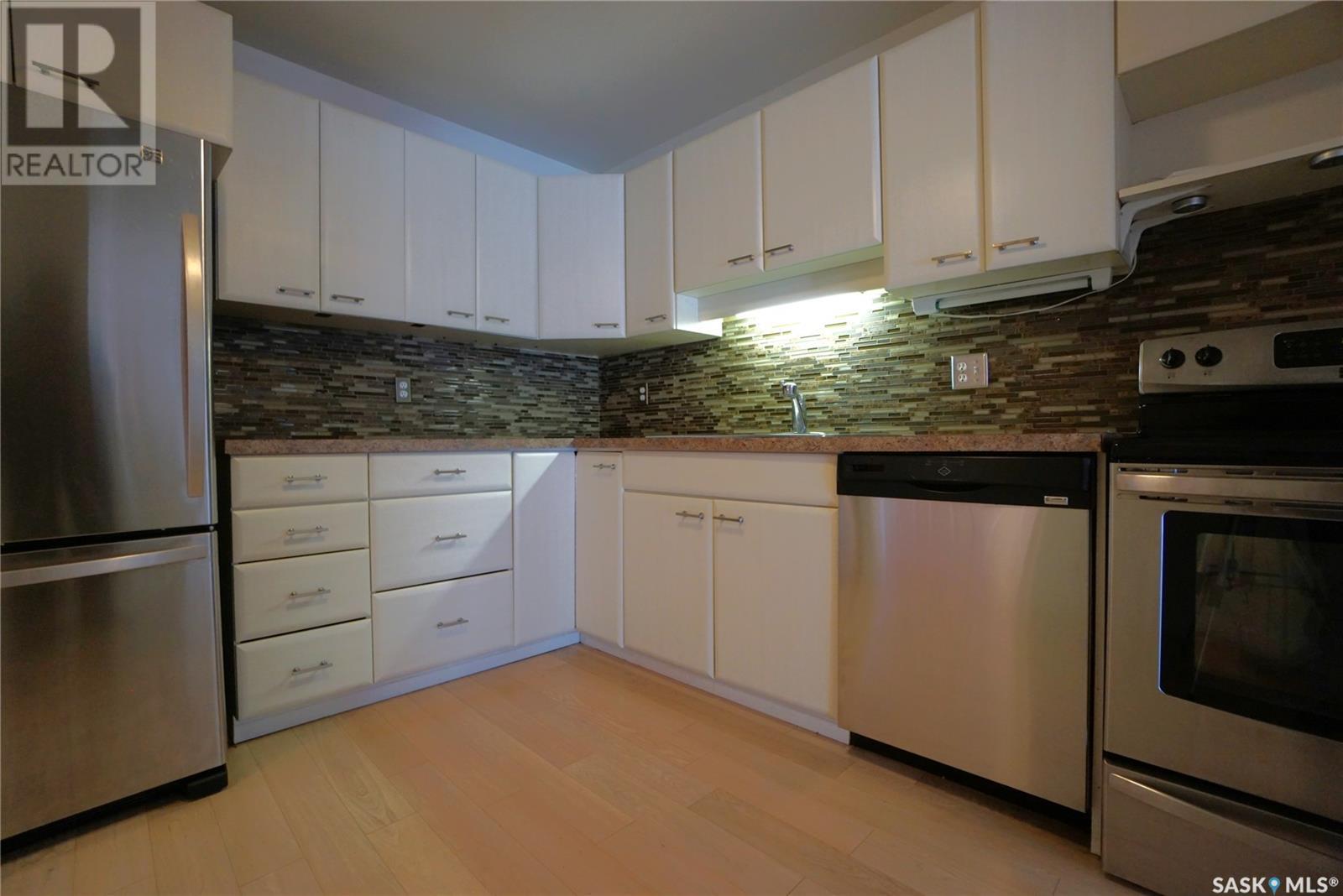 This fantastic condo is located close to Wascana Park and a 5 minute walk to Cathedral or down town. Great floor plan with spacious living room, featuring newer flooring and a private balcony that overlooks the court yard and offers additional storage. The kitchen has been updated with light and modern flat panel cabinets, counter tops, mosaic tile backsplash and stainless-steel appliances. The generous size bedroom can fit a king size bed and features a walk-in closet. Completing this home is a full four-piece bath, linen closet, and good sized laundry/storage area. The condo comes complete with 1 underground parking spot. This quiet, well-maintained building also has an amenities room with walk-out patio. Condo fees include; heat, water, common area and external building maintenance, insurance, garbage and reserve fund. Schedule your showing today! (id:22211)