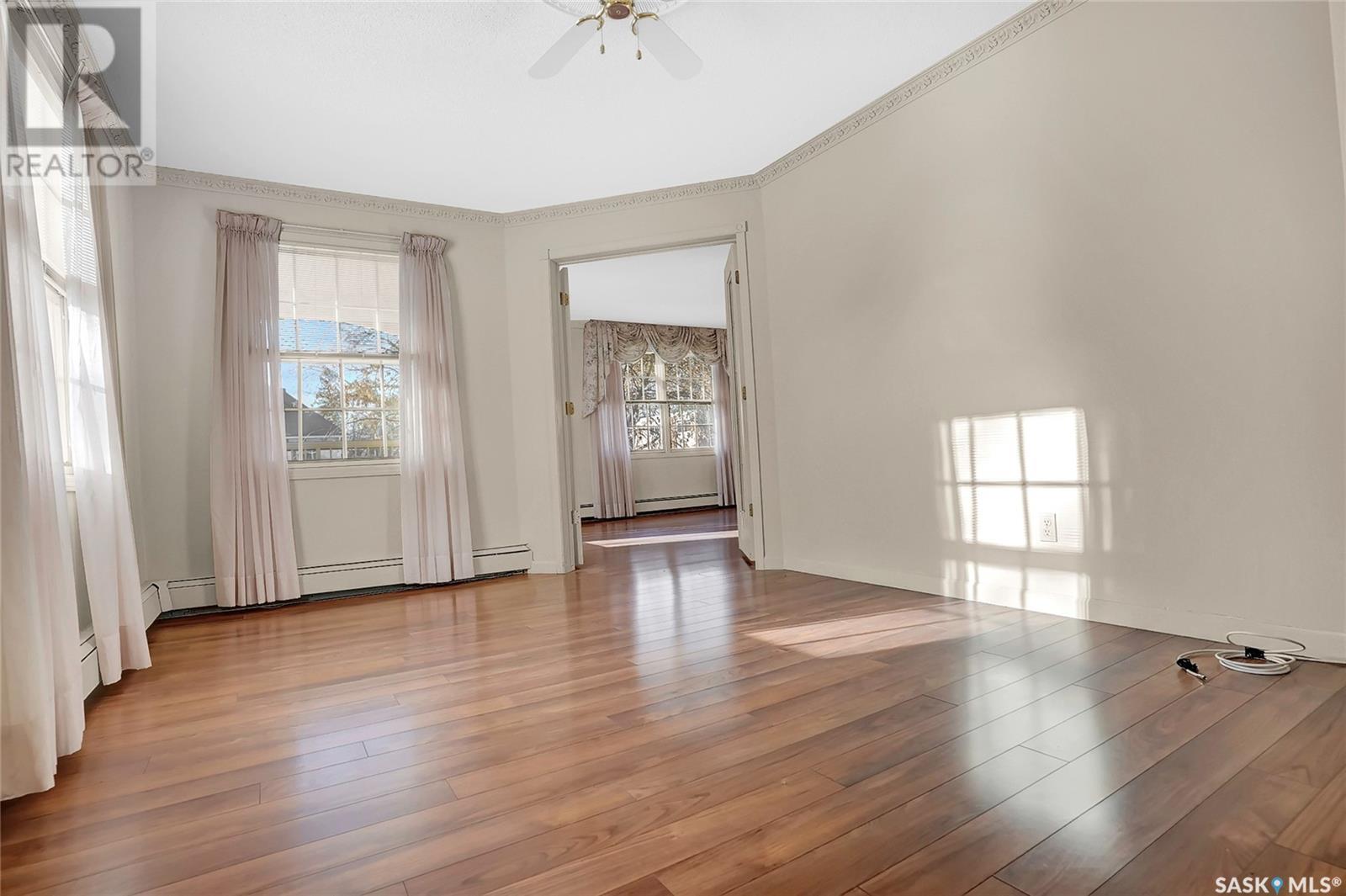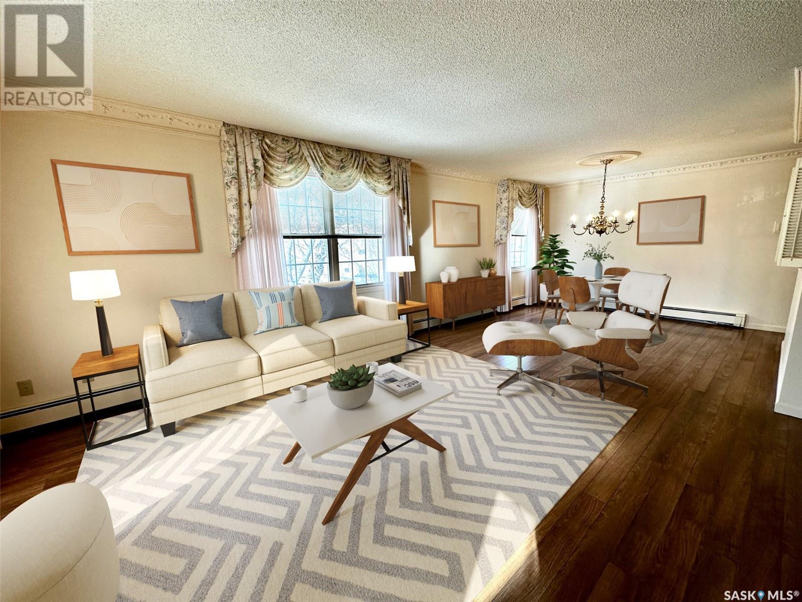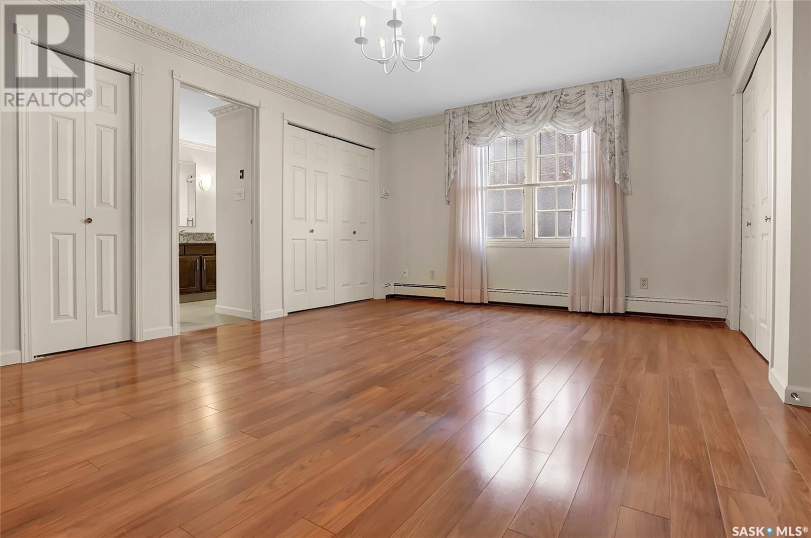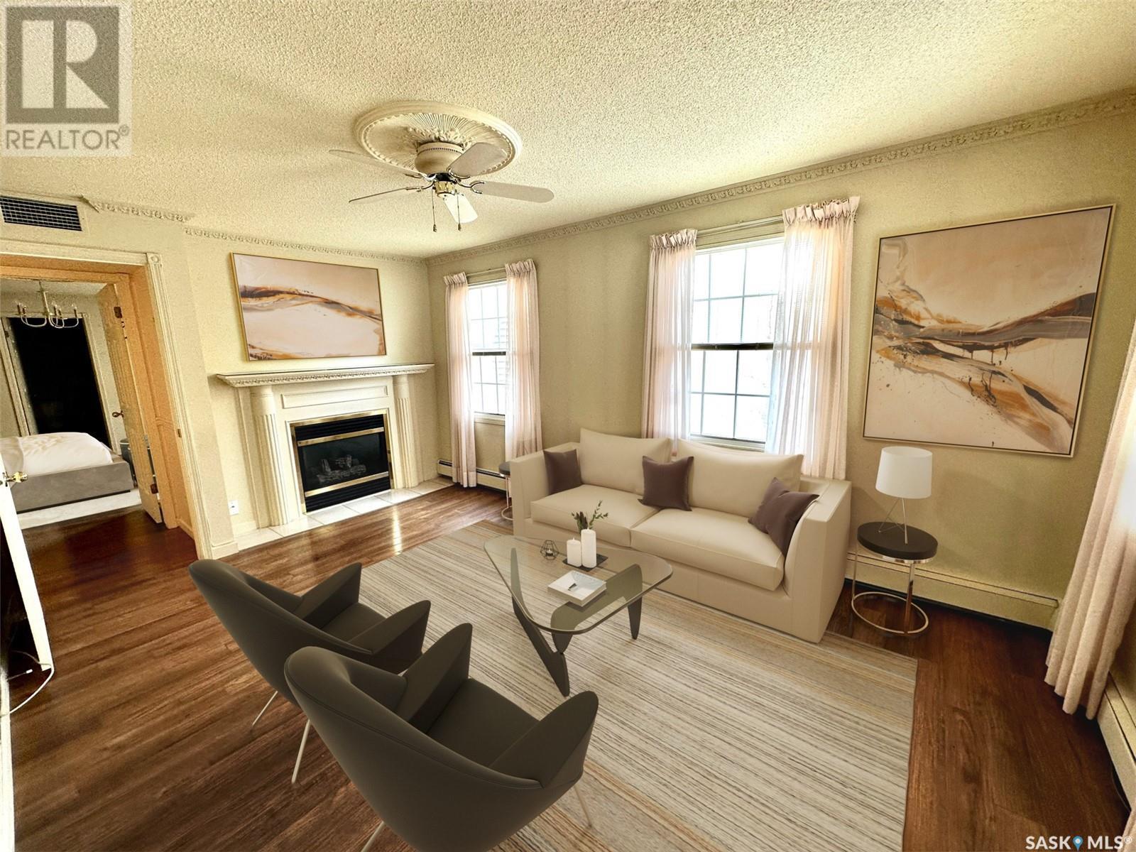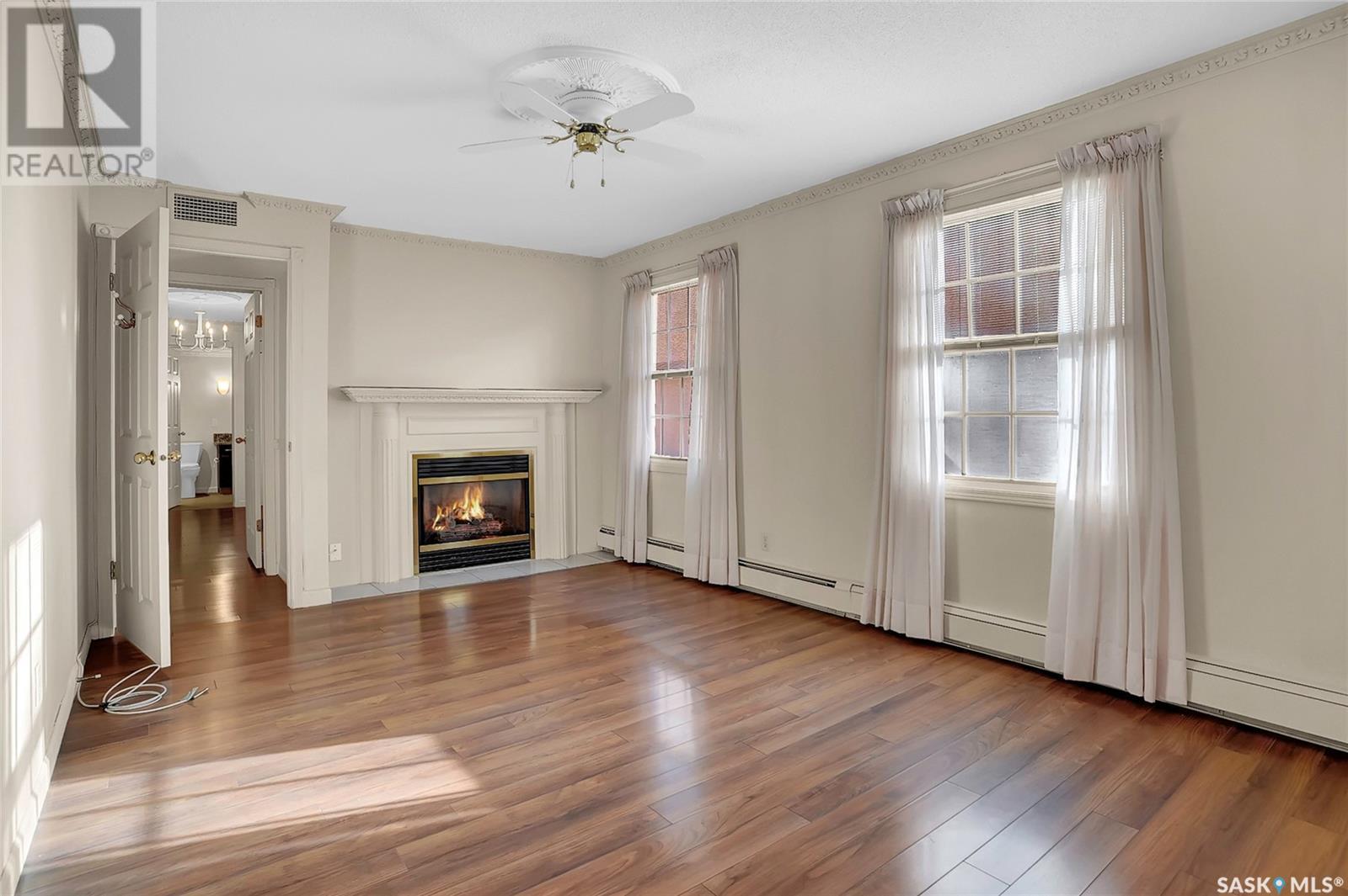 Welcome to #201 - 2315 Cornwall St! This exceptional and rare almost 1800 sq ft condo is ready for it's new owner. This home has been meticulously cared for by its original owner and features upgraded finishes and calm, comfortable tones throughout. The complex is located ideally in Regina's Transition Area, making it very walkable to all amenities and downtown living. Inside this unit you will find a large foyer area welcoming you into this executive style apartment. A handy full bath is located adjacent the front entry, as well as a large storage room and laundry with built in cabinetry. The sitting room is ideal for entertaining and is flanked by the family room, dining room, and kitchen. The kitchen offers an incredible amount of storage space, is well lit, and perfectly laid out to make even the most difficult of dinner parties a breeze. The dining area is large enough to accommodate even up to 10 for dinner, and gives way to the second family room space. There is a large secondary bedroom here which could also be an office for the at-home worker. Continuing on, there is a lovely and private den space featuring tons of natural light and a gas fireplace, with two French doors to accent. The primary bedroom is very large and offers enough room for your entire King Sized bed set, as well as a sitting area, and direct access to the updated ensuite. The ensuite features a deep soaker tub on one side, and beautiful tiled shower on the other, along with modern flooring and built in storage. Finishing off this truly unique property is a large screened in balcony and TWO underground heated parking stalls. Value added items include: all appliances, central air, screened in balcony, gas fireplace, fresh ensuite renovation, condo fees include heat and water, TWO heated underground parking stalls, car wash station, a huge amenities room, workshop, and more! (id:22211)