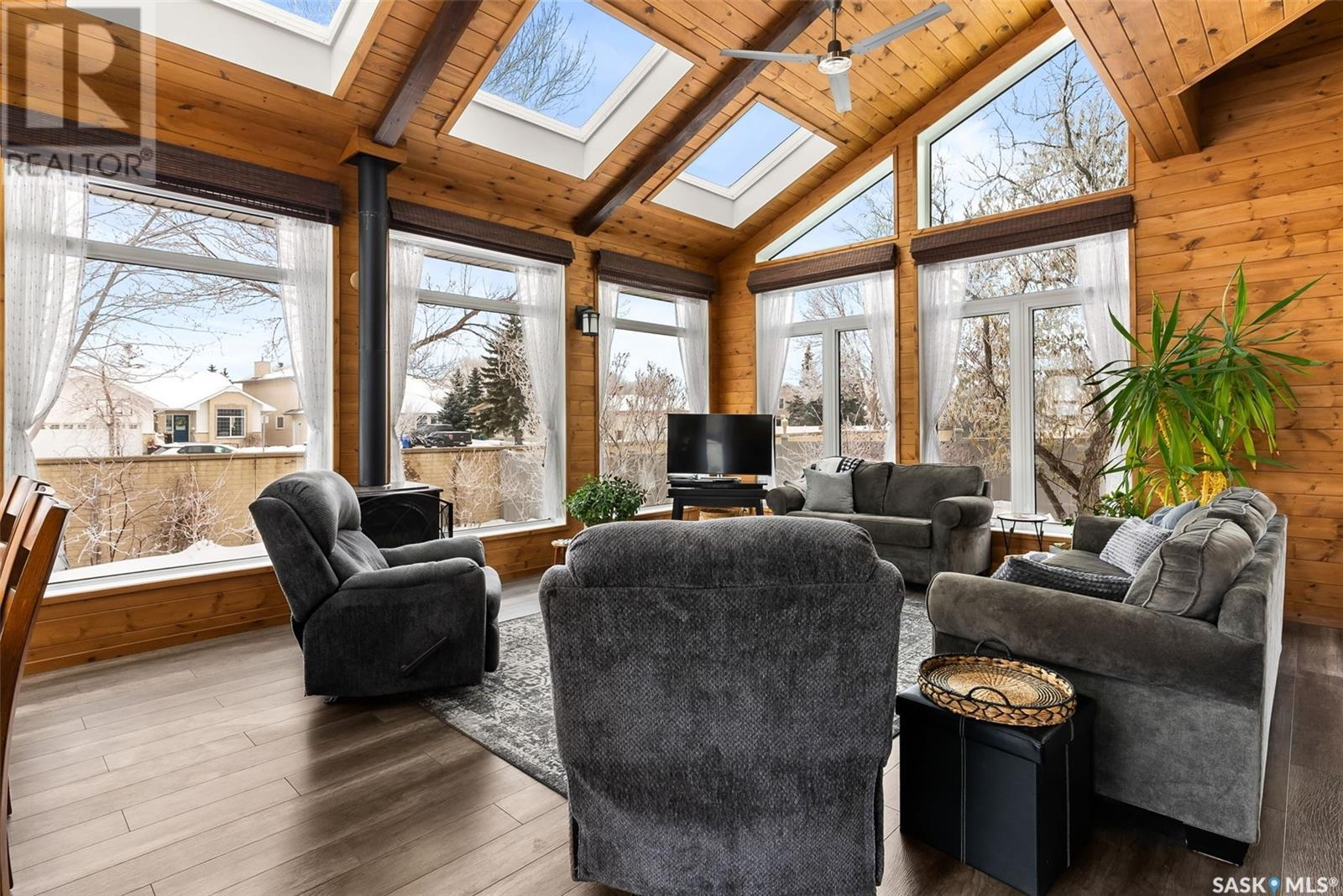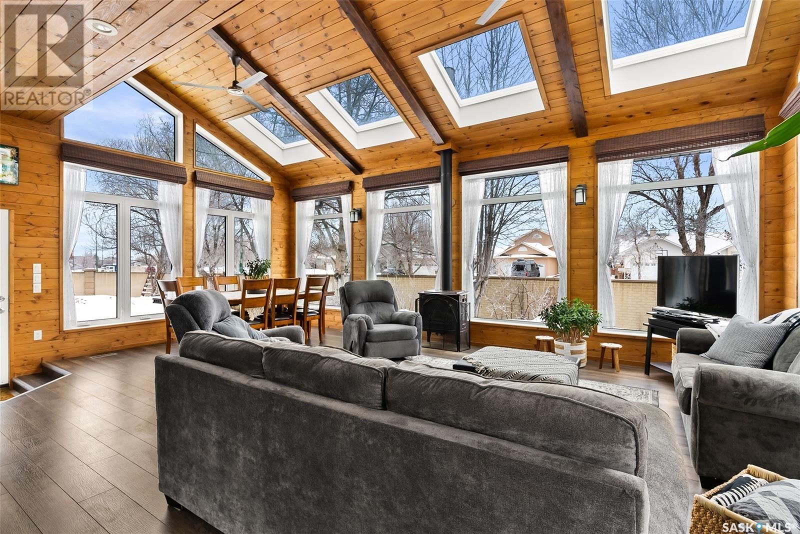 Welcome to your dream home! This stunning residence boasts 6 spacious bedrooms and 3 beautifully appointed bathrooms, perfect for accommodating a growing family. As original owners, the pride of ownership is evident throughout. The home offers a well-thought-out, functional layout perfect for families and professionals alike. From the moment you step inside, the vaulted ceilings and abundant natural light will make you feel right at home. You will love having 3 bedrooms on the main level as well as main floor laundry, making chore time a breeze. Enjoy the expansive 4-season sunroom, featuring exquisite tongue and groove pine and a cozy gas fireplace, an ideal space for relaxation or entertaining year-round. With triple-pane, Low E Argon-filled windows, you’ll experience energy efficiency and comfort no matter the season. Step outside to a serene backyard that backs onto a picturesque park, providing a peaceful retreat just steps from your door. The back yard is a gardener’s dream! Featuring mature trees, colourful perennials, and a vegetable patch for fresh homegrown produce. Families will appreciate the convenience of being mere moments away from Jack Mackenzie Elementary and Saint Gabriel School. Additionally, the separate entrance through the sunroom to the basement opens up exciting possibilities for a home office or a business venture such as a daycare. The wall between the rec room and the office is temporary and can be removed if you’d like a larger open space. Located in the desirable Windsor Park area, this home is just minutes away from the Sandra Schmirler Leisure Centre, offering various recreational activities for all ages. You'll also find Brewed Awakening nearby for your coffee fix, along with several gyms, grocery stores, and the Regina Public Library. Enjoy the perfect blend of convenience and community in this vibrant neighbourhood! Don’t miss your chance to own this remarkable home that combines comfort, functionality, and location! (id:22211)