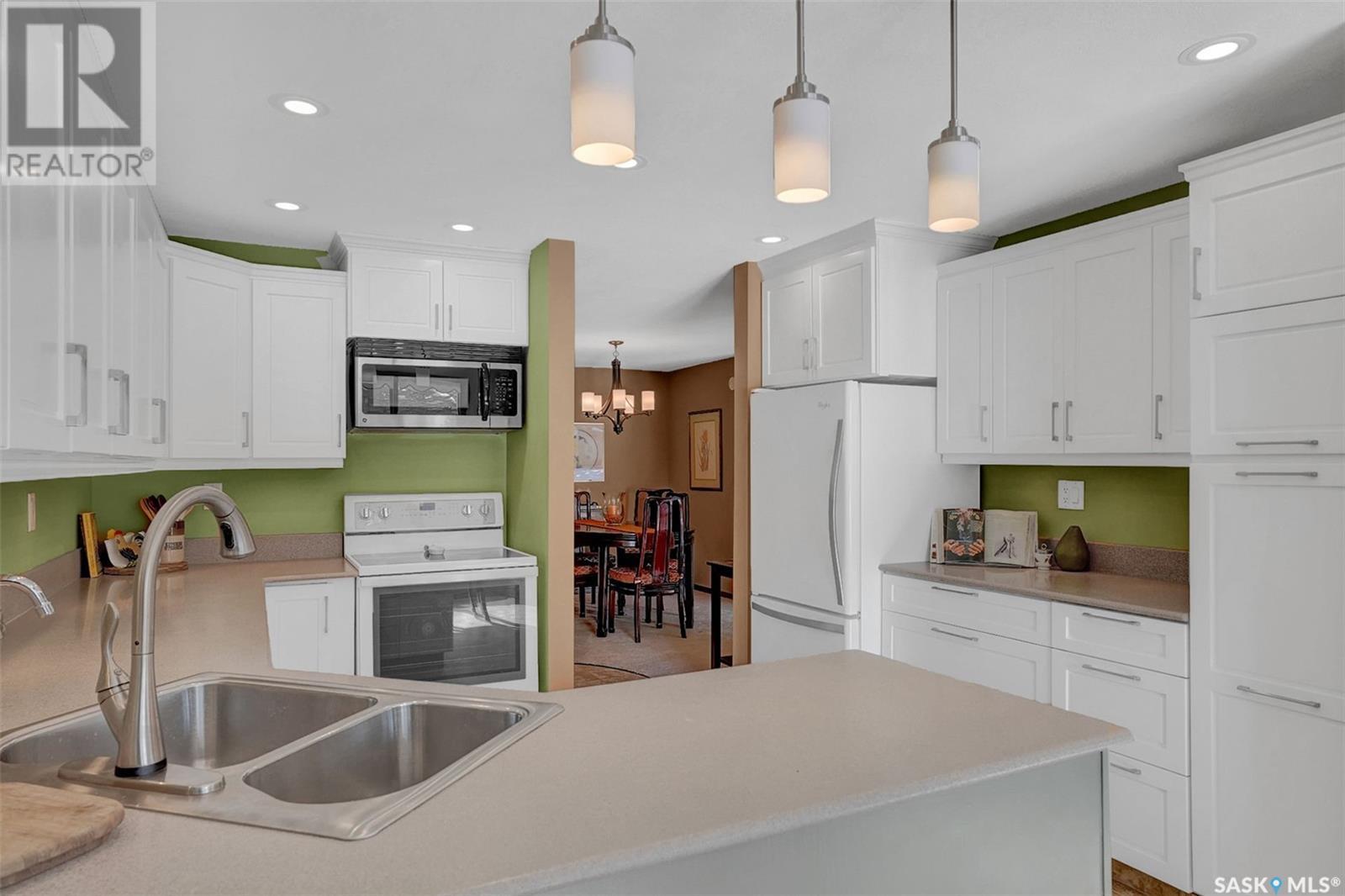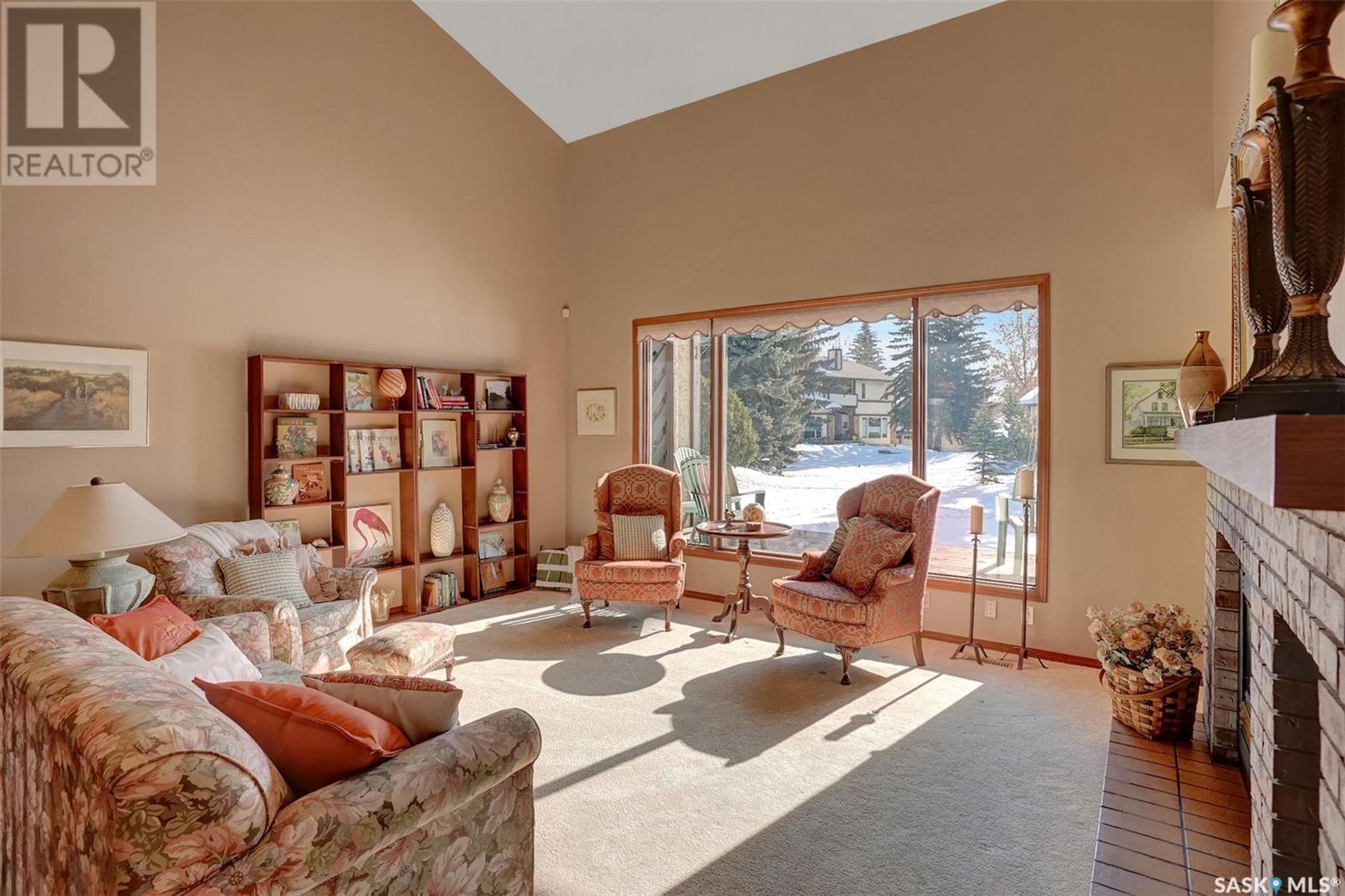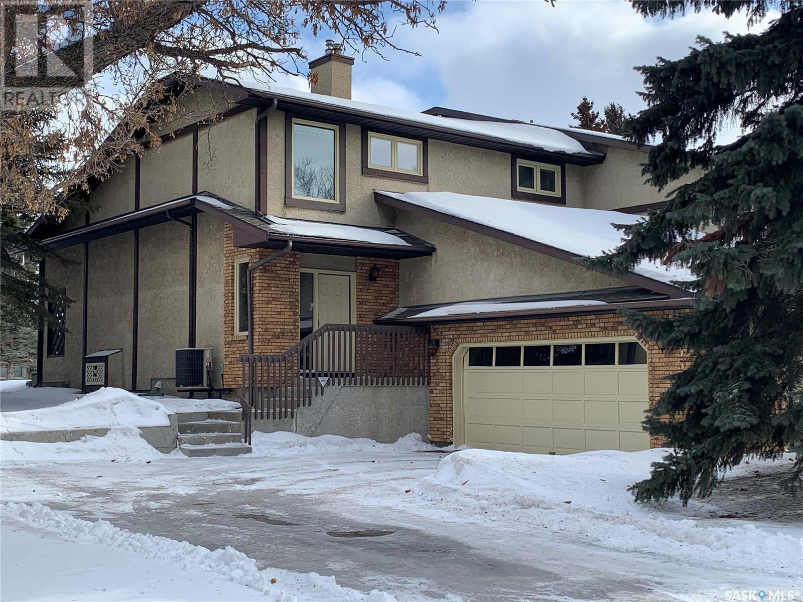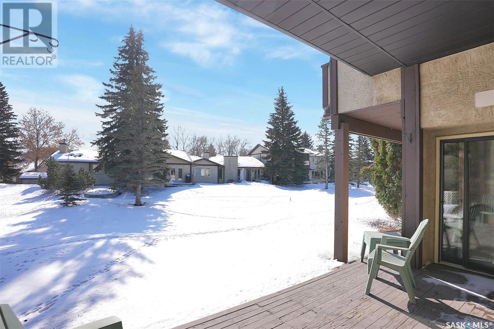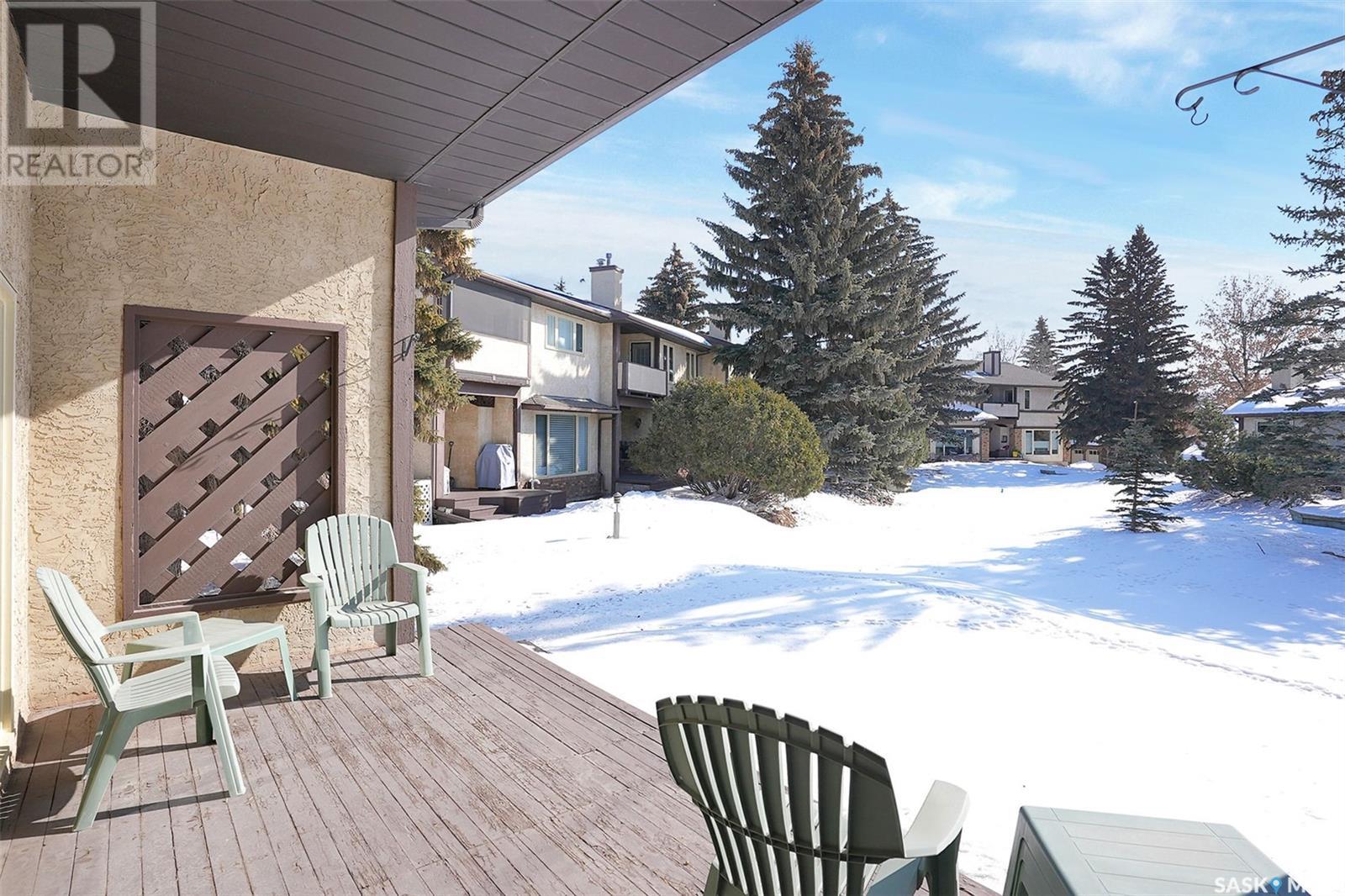 Flooded with sunlight, this 1,800 two storey condo is ready for new owners to call it home. Located in the Stratford Place complex in Regina’s Gardiner Park neighbourhood, this end unit offers 2 bedrooms, 4 bathrooms and double attached garage and visitor parking close to the unit. The front entrance is spacious with a modern chandelier and overlooks the sunken living room that is flooded with sunlight from the large windows that offer views of the greenspace behind your unit. The living room is highlighted with a vaulted ceiling and gas fireplace with a stunning brick surround. The kitchen has plenty of white cabinetry and a large kitchen dining space with windows that overlook the greenspace and a patio door that leads onto your deck, a quiet place to enjoy your morning coffee in the summer months. There is a separate formal dining space on the other side of the kitchen, a large pantry and a 2 pc bathroom. Plus, there is the ability to add in main floor laundry if desired. Upstairs houses both bedrooms and a cozy sitting room that overlooks the sunken living room. The primary bedroom is a generous size featuring a balcony with greenspace views, 2 closets and an ensuite with soaker tub and separate shower, the perfect bedroom oasis. The second bedroom also has a 4 pc ensuite. The basement is fully developed, you’ll find the laundry room with cabinets, counter space, extra space for storage, a family room with plush carpets, and 2 dens, one with a nice sized closet and another that is great for storage, craft or hobby room. If you’ve been searching for a condo because it is low maintenance but want the size and feel of a single family home, this is the perfect blend of both. Call your real estate agent and book your showing today! (id:22211)