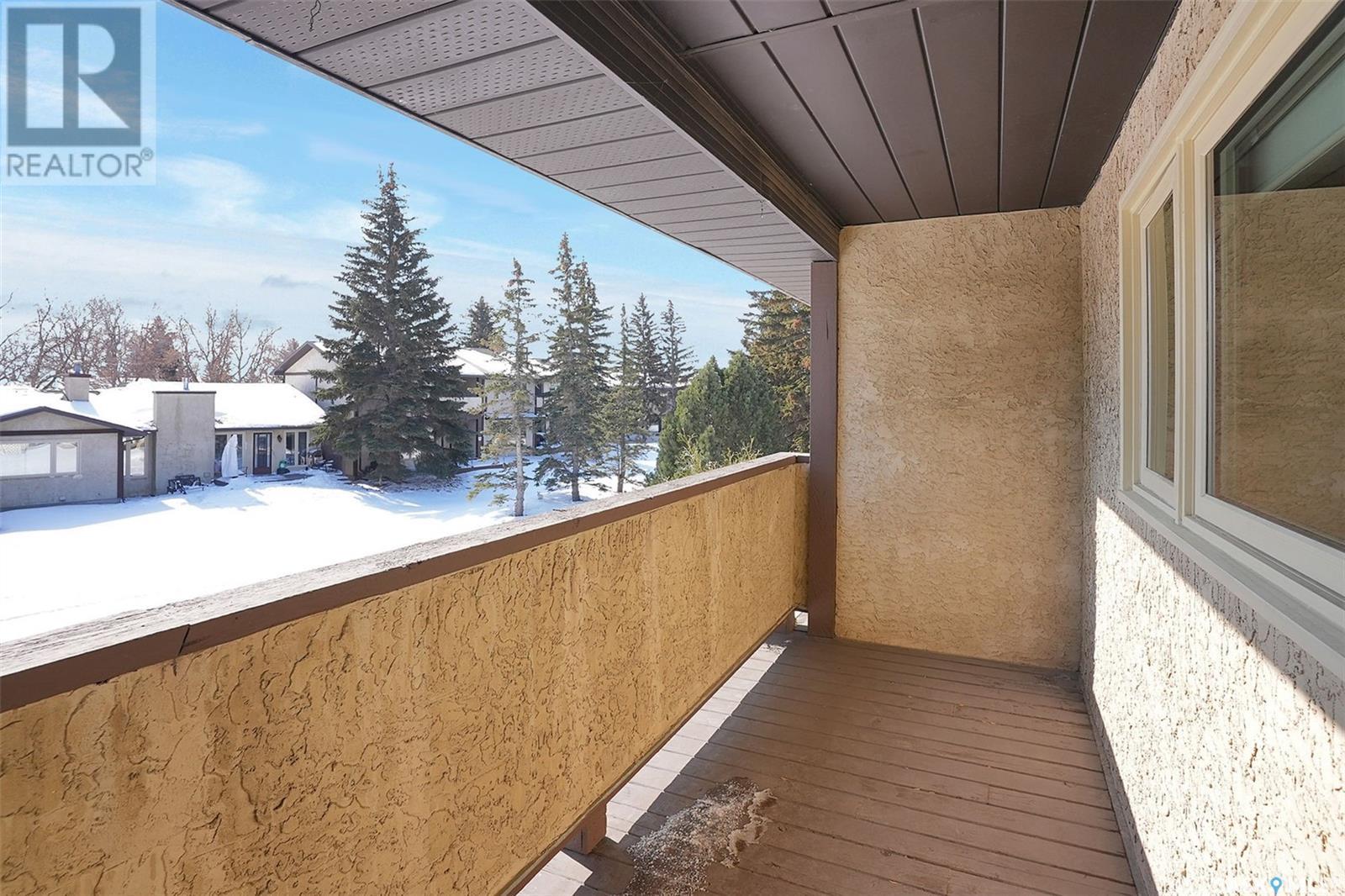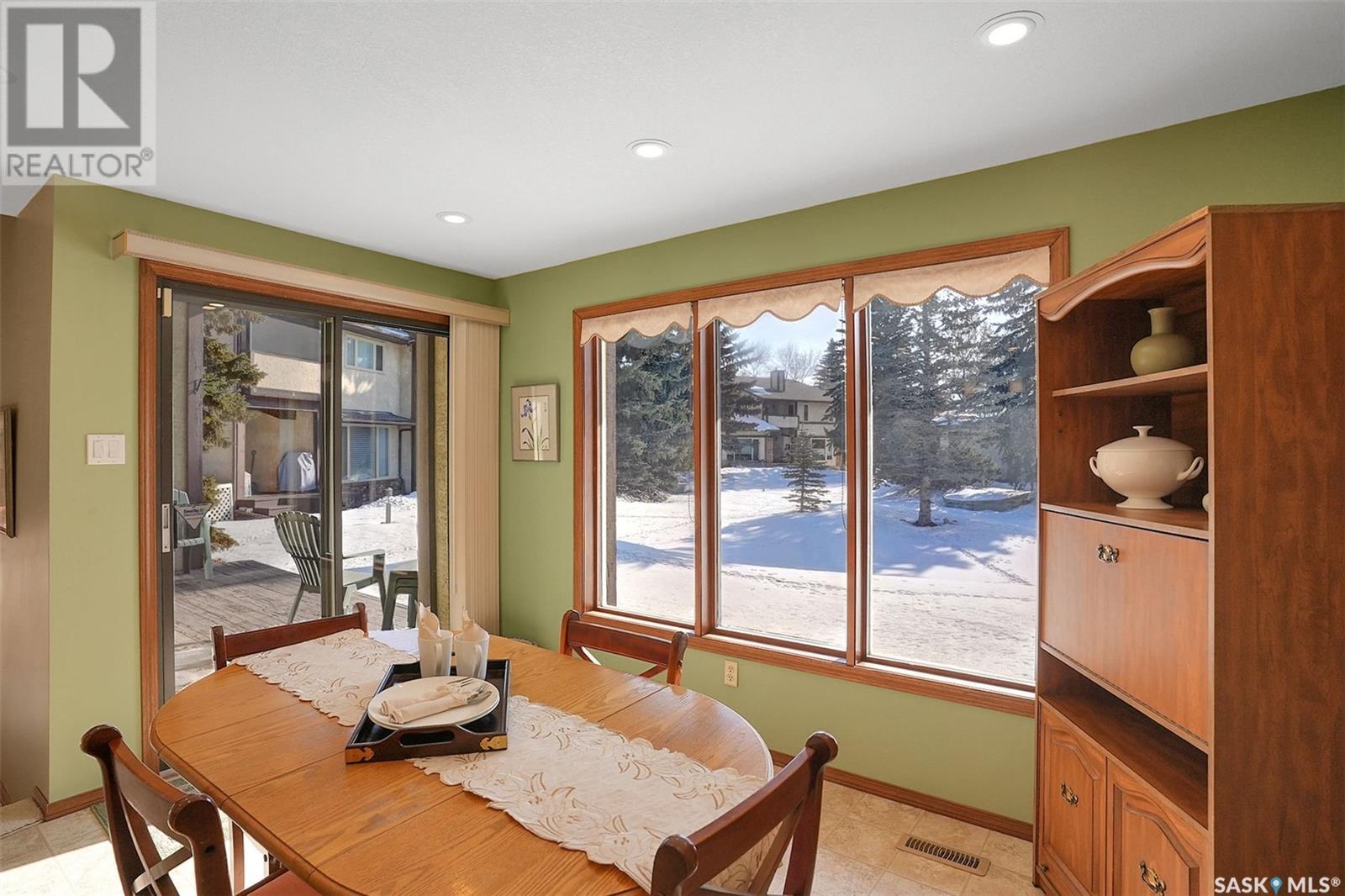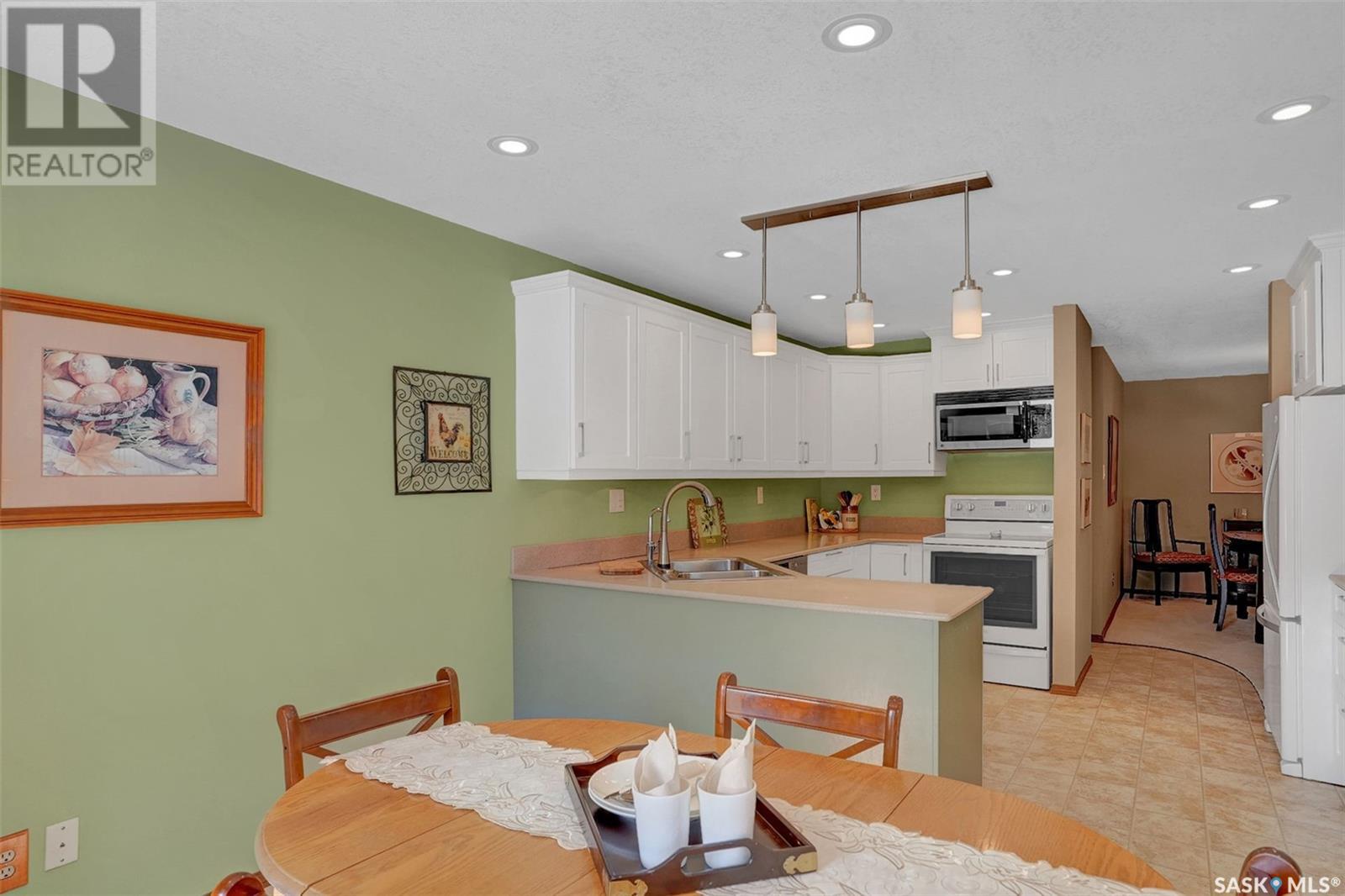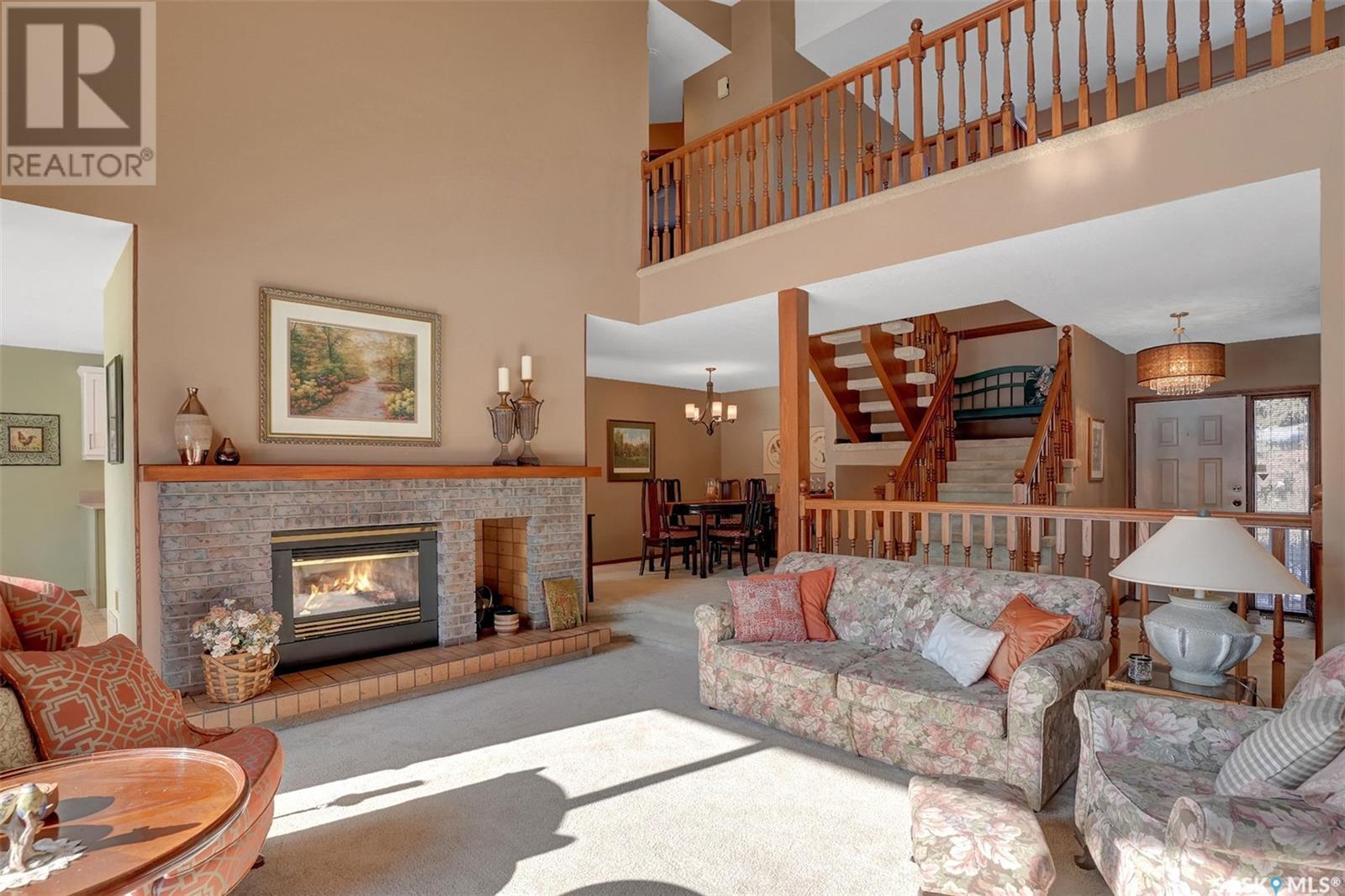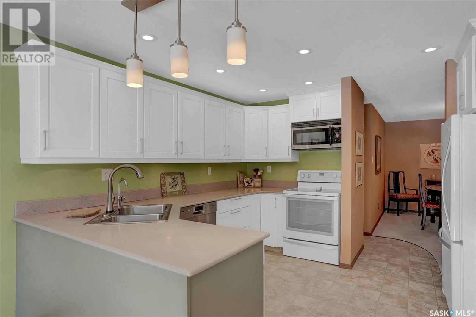 Flooded with sunlight, this 1,800 two storey condo is ready for new owners to call it home. Located in the Stratford Place complex in Regina’s Gardiner Park neighbourhood, this end unit offers 2 bedrooms, 4 bathrooms and double attached garage and visitor parking close to the unit. The front entrance is spacious with a modern chandelier and overlooks the sunken living room that is flooded with sunlight from the large windows that offer views of the greenspace behind your unit. The living room is highlighted with a vaulted ceiling and gas fireplace with a stunning brick surround. The kitchen has plenty of white cabinetry and a large kitchen dining space with windows that overlook the greenspace and a patio door that leads onto your deck, a quiet place to enjoy your morning coffee in the summer months. There is a separate formal dining space on the other side of the kitchen, a large pantry and a 2 pc bathroom. Plus, there is the ability to add in main floor laundry if desired. Upstairs houses both bedrooms and a cozy sitting room that overlooks the sunken living room. The primary bedroom is a generous size featuring a balcony with greenspace views, 2 closets and an ensuite with soaker tub and separate shower, the perfect bedroom oasis. The second bedroom also has a 4 pc ensuite. The basement is fully developed, you’ll find the laundry room with cabinets, counter space, extra space for storage, a family room with plush carpets, and 2 dens, one with a nice sized closet and another that is great for storage, craft or hobby room. If you’ve been searching for a condo because it is low maintenance but want the size and feel of a single family home, this is the perfect blend of both. Call your real estate agent and book your showing today! (id:22211)