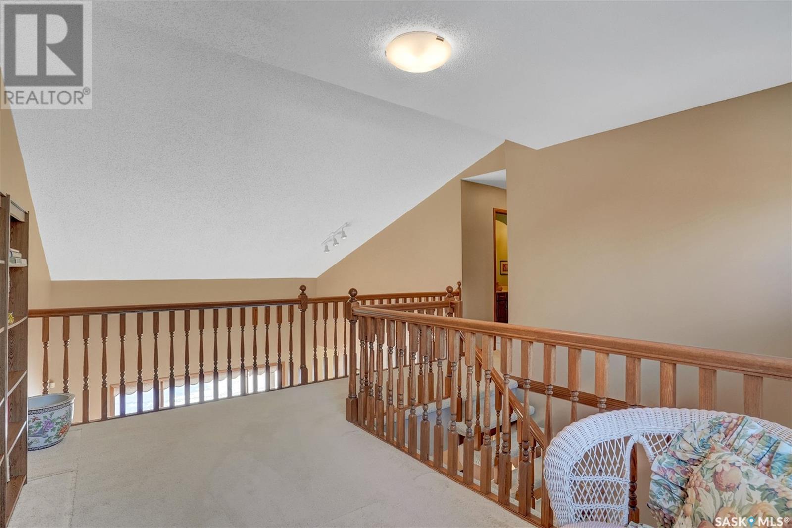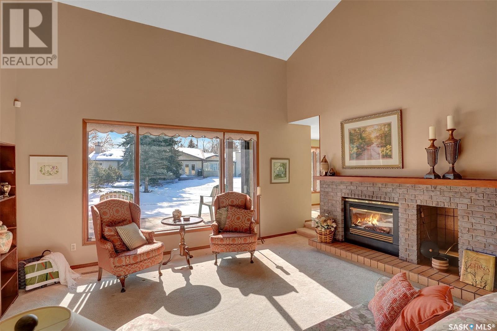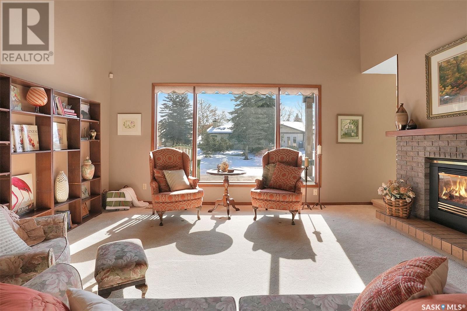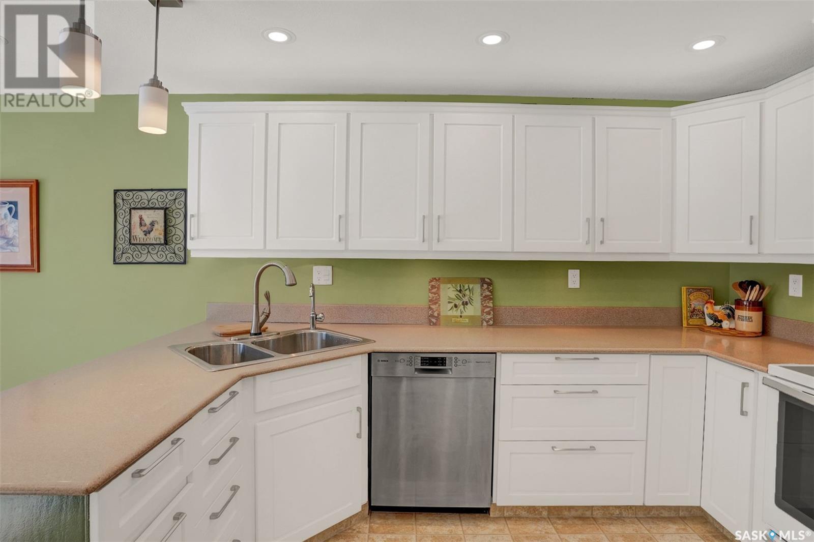 Flooded with sunlight, this 1,800 two storey condo is ready for new owners to call it home. Located in the Stratford Place complex in Regina’s Gardiner Park neighbourhood, this end unit offers 2 bedrooms, 4 bathrooms and double attached garage and visitor parking close to the unit. The front entrance is spacious with a modern chandelier and overlooks the sunken living room that is flooded with sunlight from the large windows that offer views of the greenspace behind your unit. The living room is highlighted with a vaulted ceiling and gas fireplace with a stunning brick surround. The kitchen has plenty of white cabinetry and a large kitchen dining space with windows that overlook the greenspace and a patio door that leads onto your deck, a quiet place to enjoy your morning coffee in the summer months. There is a separate formal dining space on the other side of the kitchen, a large pantry and a 2 pc bathroom. Plus, there is the ability to add in main floor laundry if desired. Upstairs houses both bedrooms and a cozy sitting room that overlooks the sunken living room. The primary bedroom is a generous size featuring a balcony with greenspace views, 2 closets and an ensuite with soaker tub and separate shower, the perfect bedroom oasis. The second bedroom also has a 4 pc ensuite. The basement is fully developed, you’ll find the laundry room with cabinets, counter space, extra space for storage, a family room with plush carpets, and 2 dens, one with a nice sized closet and another that is great for storage, craft or hobby room. If you’ve been searching for a condo because it is low maintenance but want the size and feel of a single family home, this is the perfect blend of both. Call your real estate agent and book your showing today! (id:22211)