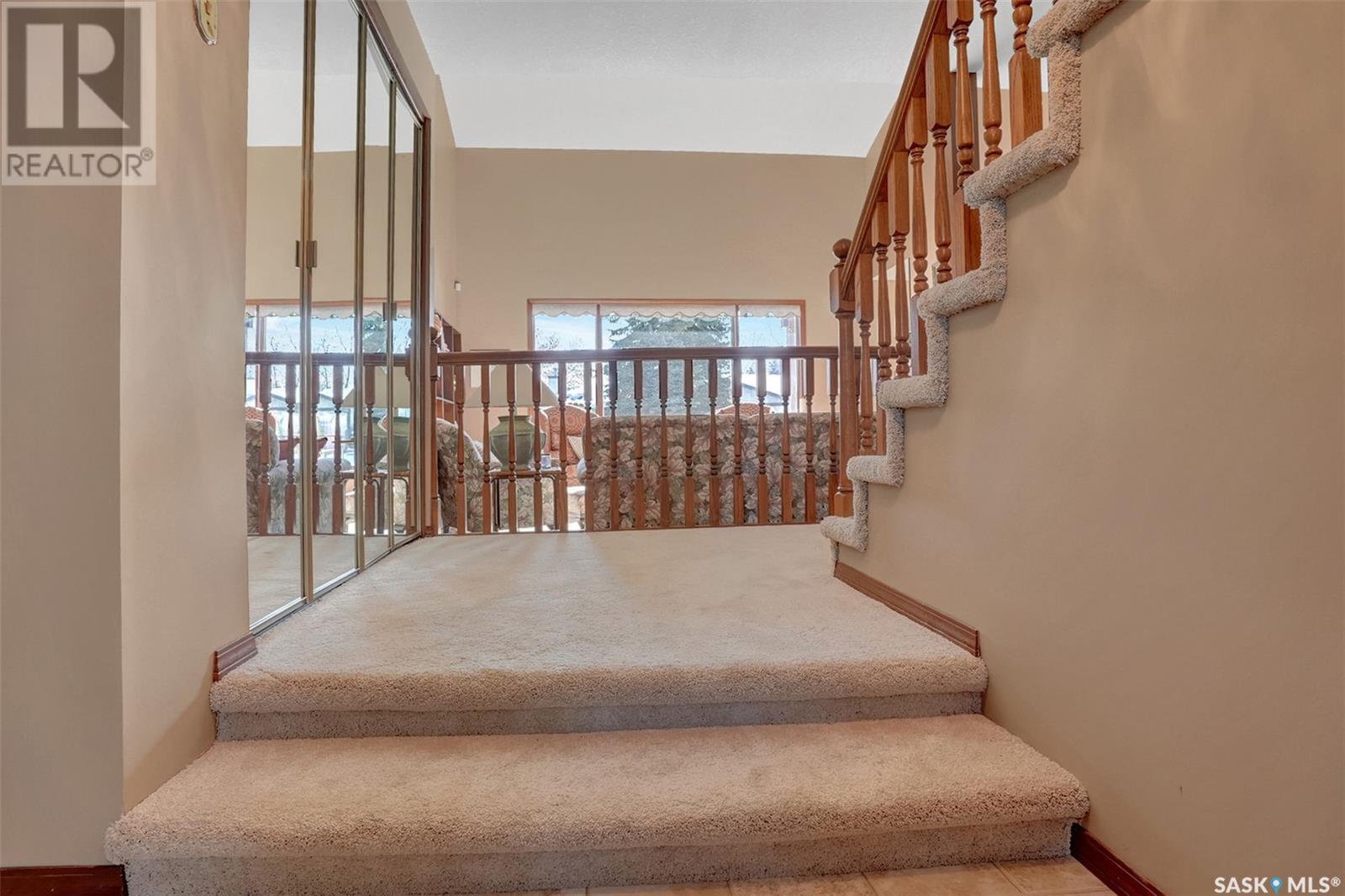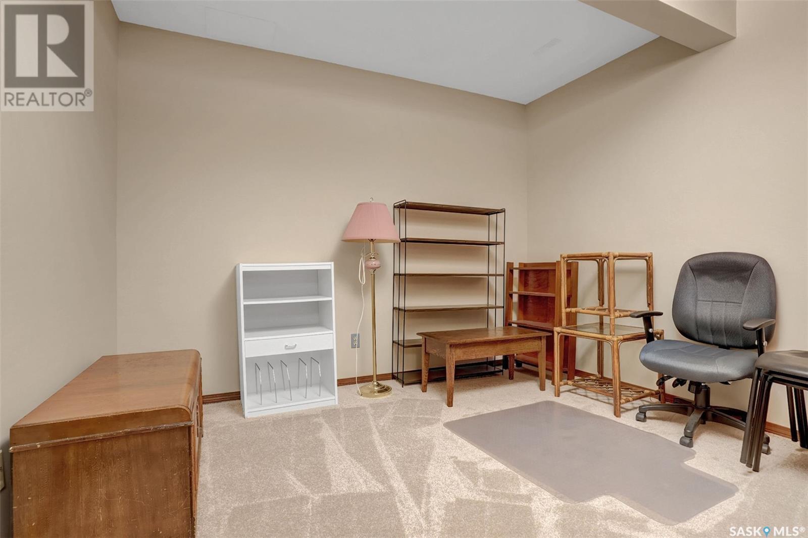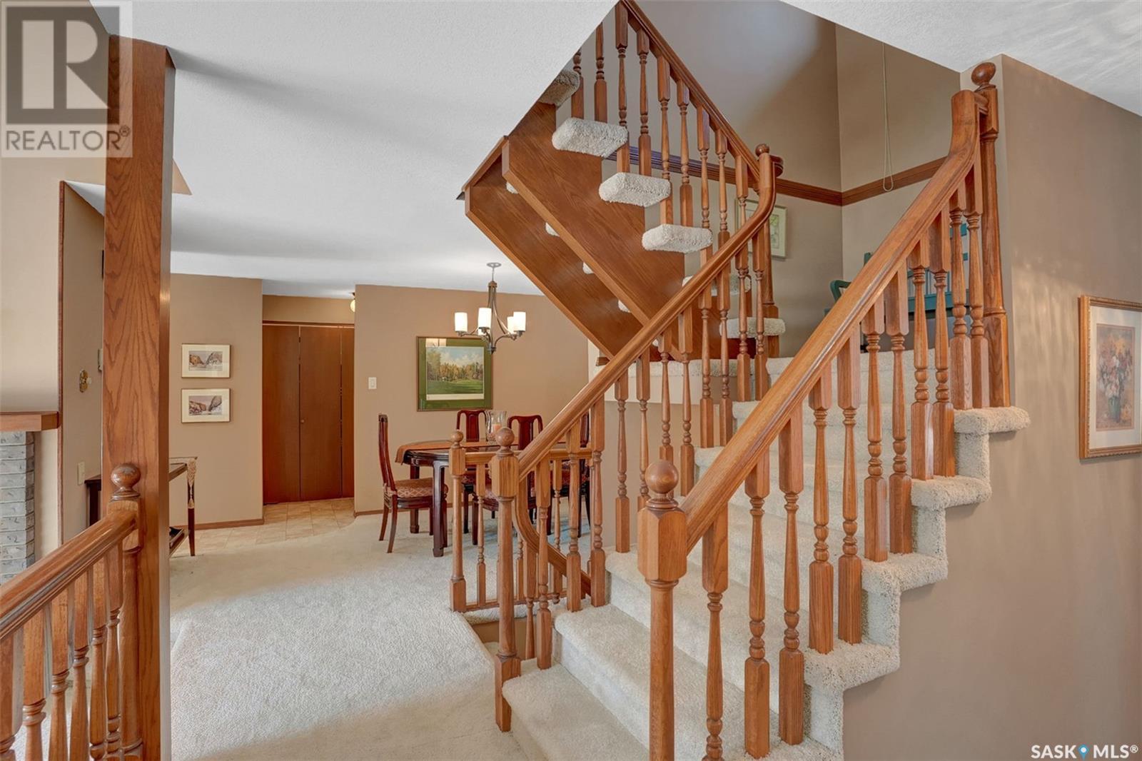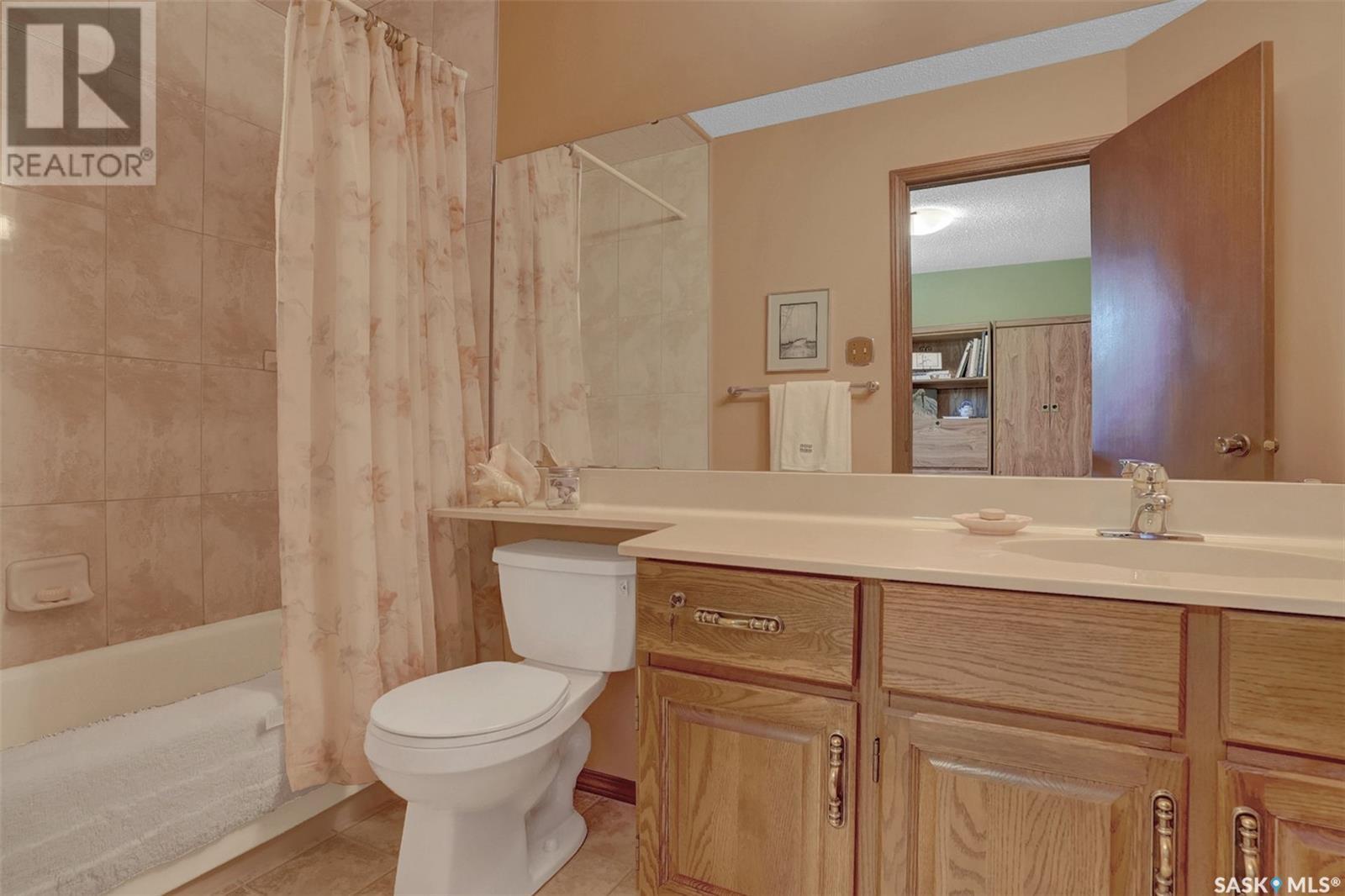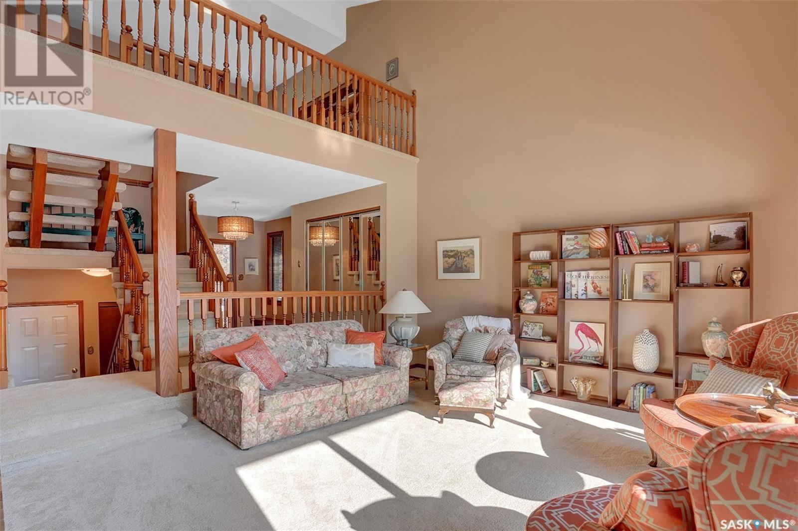 Flooded with sunlight, this 1,800 two storey condo is ready for new owners to call it home. Located in the Stratford Place complex in Regina’s Gardiner Park neighbourhood, this end unit offers 2 bedrooms, 4 bathrooms and double attached garage and visitor parking close to the unit. The front entrance is spacious with a modern chandelier and overlooks the sunken living room that is flooded with sunlight from the large windows that offer views of the greenspace behind your unit. The living room is highlighted with a vaulted ceiling and gas fireplace with a stunning brick surround. The kitchen has plenty of white cabinetry and a large kitchen dining space with windows that overlook the greenspace and a patio door that leads onto your deck, a quiet place to enjoy your morning coffee in the summer months. There is a separate formal dining space on the other side of the kitchen, a large pantry and a 2 pc bathroom. Plus, there is the ability to add in main floor laundry if desired. Upstairs houses both bedrooms and a cozy sitting room that overlooks the sunken living room. The primary bedroom is a generous size featuring a balcony with greenspace views, 2 closets and an ensuite with soaker tub and separate shower, the perfect bedroom oasis. The second bedroom also has a 4 pc ensuite. The basement is fully developed, you’ll find the laundry room with cabinets, counter space, extra space for storage, a family room with plush carpets, and 2 dens, one with a nice sized closet and another that is great for storage, craft or hobby room. If you’ve been searching for a condo because it is low maintenance but want the size and feel of a single family home, this is the perfect blend of both. Call your real estate agent and book your showing today! (id:22211)
