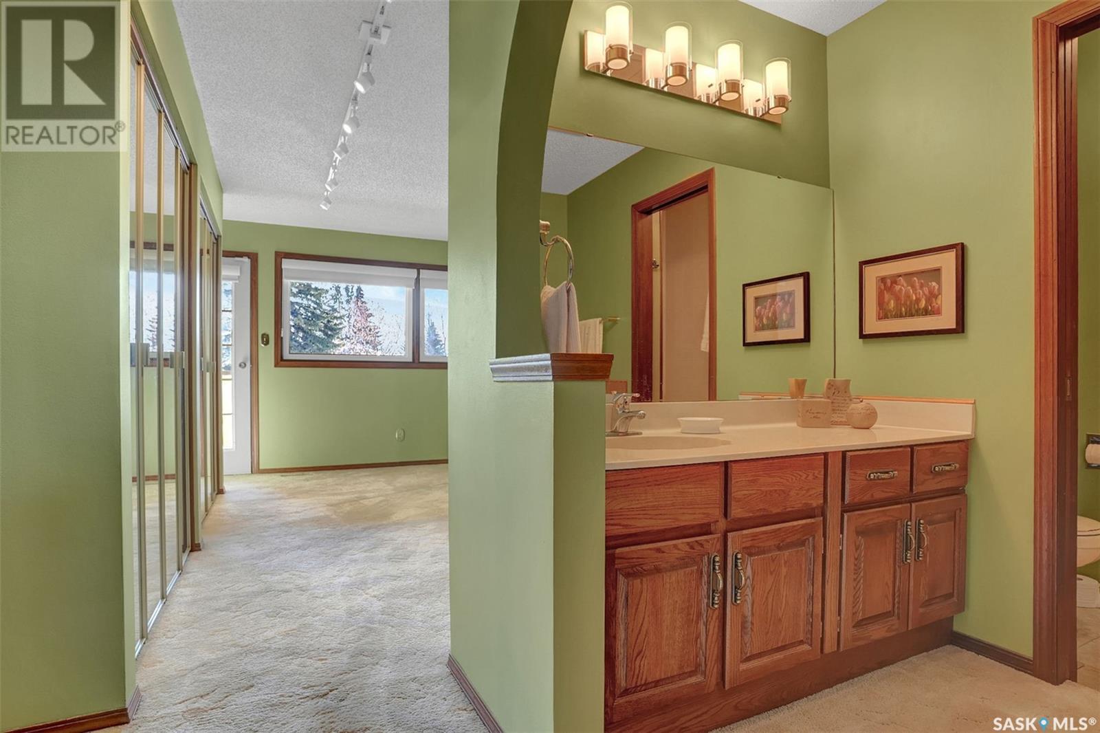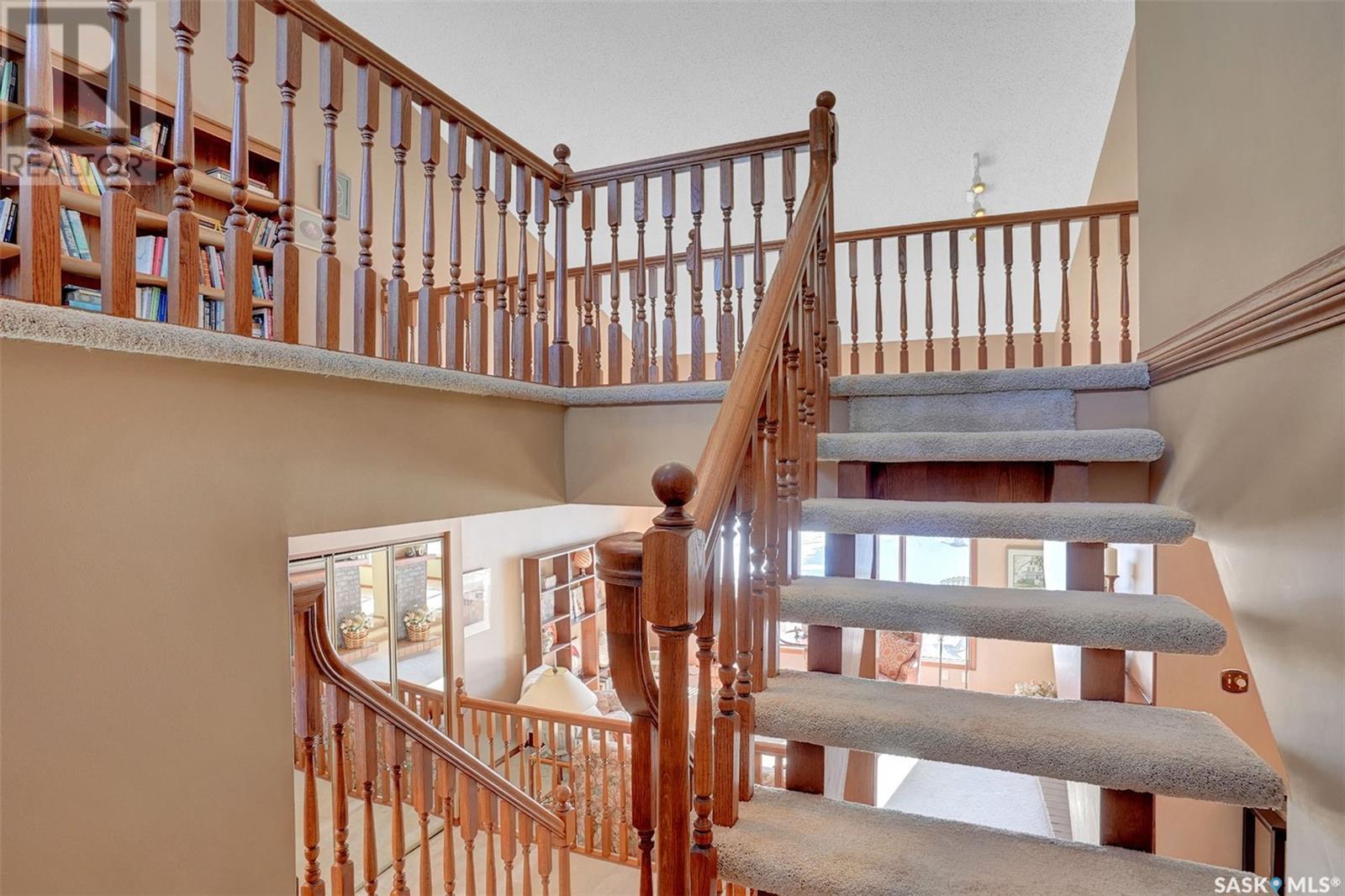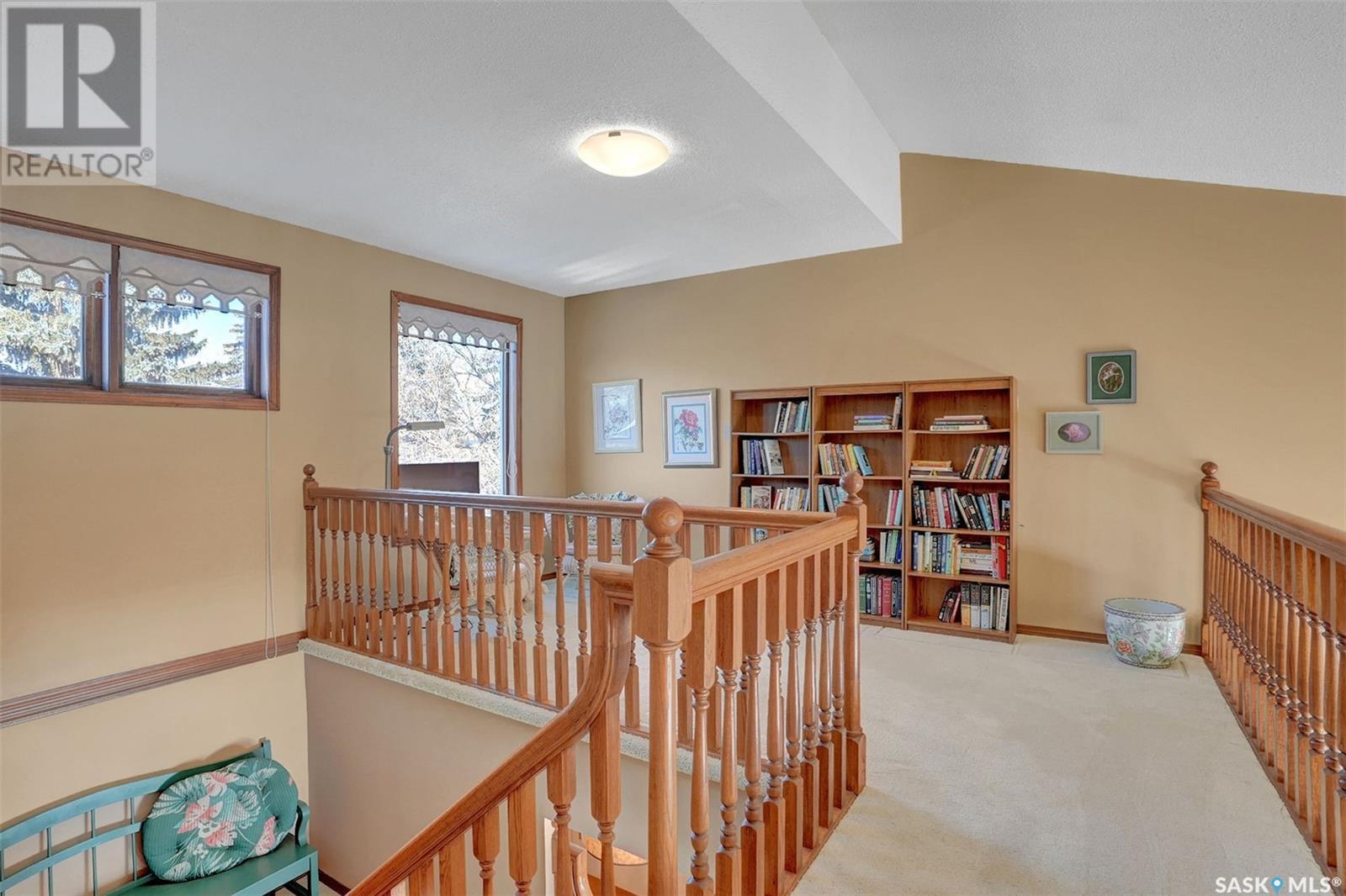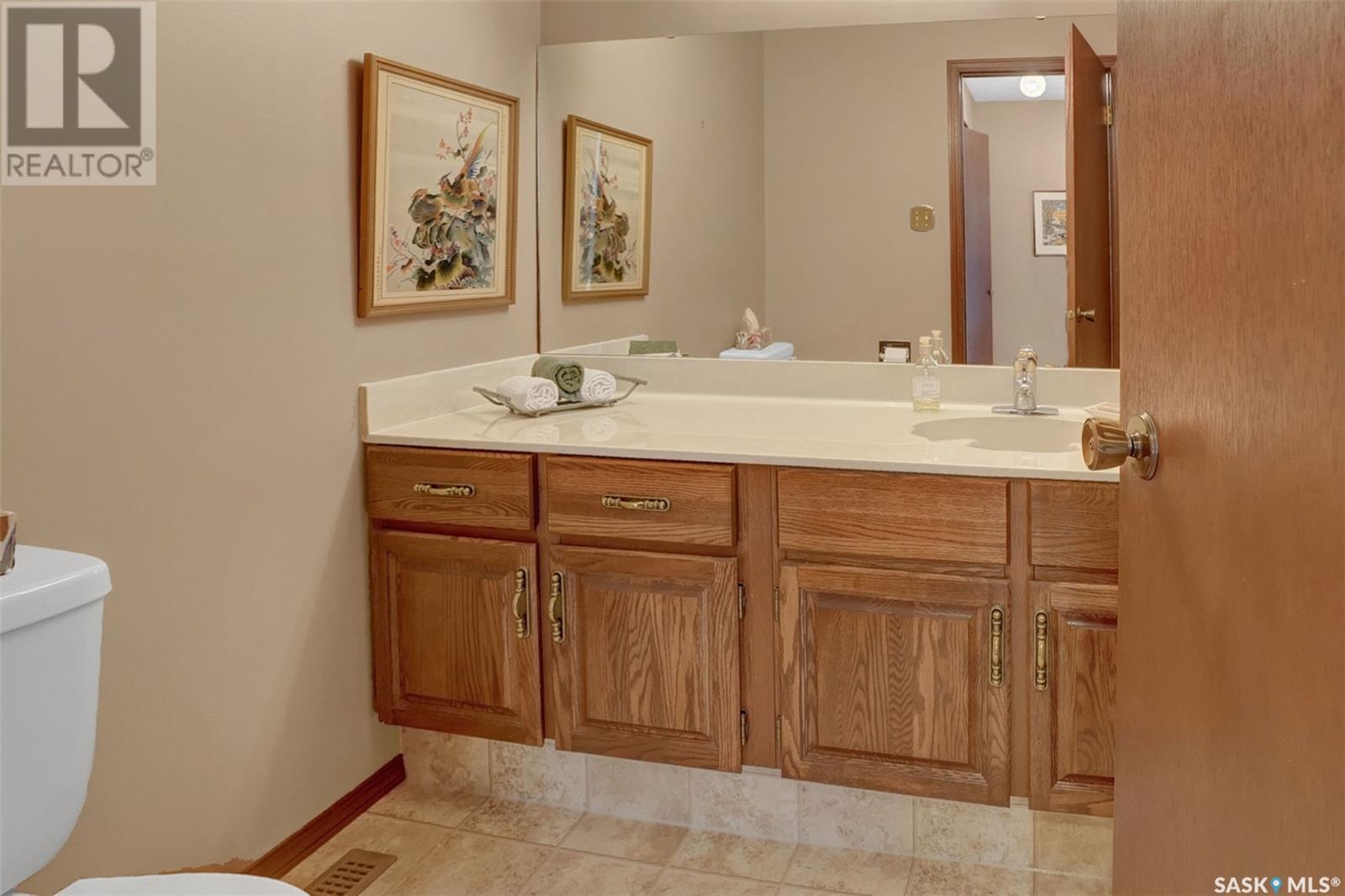 Flooded with sunlight, this 1,800 two storey condo is ready for new owners to call it home. Located in the Stratford Place complex in Regina’s Gardiner Park neighbourhood, this end unit offers 2 bedrooms, 4 bathrooms and double attached garage and visitor parking close to the unit. The front entrance is spacious with a modern chandelier and overlooks the sunken living room that is flooded with sunlight from the large windows that offer views of the greenspace behind your unit. The living room is highlighted with a vaulted ceiling and gas fireplace with a stunning brick surround. The kitchen has plenty of white cabinetry and a large kitchen dining space with windows that overlook the greenspace and a patio door that leads onto your deck, a quiet place to enjoy your morning coffee in the summer months. There is a separate formal dining space on the other side of the kitchen, a large pantry and a 2 pc bathroom. Plus, there is the ability to add in main floor laundry if desired. Upstairs houses both bedrooms and a cozy sitting room that overlooks the sunken living room. The primary bedroom is a generous size featuring a balcony with greenspace views, 2 closets and an ensuite with soaker tub and separate shower, the perfect bedroom oasis. The second bedroom also has a 4 pc ensuite. The basement is fully developed, you’ll find the laundry room with cabinets, counter space, extra space for storage, a family room with plush carpets, and 2 dens, one with a nice sized closet and another that is great for storage, craft or hobby room. If you’ve been searching for a condo because it is low maintenance but want the size and feel of a single family home, this is the perfect blend of both. Call your real estate agent and book your showing today! (id:22211)