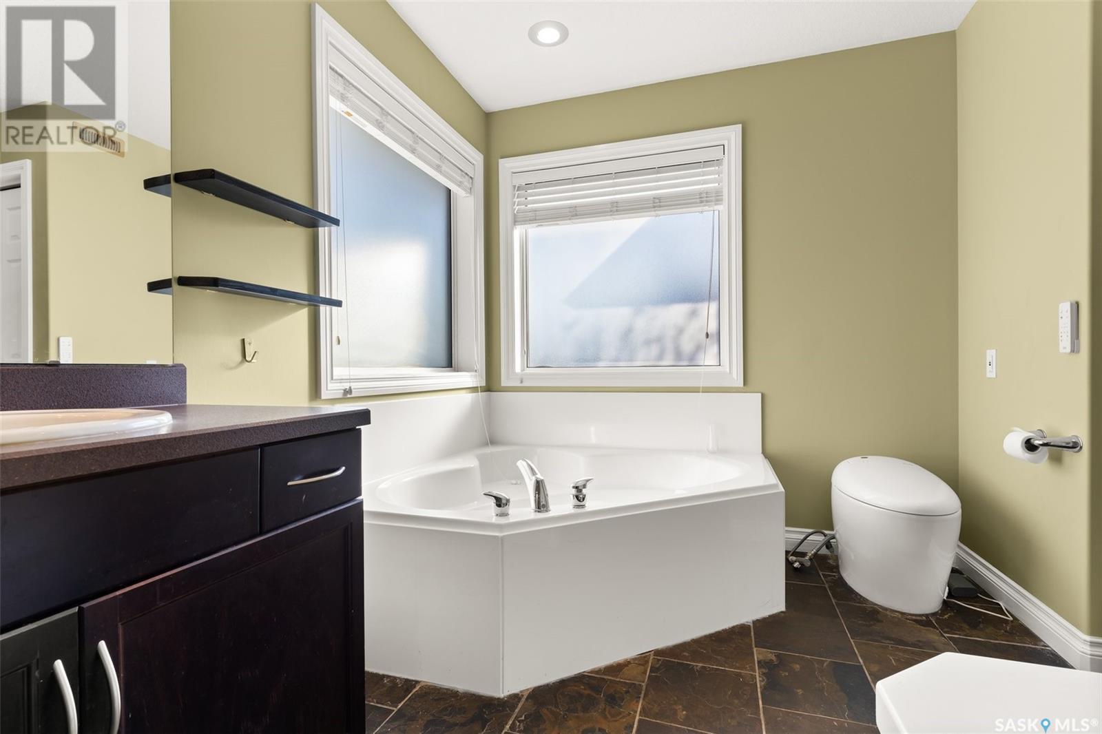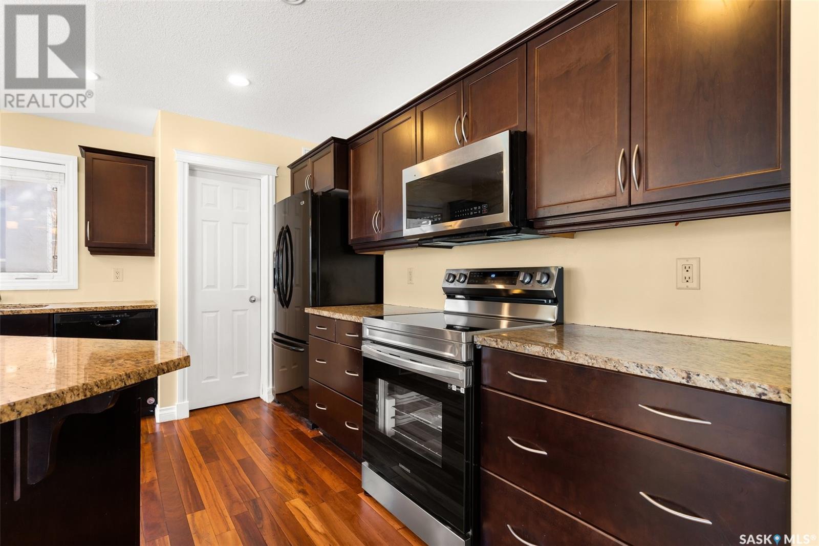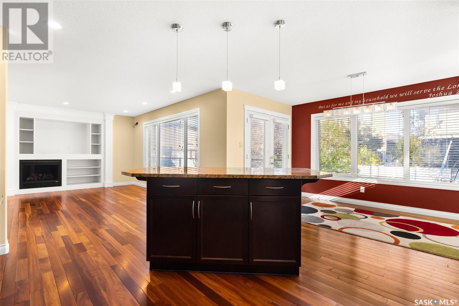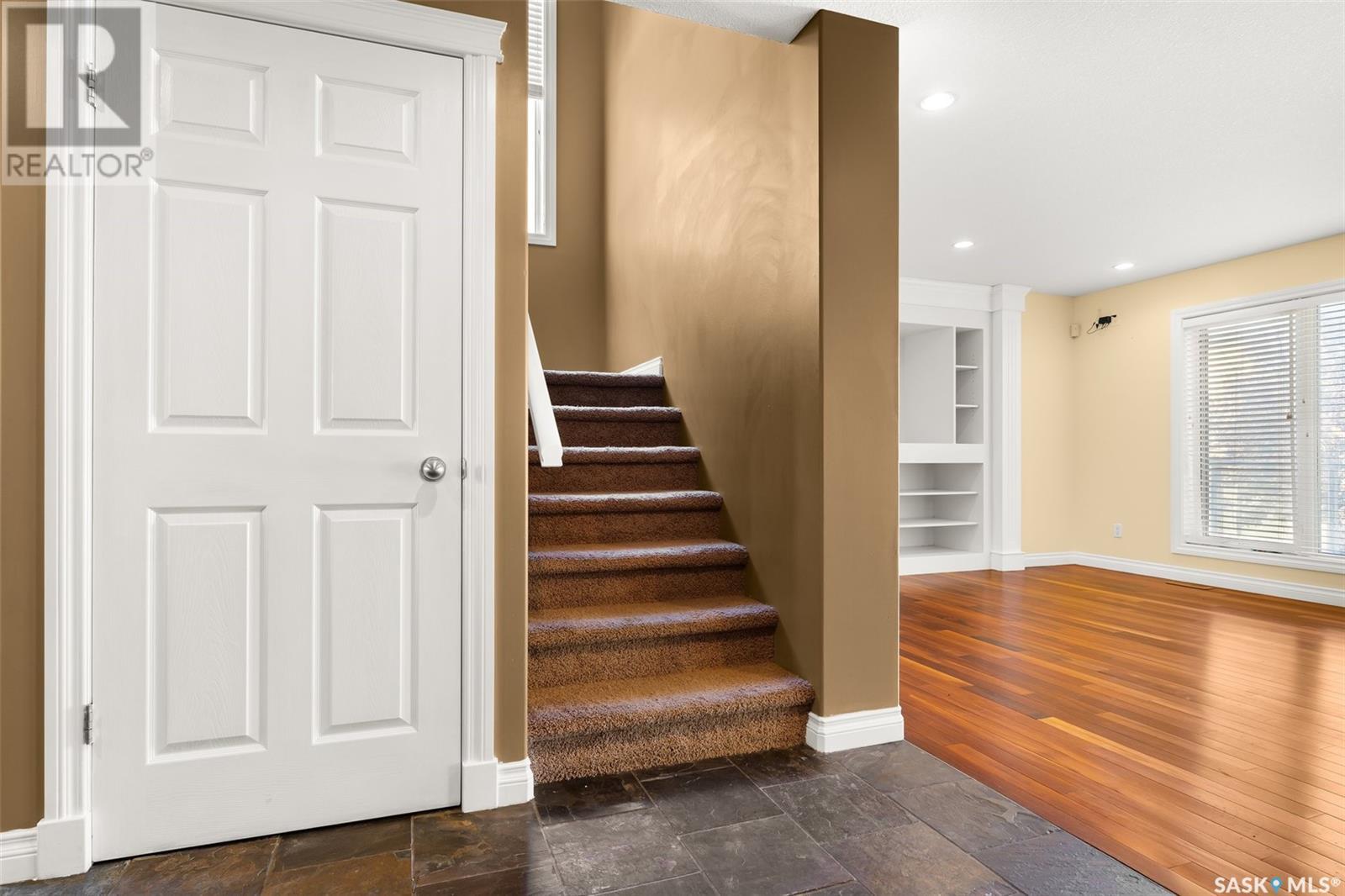 Welcome to 8607 Wascana Gardens Lane, located in desirable Wascana View. Residents of this tranquil neighbourhood enjoy an extensive park and trail system, including McKell Wascana Conservation Park. Arcola Avenue provides easy access to the Ring Road and Regina Bypass, as well as all east Victoria Avenue amenities. This 1996 square foot 2 story has great curb appeal with a 24x25 attached garage, and front deck with glass railing. The main foyer is spacious with tile flooring, leading to a den looking out to the front of the home, as well as the living room with hardwood flooring and a gas fireplace feature wall. The spacious kitchen offers hardwood flooring, granite countertops, espresso cabinets and drawers, a center island with built-in storage, and pantry. The dining area is surrounded by windows, with French-style patio doors that lead to the deck with aluminum and glass railing. A 2-piece bath completes the main floor. Upstairs, the primary bedroom features a spacious walk-in closet, and a 4-piece ensuite with soaker tub. This level also boasts two sizable bedrooms with walk-in closets, laundry, and a large 4-piece main bath. The basement features a large recreation room, den, 3-pc bath, and utility room. Mature trees offer privacy in the fully landscaped back yard. Value added features include all appliances, window coverings, alarm system, natural gas bbq hookup, central A/C, and central vac. Call your agent to schedule a showing today. (id:22211)
