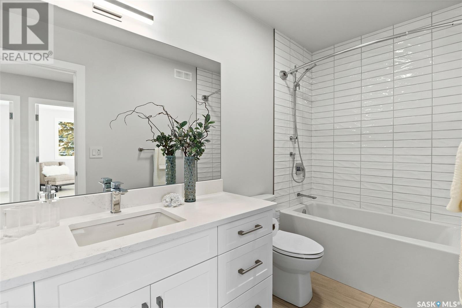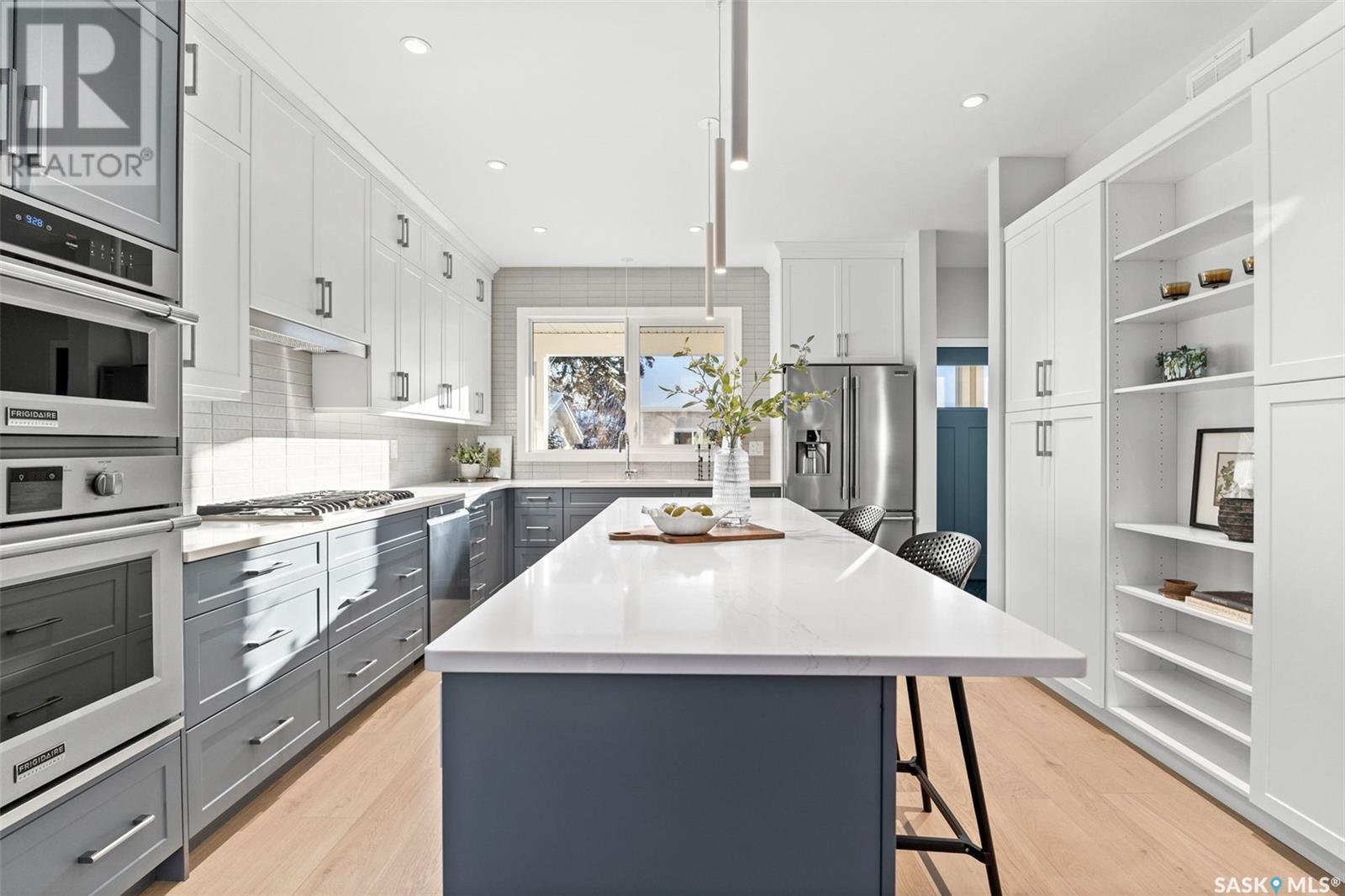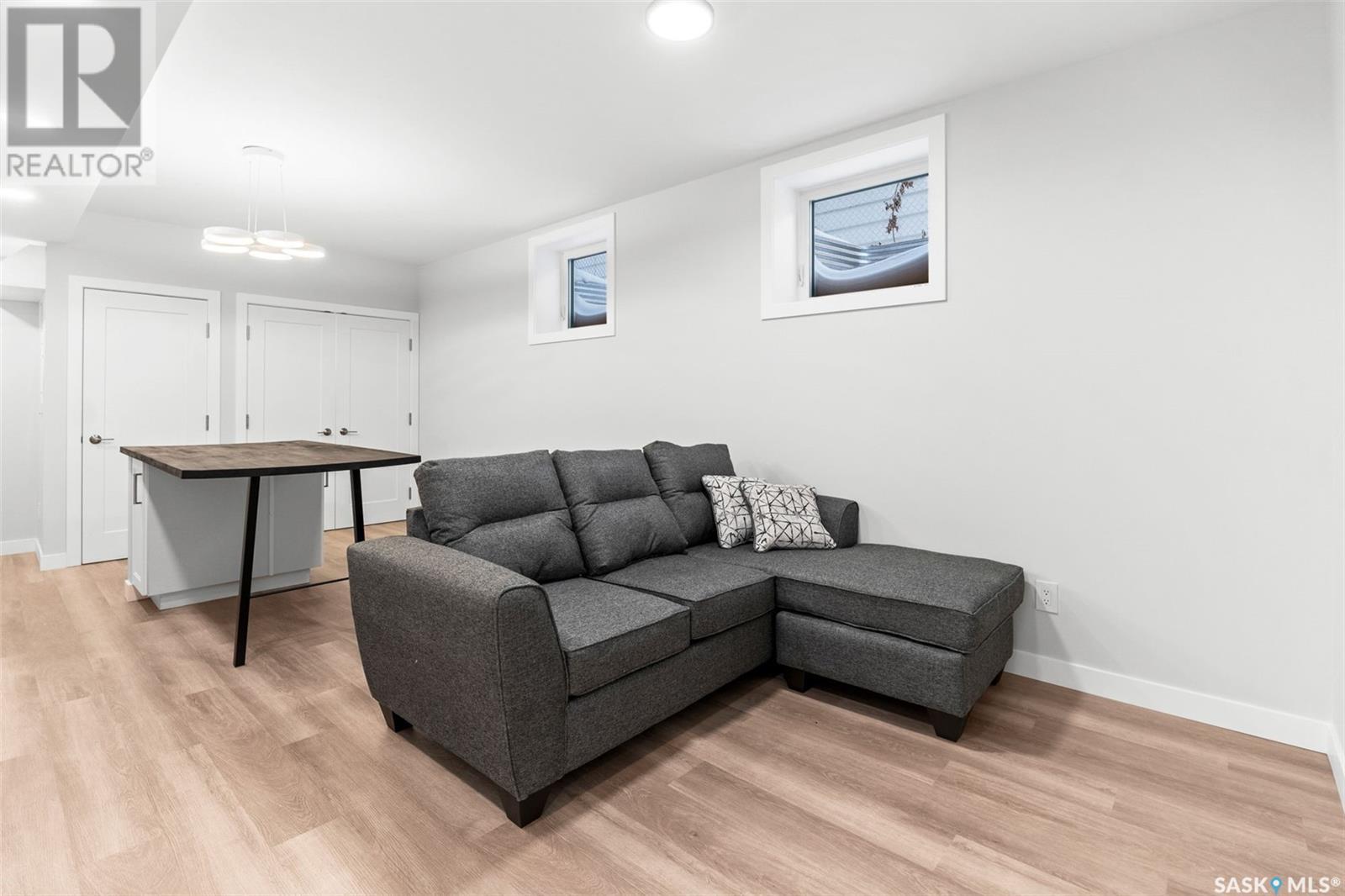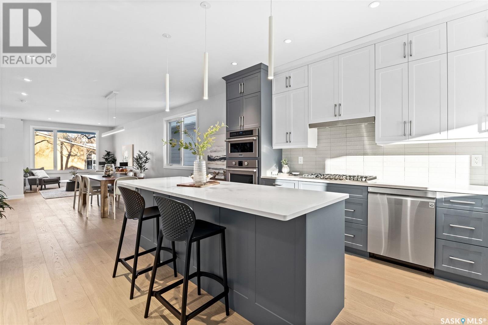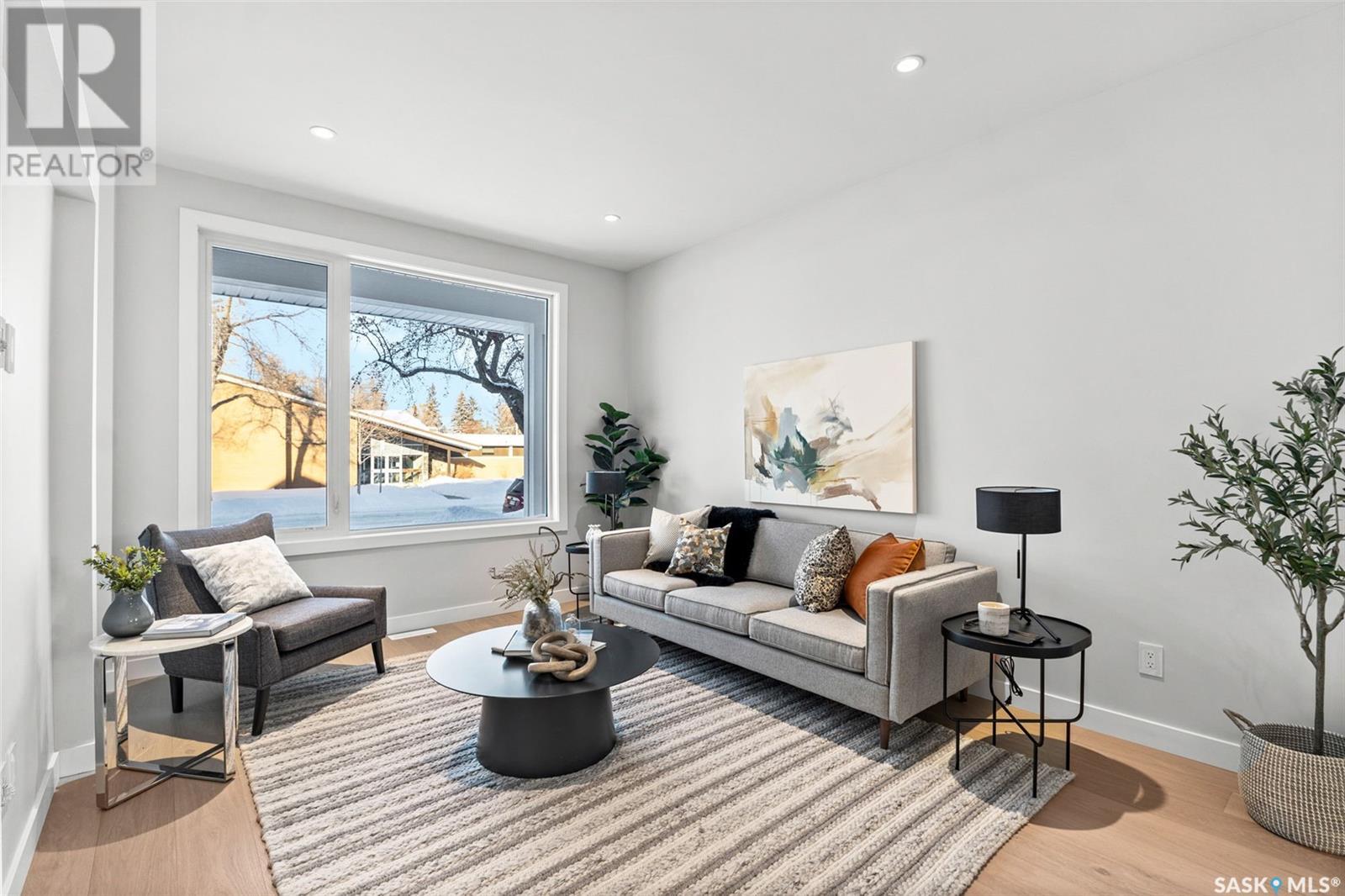 Welcome to 1418 10th St E! A stunning new custom build loaded with energy efficient upgrades in the highly desirable neighbourhood of Varsity View with grocery stores & amenities close by, this location would make the perfect place to call home. Featuring 1800 sqft of beautifully finished space with a basement suite. Inside you will find a spacious & bright open concept floor plan with gorgeous white oak engineered hardwoods throughout. The kitchen is the showpiece of the home featuring a gas range, wall oven & microwave, floor to ceiling custom Superior cabinetry, large pantry, quartz counters, and island with bar seating. Dining room is spacious with room for a large table great for hosting guests. Custom millwork mudroom & a stylish 2-piece bath can also be found on this level. The primary suite features a large walk-in closet with custom built-ins. Ensuite features double sinks, glass shower enclosure with rain shower head & & hand wand for convenience. Two large secondary bedrooms, a second bathroom and laundry room can also be found on this level. Basement has a legal 1-bedroom suite which comes with all appliances & separate heat for comfort. Notable upgrades; solar ready roof, integrated pro series mechanical system with modulating natural gas furnace, heat pump, comfort sync controls plus and energy recovery ventilator, on demand hot water tank, Smart Home lighting. Natural gas barbecue hookup. Maintenance free composite exterior. Fiberglass impact resistant shingles. Central air. Decorative paving slab patio and walkways. Large covered deck overlooking back yard, smaller covered shade deck facing street. Double detached garage with 220-volt outlet so it’s electric vehicle charger ready. Too many upgrades to list. Contact your agent today to book your viewing! (id:22211)
