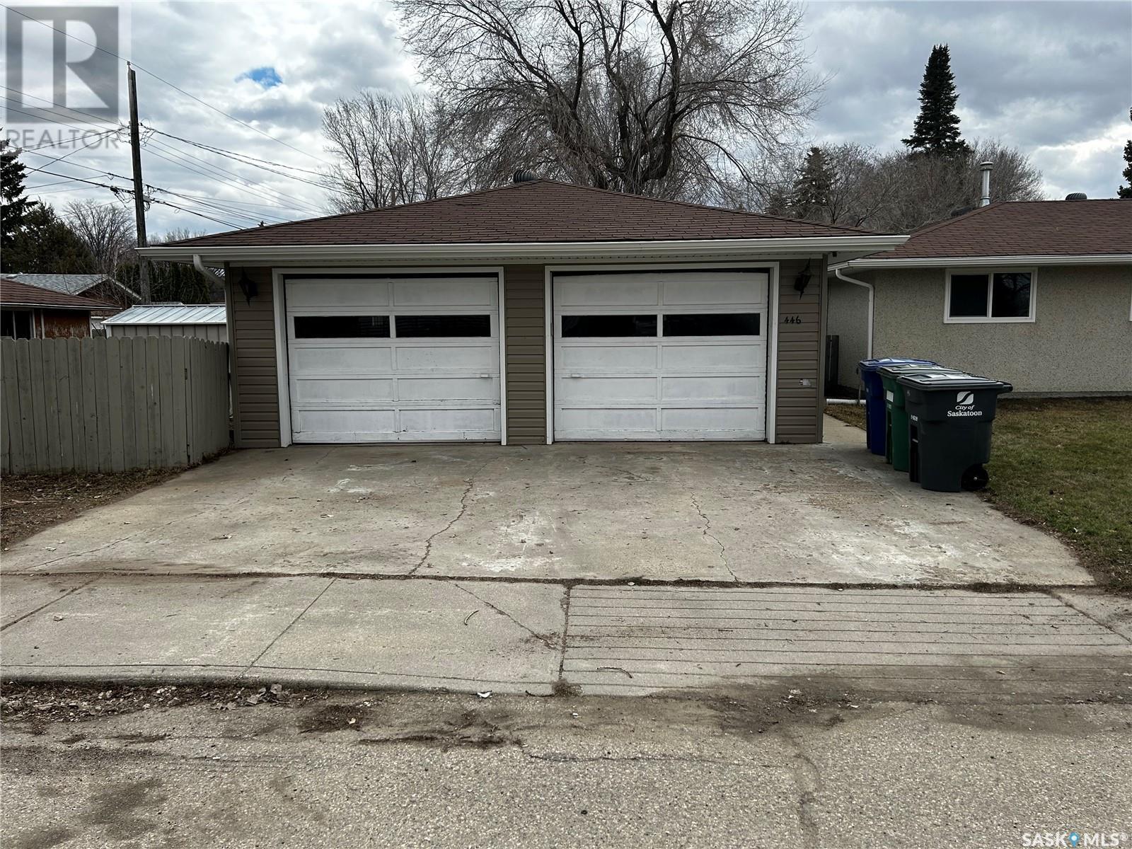 Welcome to 446 Ave Y North! This slab bungalow has many upgrades such as newer windows, cabinets, countertops, flooring, lights and paint. When you enter the home you will notice the abundance of natural light. The living room and hallway has laminate flooring. The kitchen has updated light maple coloured cabinets and nice countertops. There are three good sized bedrooms with new carpet and good sized closets. The bathroom has a new tub surround. The bathroom is white and bright. There is a large storage room as well. This home is situated on two lots and is a corner lot. The backyard has a concrete pad, flower beds, garden area, playhouse shed and an additional shed to store all your outdoor items. The yard is fully fenced and there is an area to park an RV. The double detached garage is 24 x 30, so there is lots of room to park your vehicles and room for a workshop. Great starter home or revenue property! Book your viewing today! (id:22211)