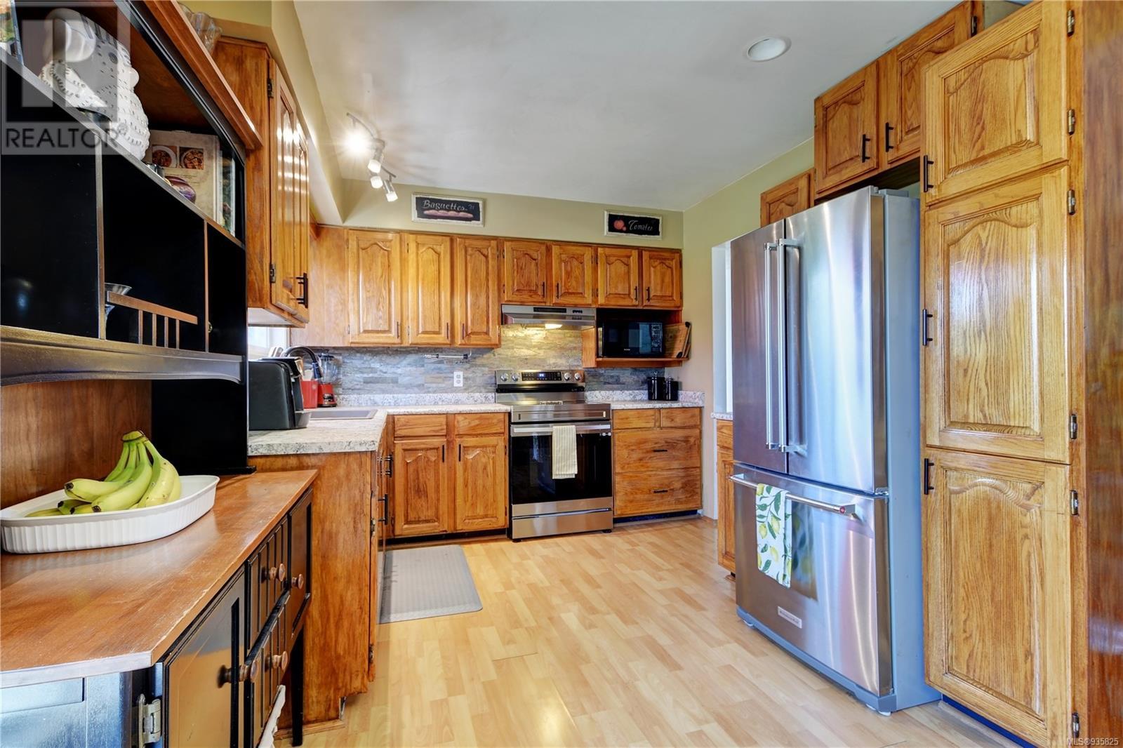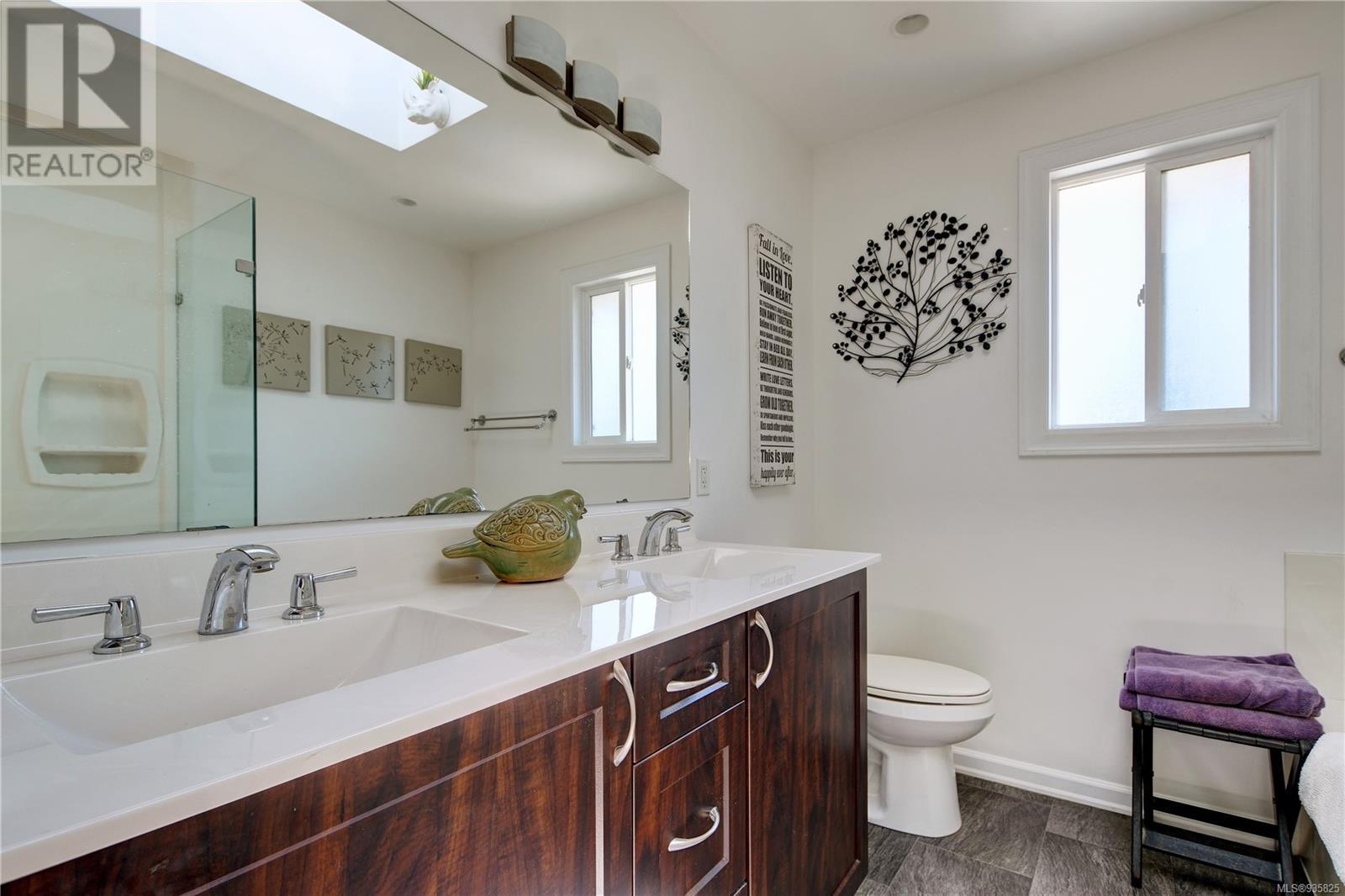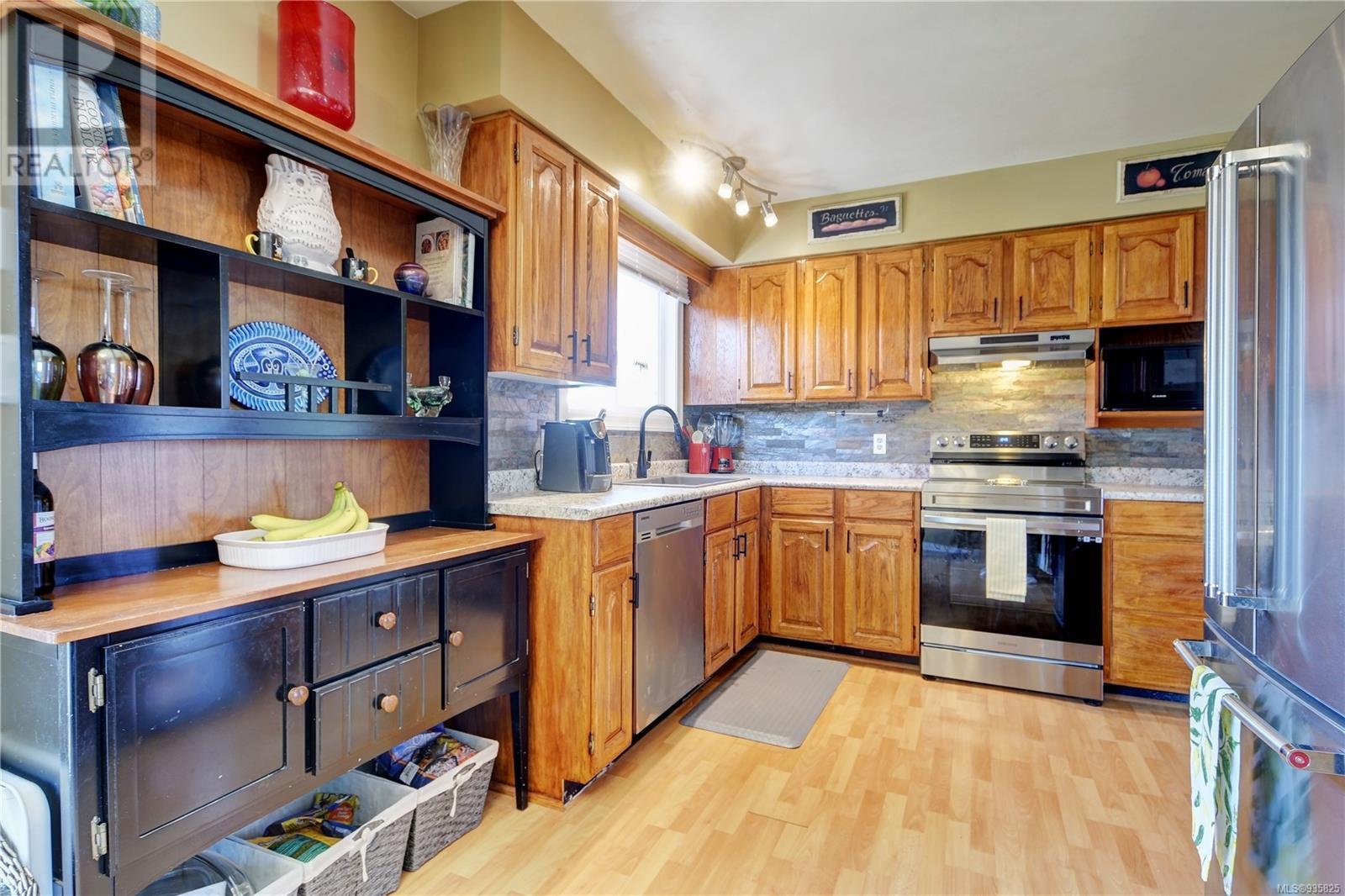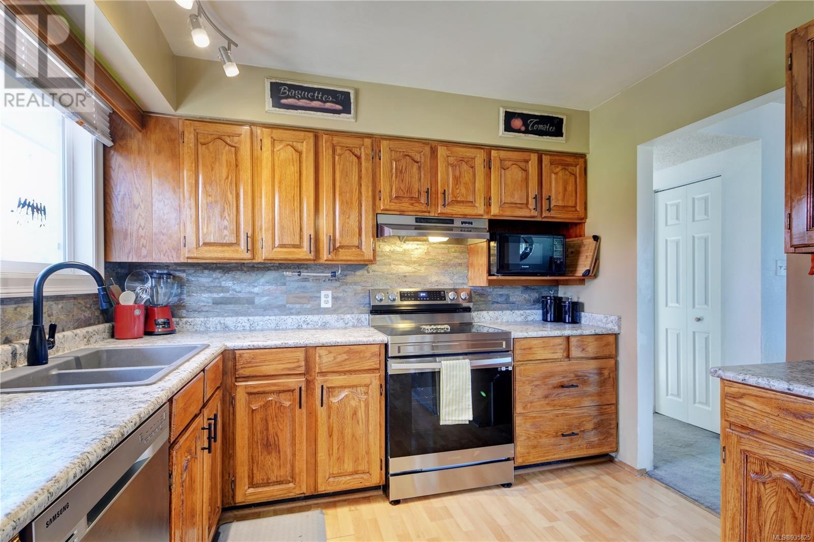 An ideal 5-bedroom family home with a gorgeous back yard, massive sun deck and separate suite! Upgrades include double pane windows throughout in 2021. Newer gas fireplace in living room and family room. Air conditioner added to furnace in 2022. Lower level renovated with new carpets and an addition of a suite with separate entrance. Freshly painted inside and out. Enjoy the massive deck off the kitchen, leading to the gorgeous back yard that has been transformed into an oasis. Three beds up, good size living and dining room and kitchen. New appliances in kitchen. Two more bedrooms down plus an office, large rec room and suite. Many options here for an extended family or guest suite. Convenient location close to Sidney. Very good value in today's market! (id:22211)