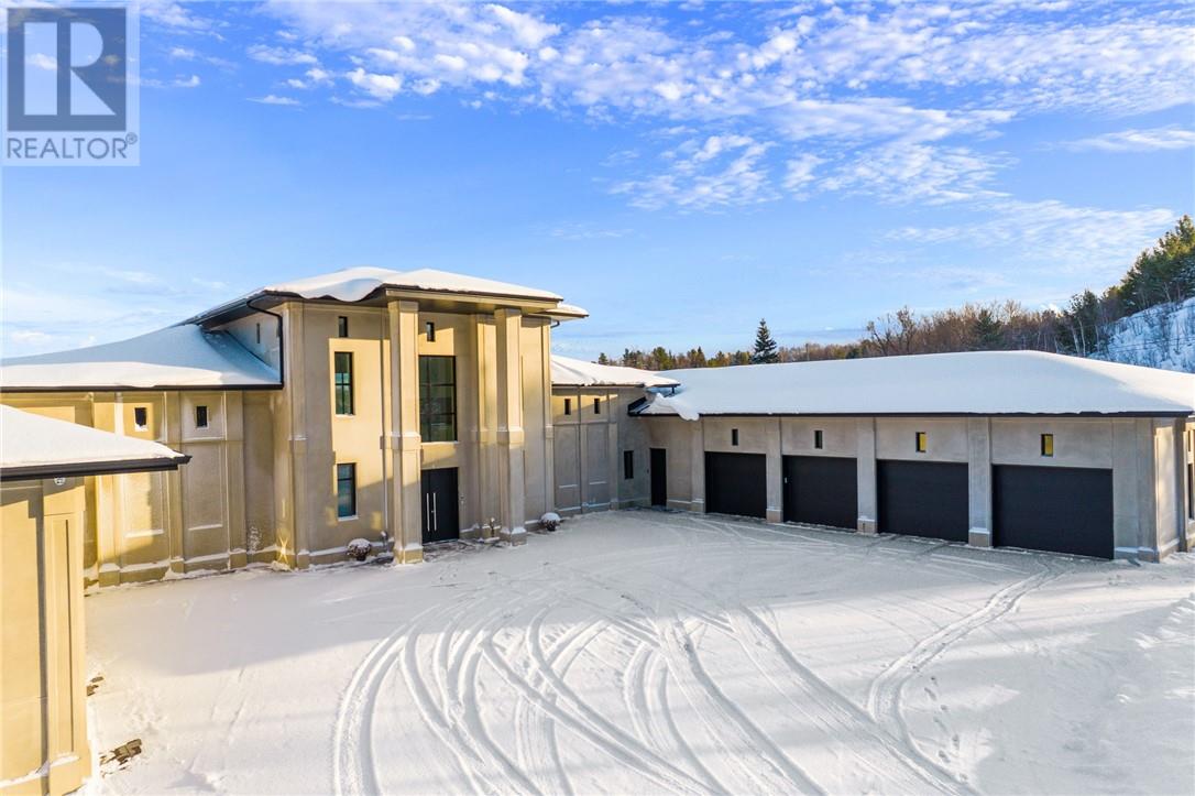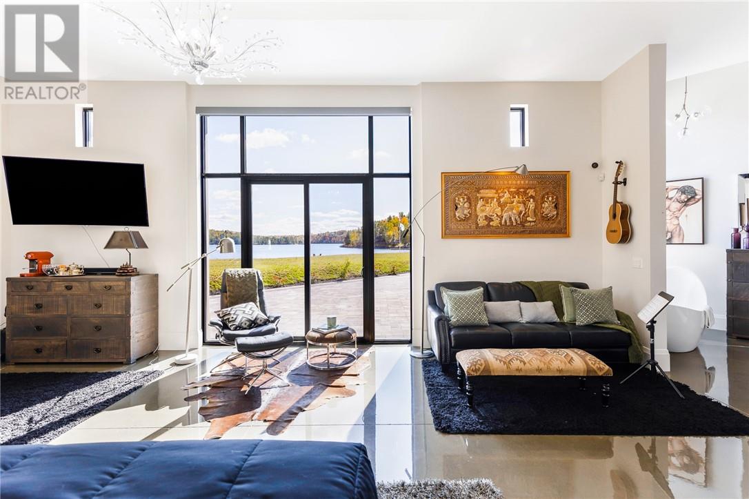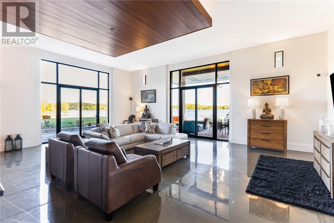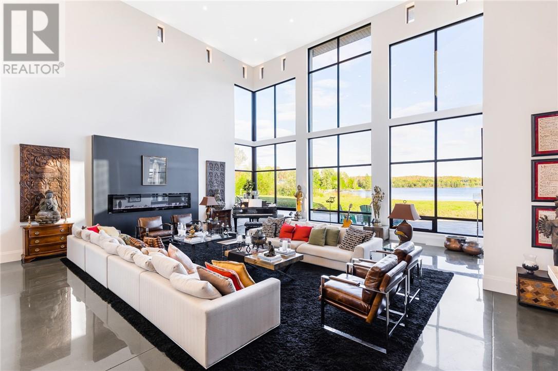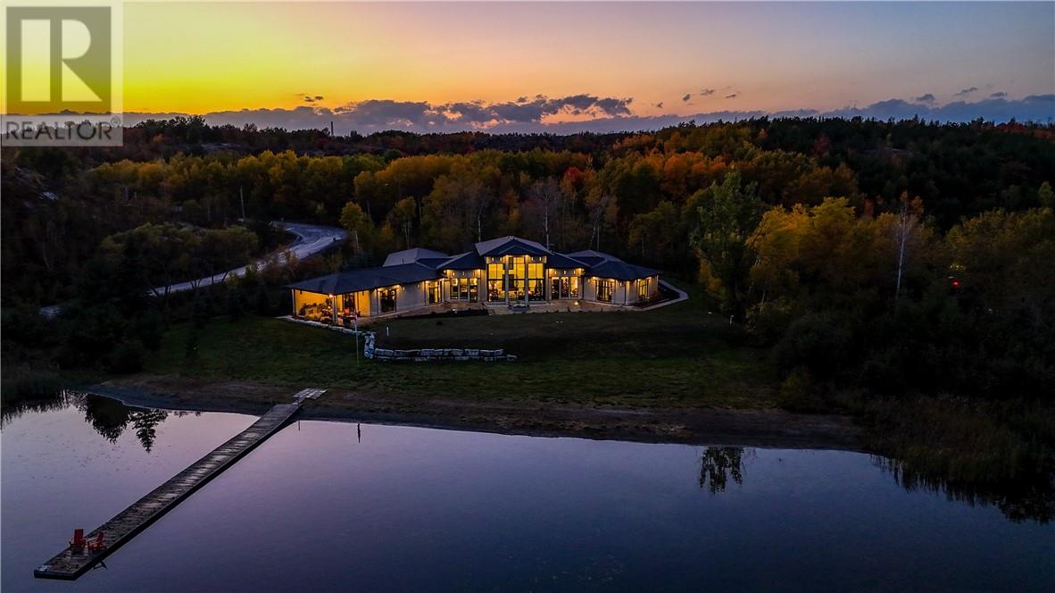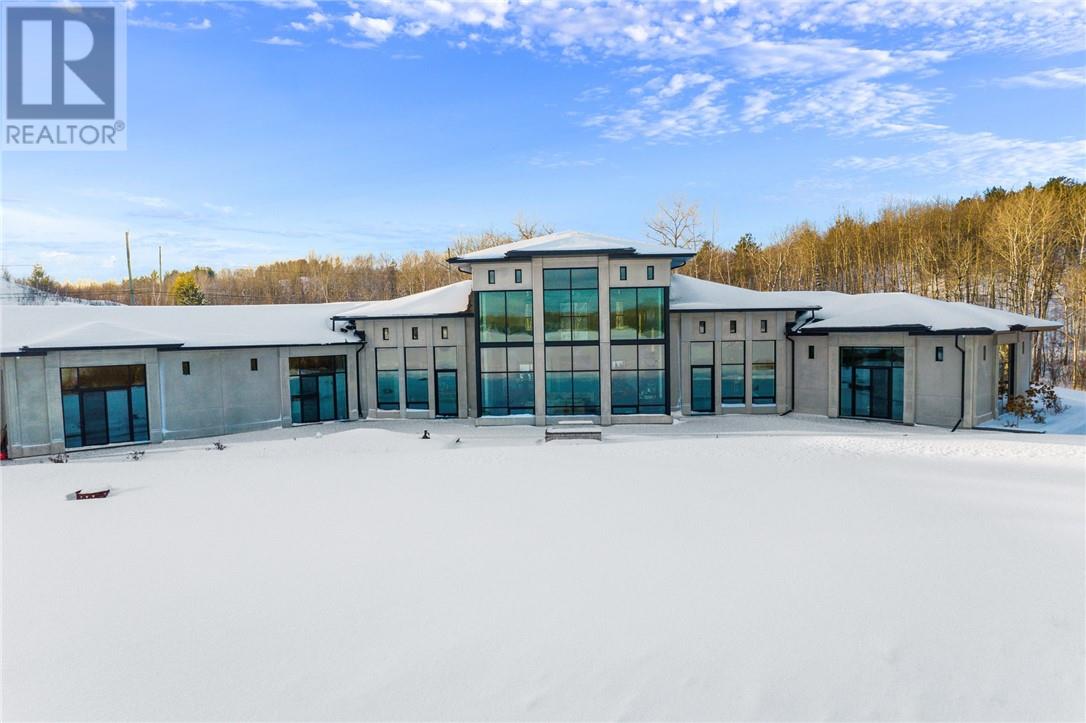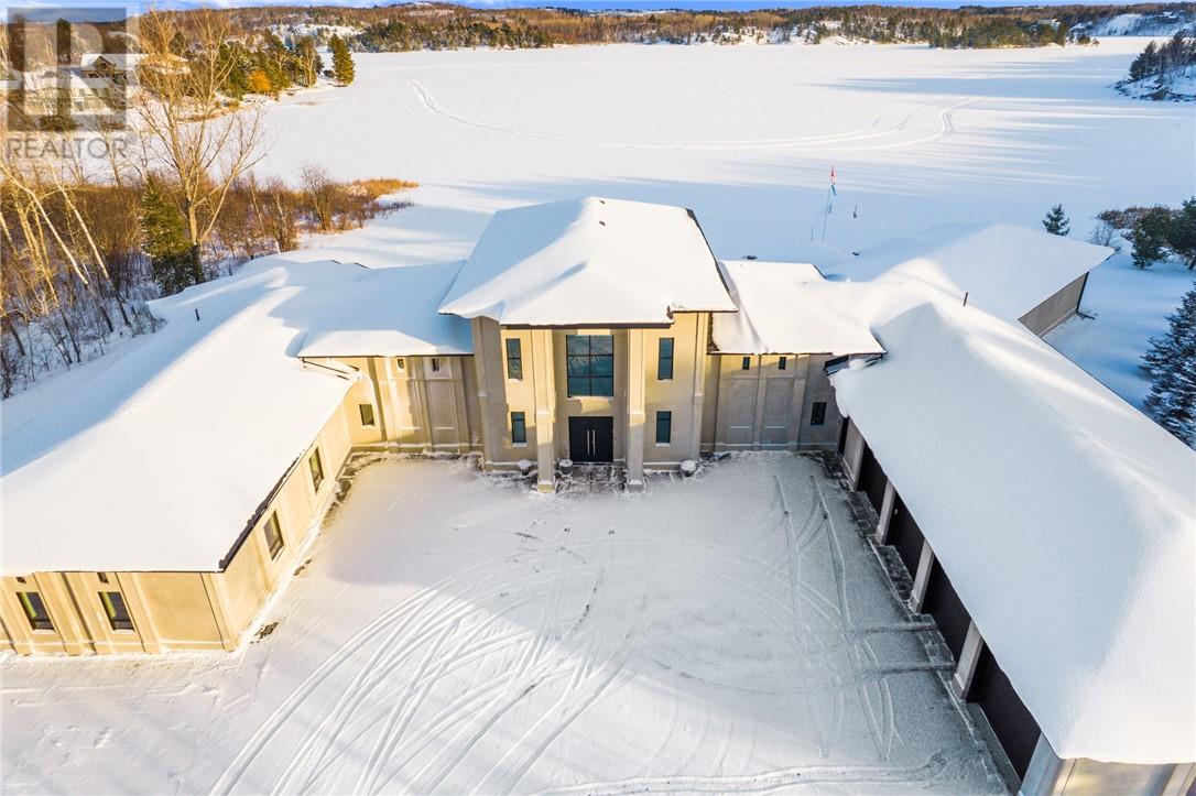 Welcome to 1221 Keast Drive, an extraordinary 7,900 sq ft, single-level waterfront estate set along the shores of Ramsey Lake. This luxurious property perfectly balances elegance, privacy, and convenience, offering a prime location just a short walk from the Medical School, University, and HSN. Spanning nearly two acres of level land, the estate features an impressive 800 ft of pristine water frontage, including a private 200 ft sand beach. Step inside to the grand great room, where 24 ft ceilings and expansive floor-to-ceiling windows flood the space with natural light and provide stunning views of the lake. The gourmet kitchen is a chef’s dream, with 16 ft ceilings, custom cabinetry by Trandz Kitchens, and top-of-the-line commercial appliances. A butler’s kitchen adds functionality, ideal for entertaining or daily use. The home’s layout includes six generously sized bedrooms, three full bathrooms, and two powder rooms. The primary suite serves as a private retreat, offering panoramic views of the lake, a spa-like ensuite and a walk-in closet. A dedicated theatre room with stadium seating offers the perfect movie night experience. The rec room and bar seamlessly lead to an outdoor kitchen, making indoor-outdoor living effortless. Additional features include a laundry room with two washers and dryers, two mechanical rooms housing all essential systems, and a state-of-the-art fire suppression system. The home is constructed with premium Avac Beton architectural panels from Quebec, ensuring durability and style. Designed by renowned architect Roch Belair, this estate is a modern masterpiece. A 1,800 sq ft heated garage provides ample storage for vehicles and equipment. An invisible fence provides security for pets, while two large humidifiers maintain balanced indoor humidity levels during the winter months. 1221 Keast Drive represents a rare opportunity to own an architectural gem in one of Sudbury’s most prestigious and sought-after locations. (id:61201)