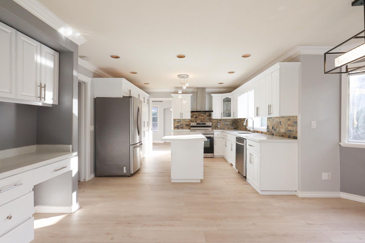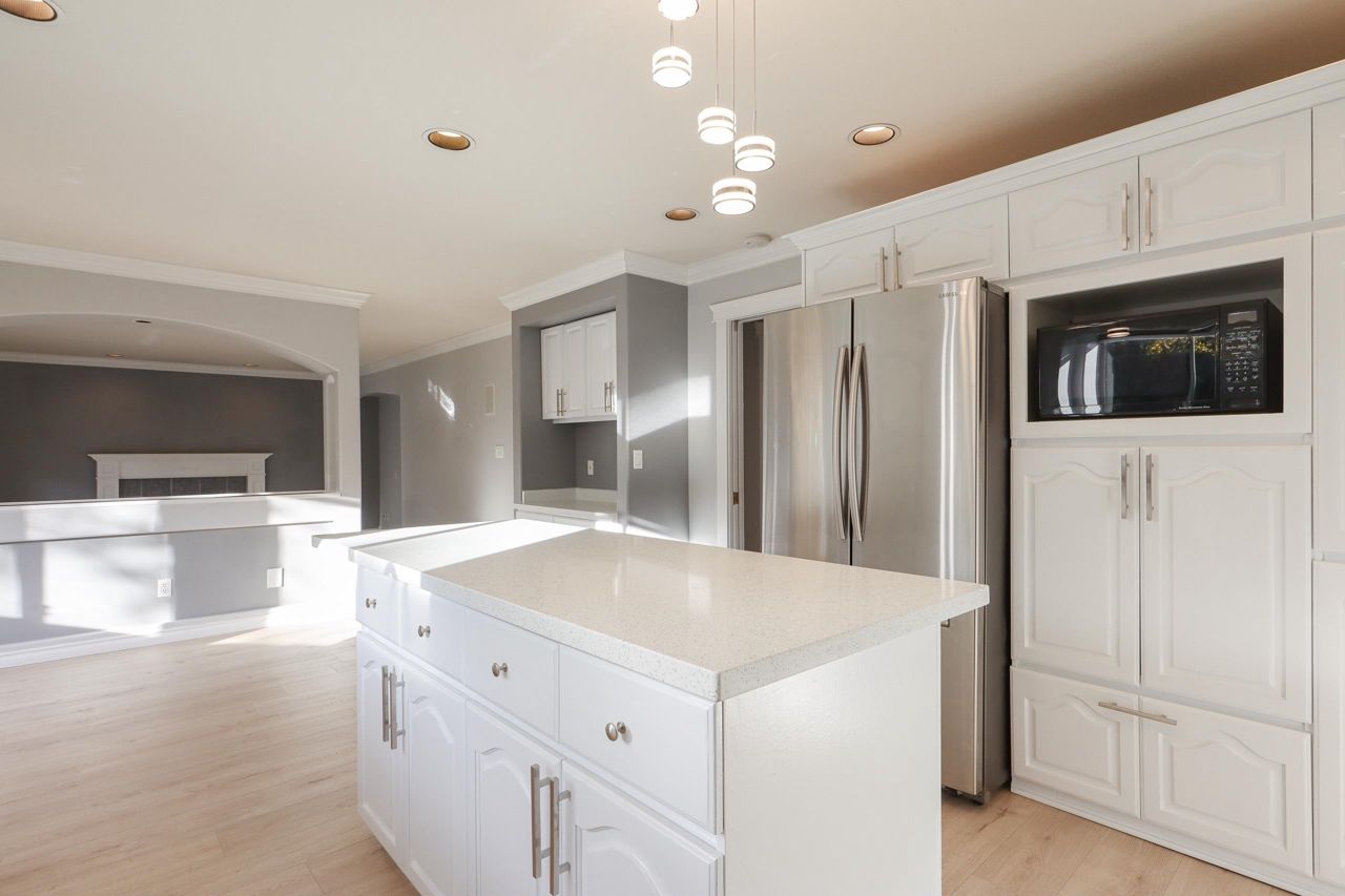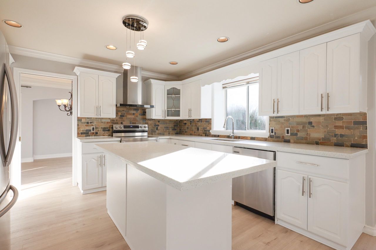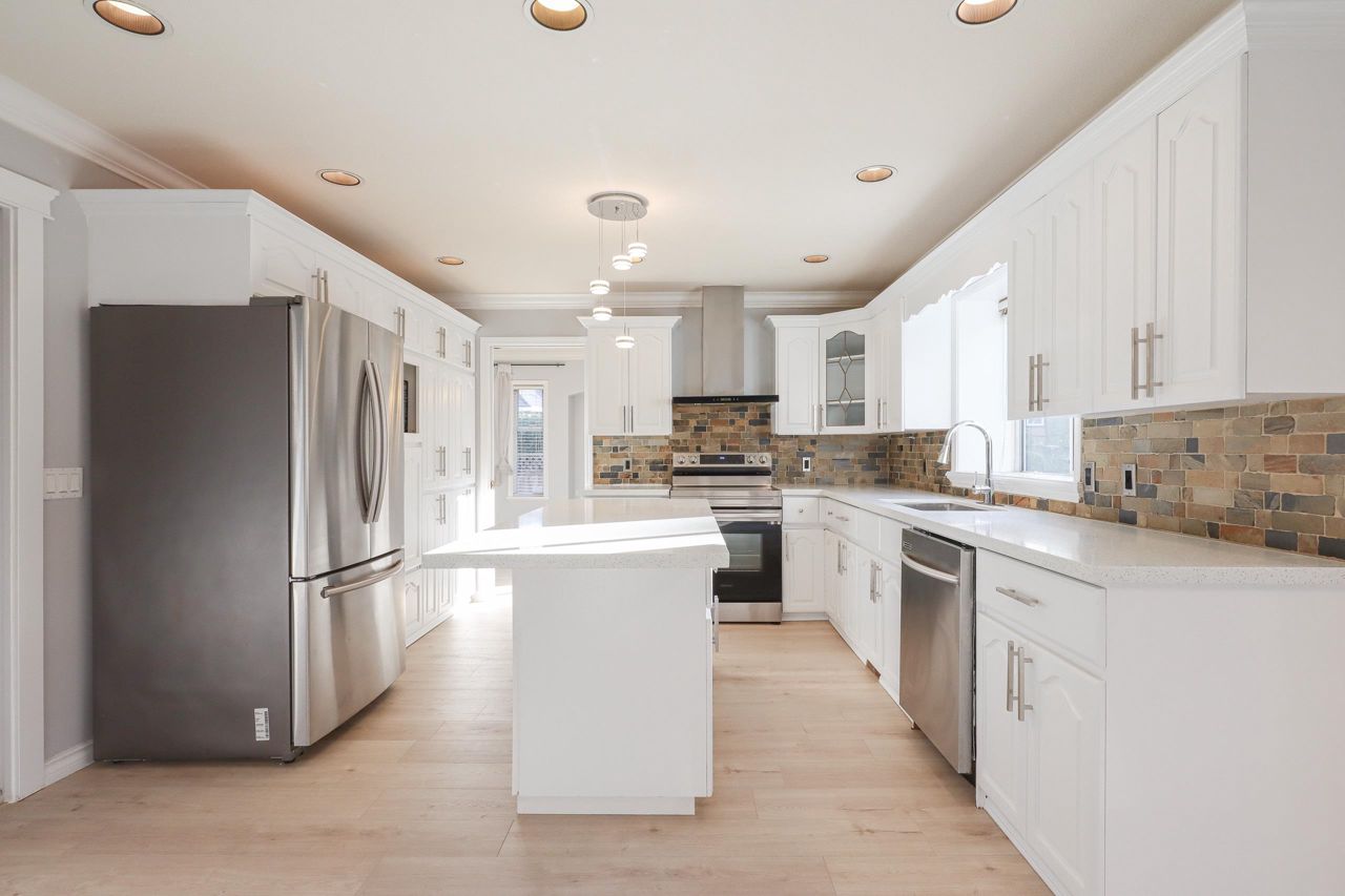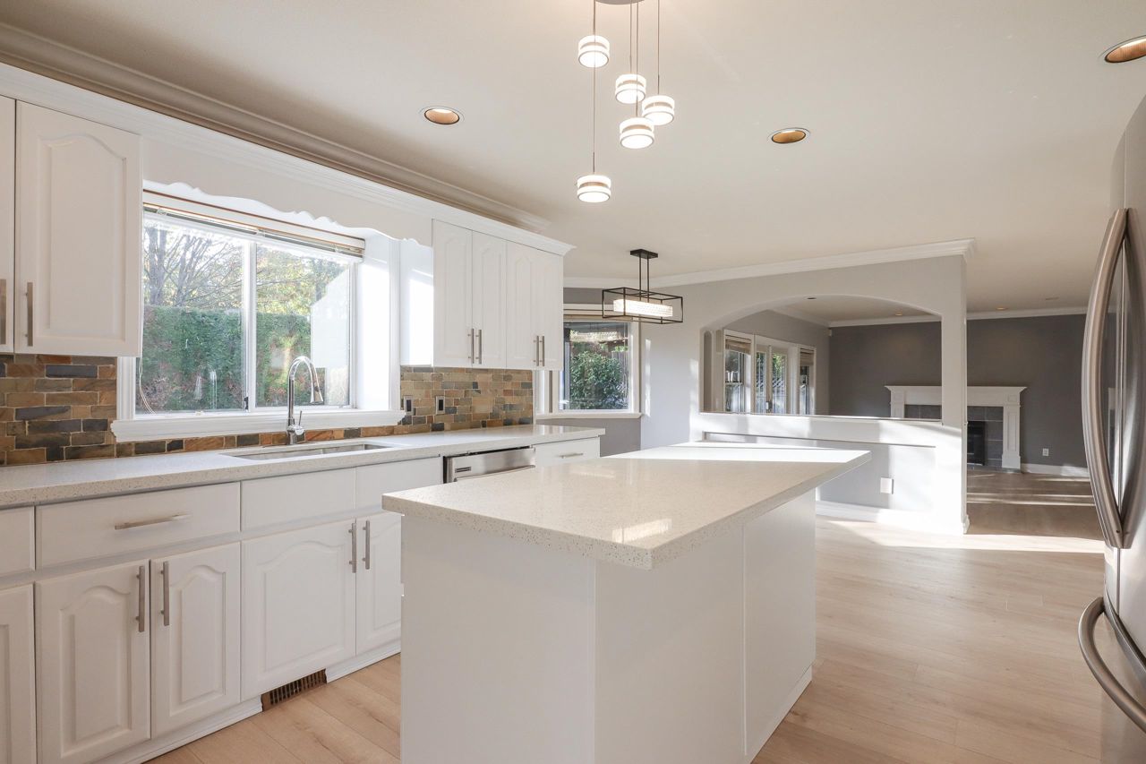 Welcome to your Move-in Ready Home nestled on a 7760 sqft lot in the heart of Fraser Heights! This extensively renovated 2 storey home offers 3 bed & 3 bath. New granite countertop in kitchen and bathroom; new German made flooring throughout; new paint inside and out; new sod grass; new hot water heater and 4 year old roof with warranty and extra insulation. Cabinets are also redone/refinished with newer appliances. 1 den/bedroom on main, elegant living & dining with fireplace, eating area with bay windows, sunken family room with additional fireplace, and spacious laundry room with sink. South facing backyard with pond & patio. 3 more bedroom above. This home offers unparalleled convenience to schools, parks, shopping, and easy highway access. Your dream home awaits!