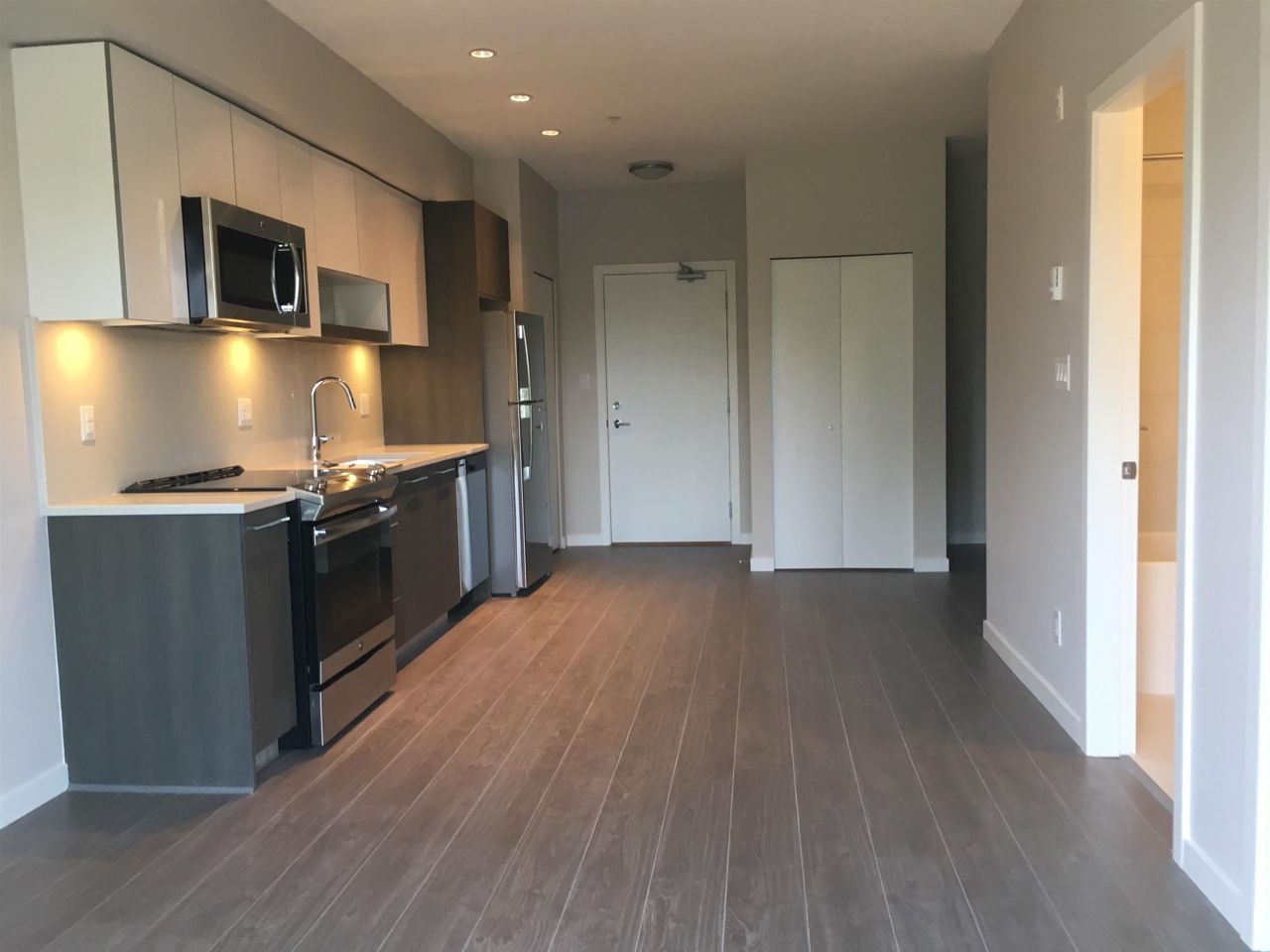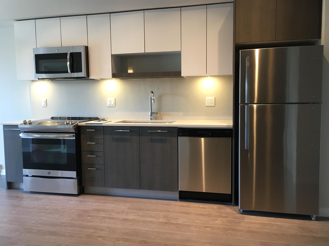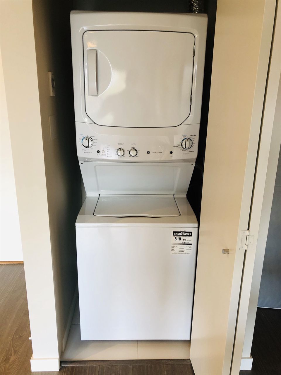 Situated on the fourth floor of Venue, a well-built wood frame building, awaits a well maintained rarely available one bedroom and den overlooking a grassy breezeway. Wide plank laminate floors throughout, with carpet in the bedroom this home offers a modern feel. The sleek GE appliance package and quartz countertops only add to the modern aesthetic of this unit. The bathroom offers Moen and Duravit fixtures. Stacker washer and dryer are tucked next to the den, off of the kitchen area. High ceilings create a bright and spacious feel. The suite comes with a moveable quartz top island. Call today to book your appointment.